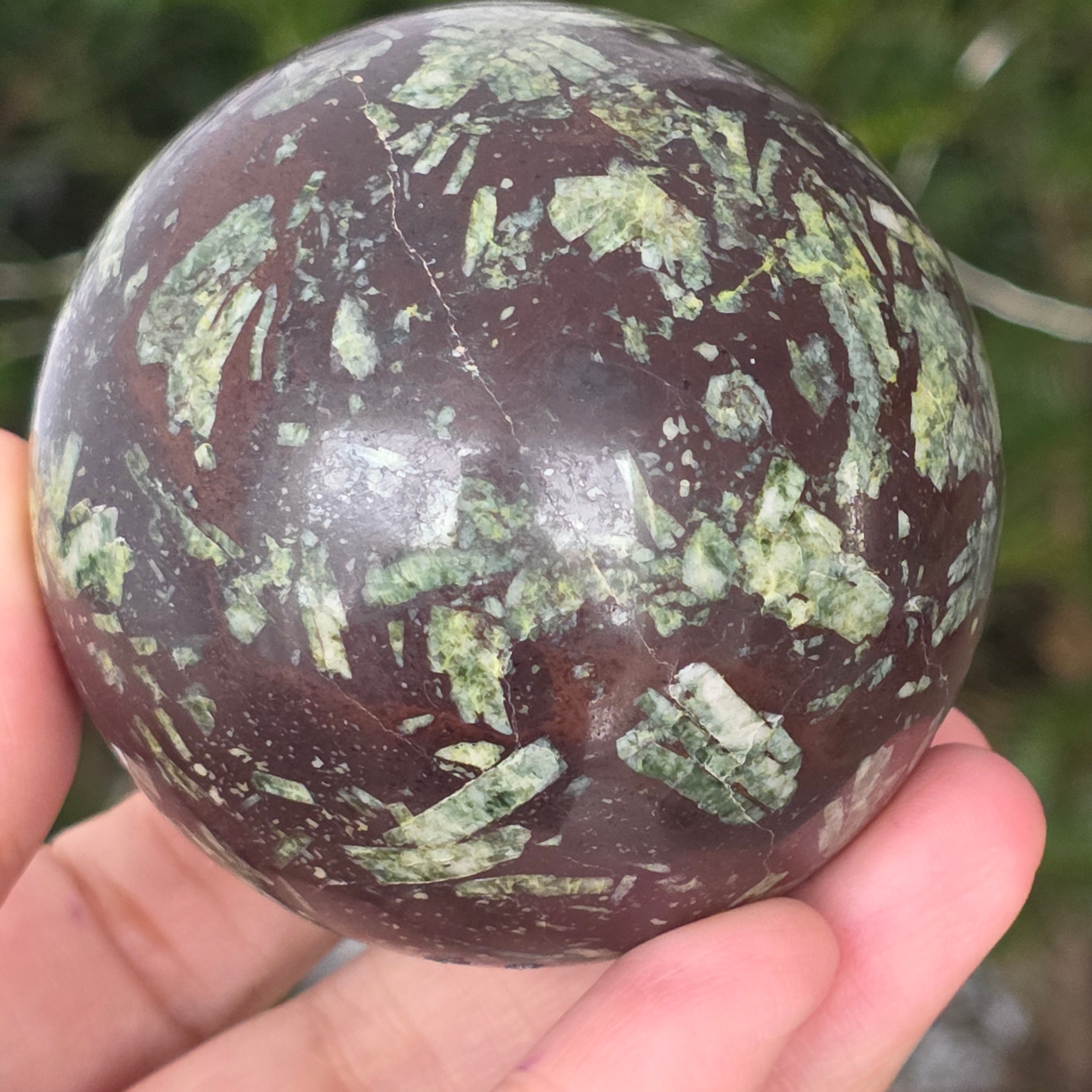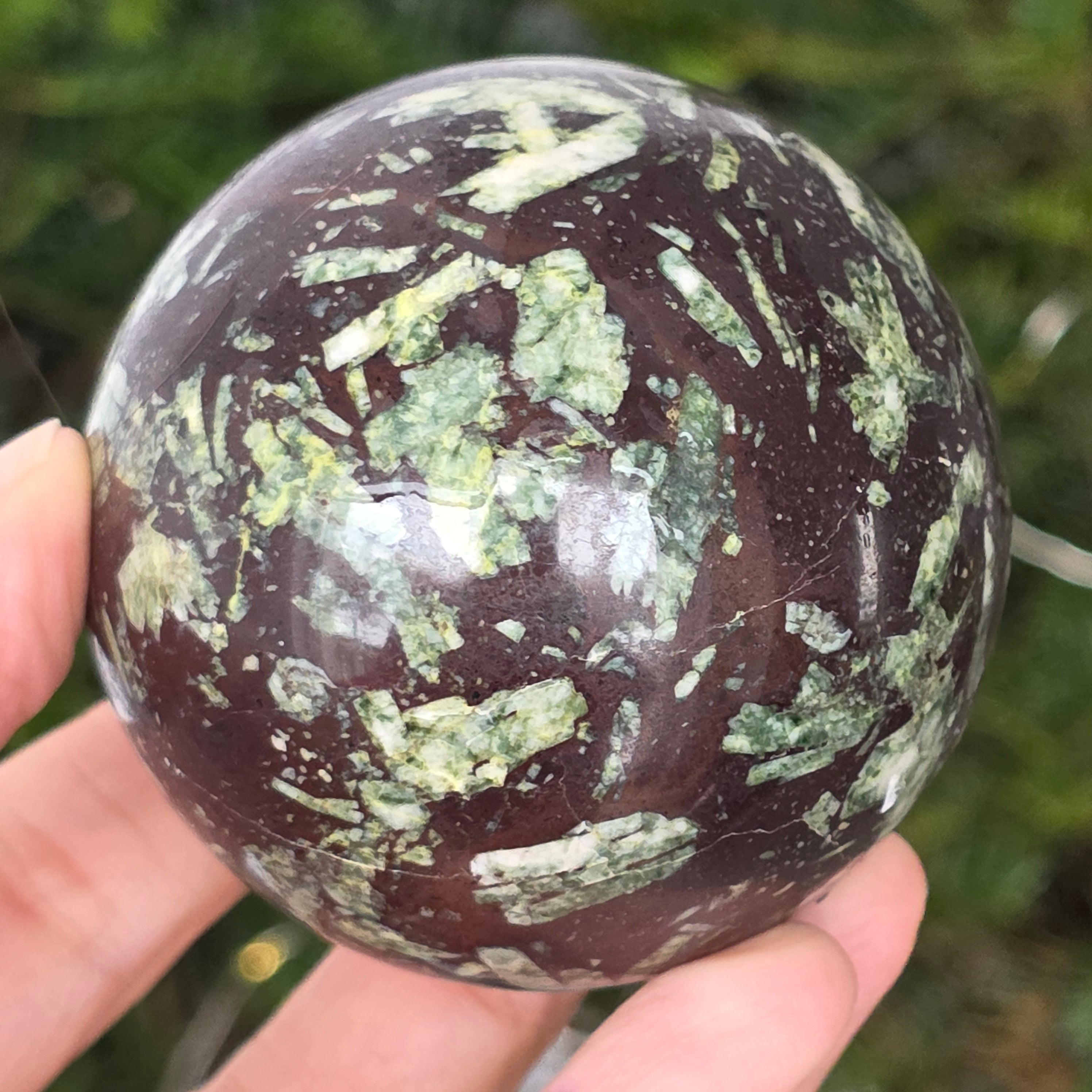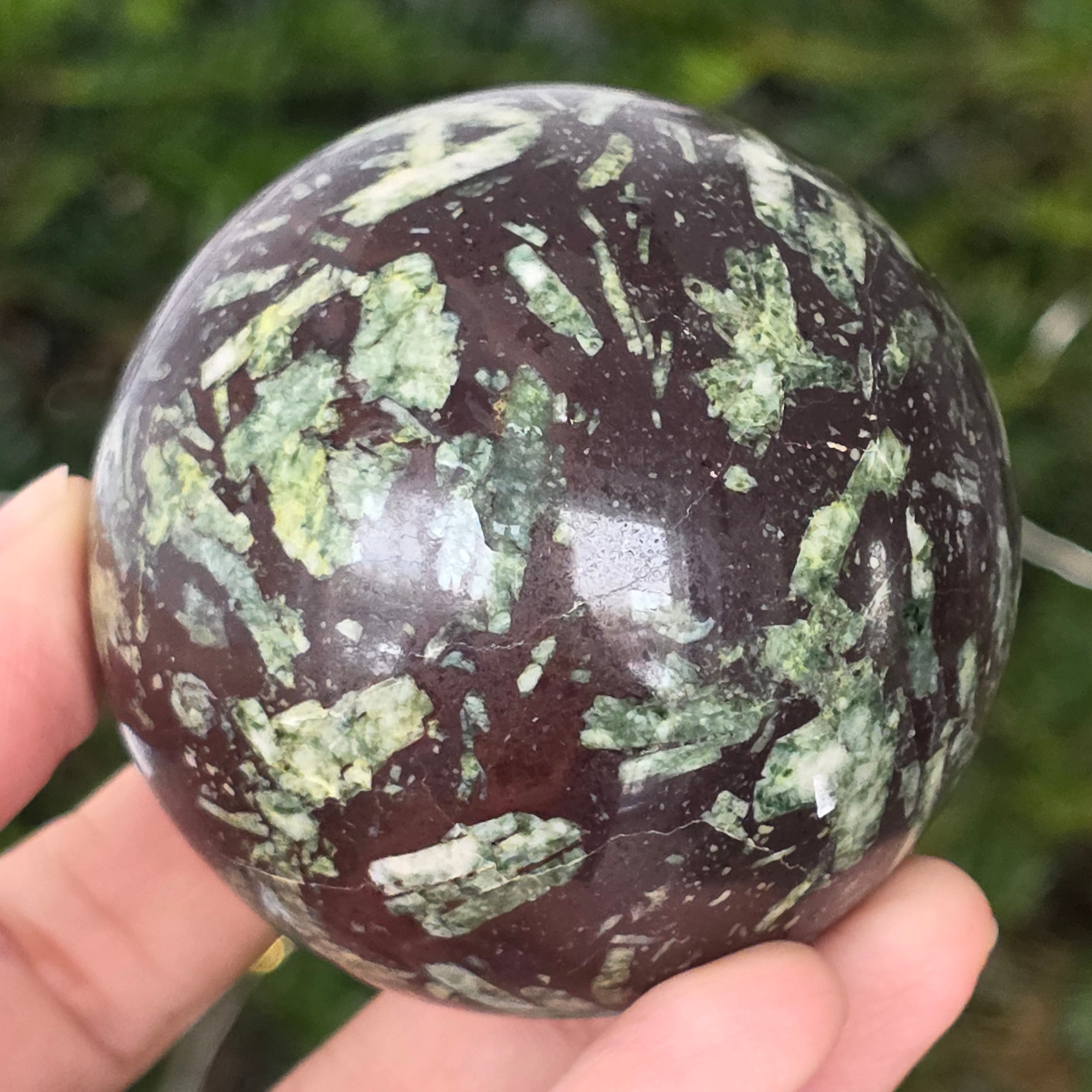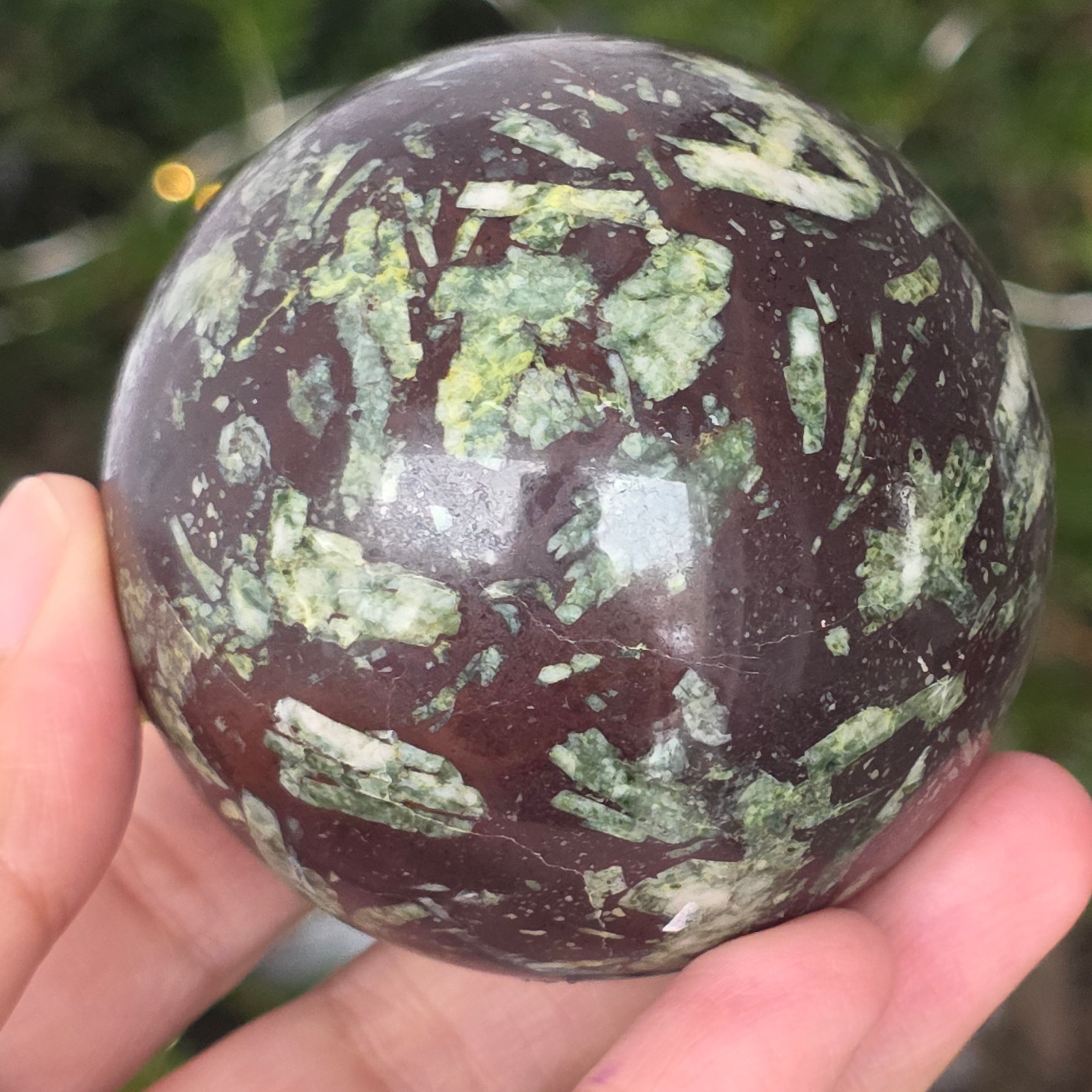 Czarny porforyt z zielonymi plamkami to dekoracyjna skała magmowa o ciemnym kolorze, charakteryzująca się intensywnie czarną matrycą, w której wyraźnie widać małe, zielone kryształy rozmieszczone nieregularnie. Jej kontrastowy i teksturowany wygląd nadaje jej tajemniczy i elegancki charakter, będąc cenioną zarówno w kolekcjach minerałów, jak i w obiektach dekoracyjnych czy okładzinach.