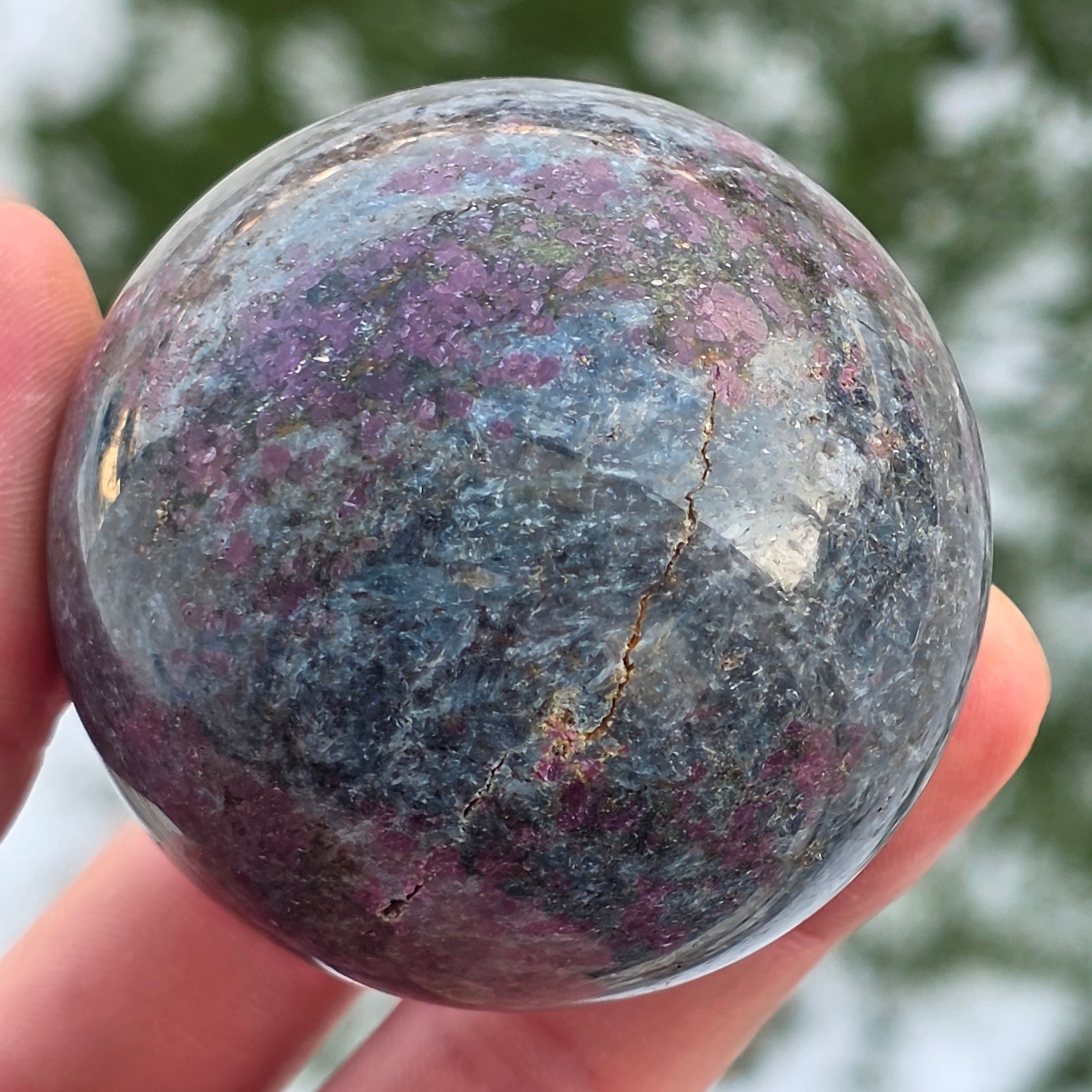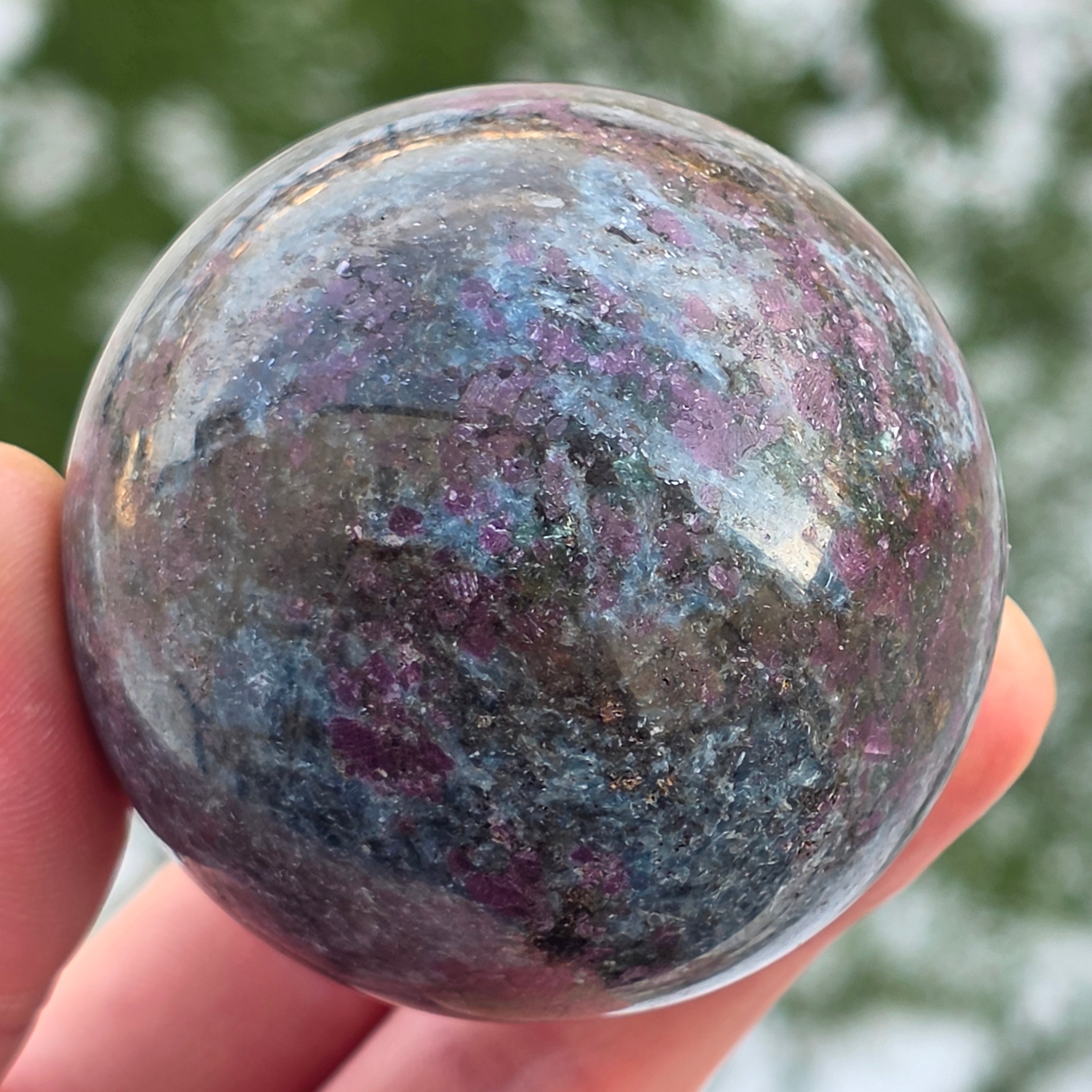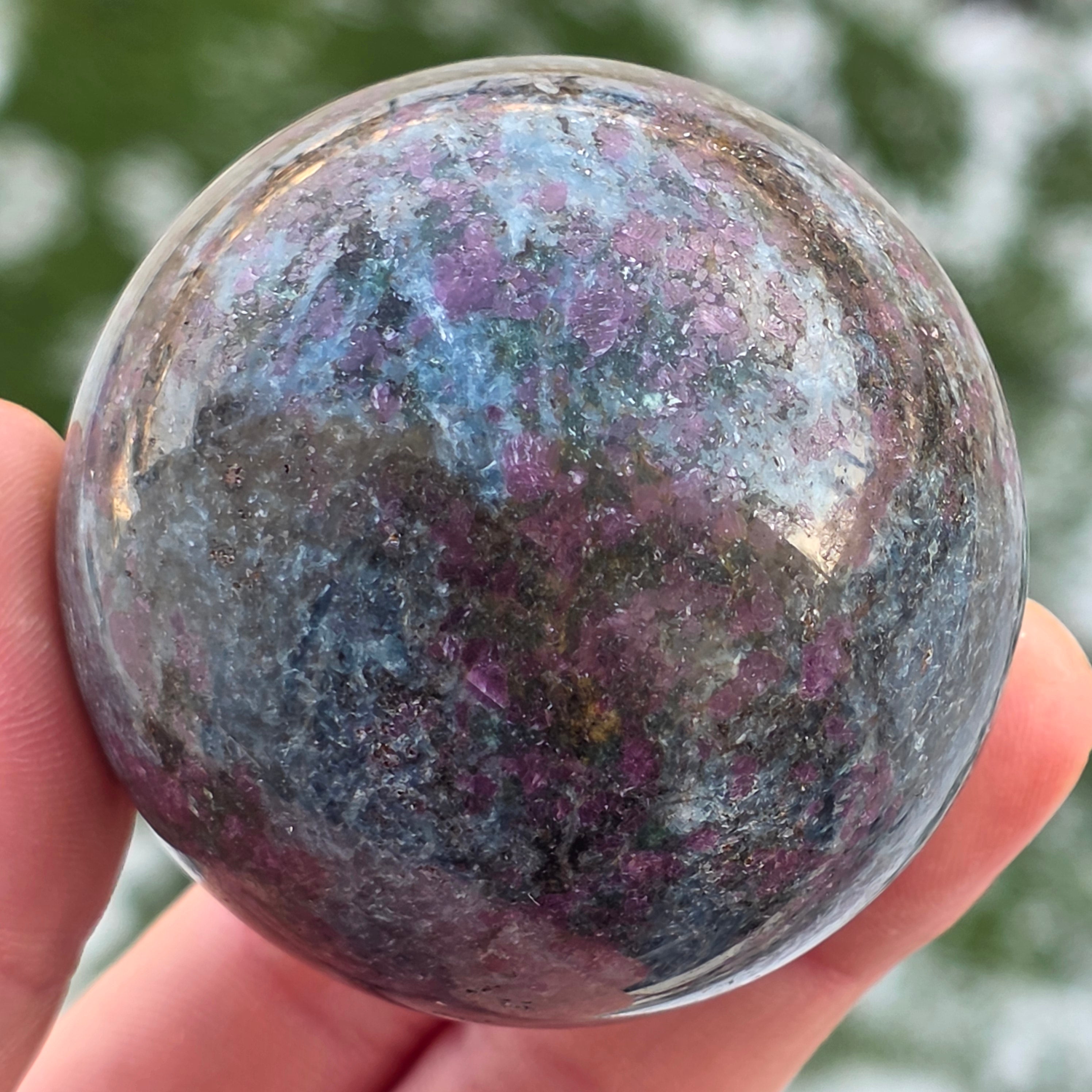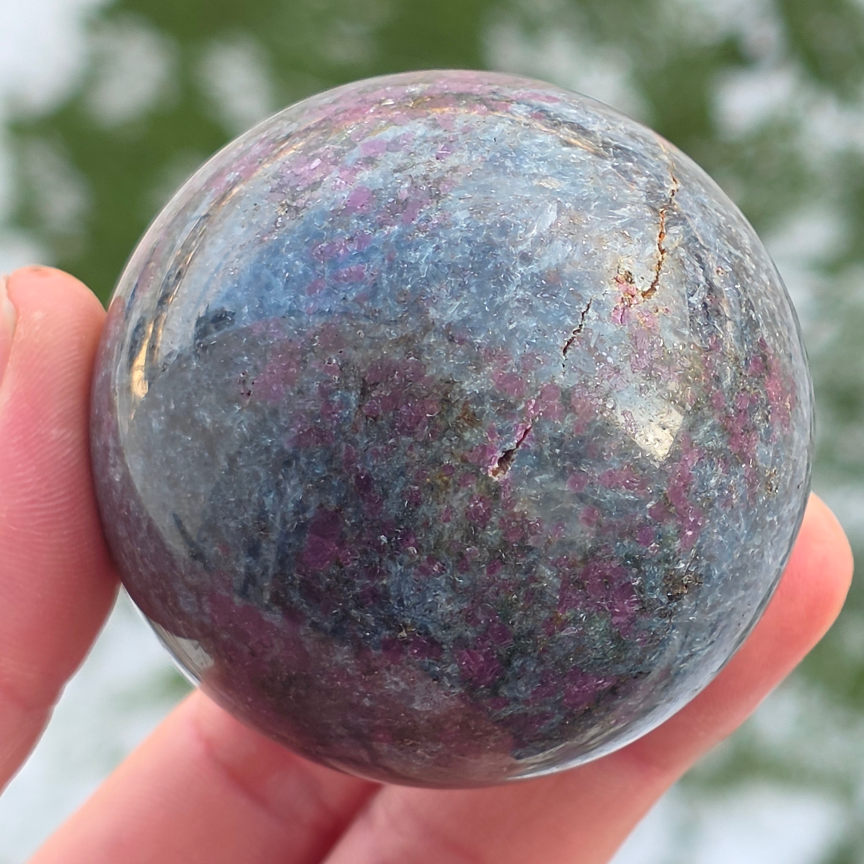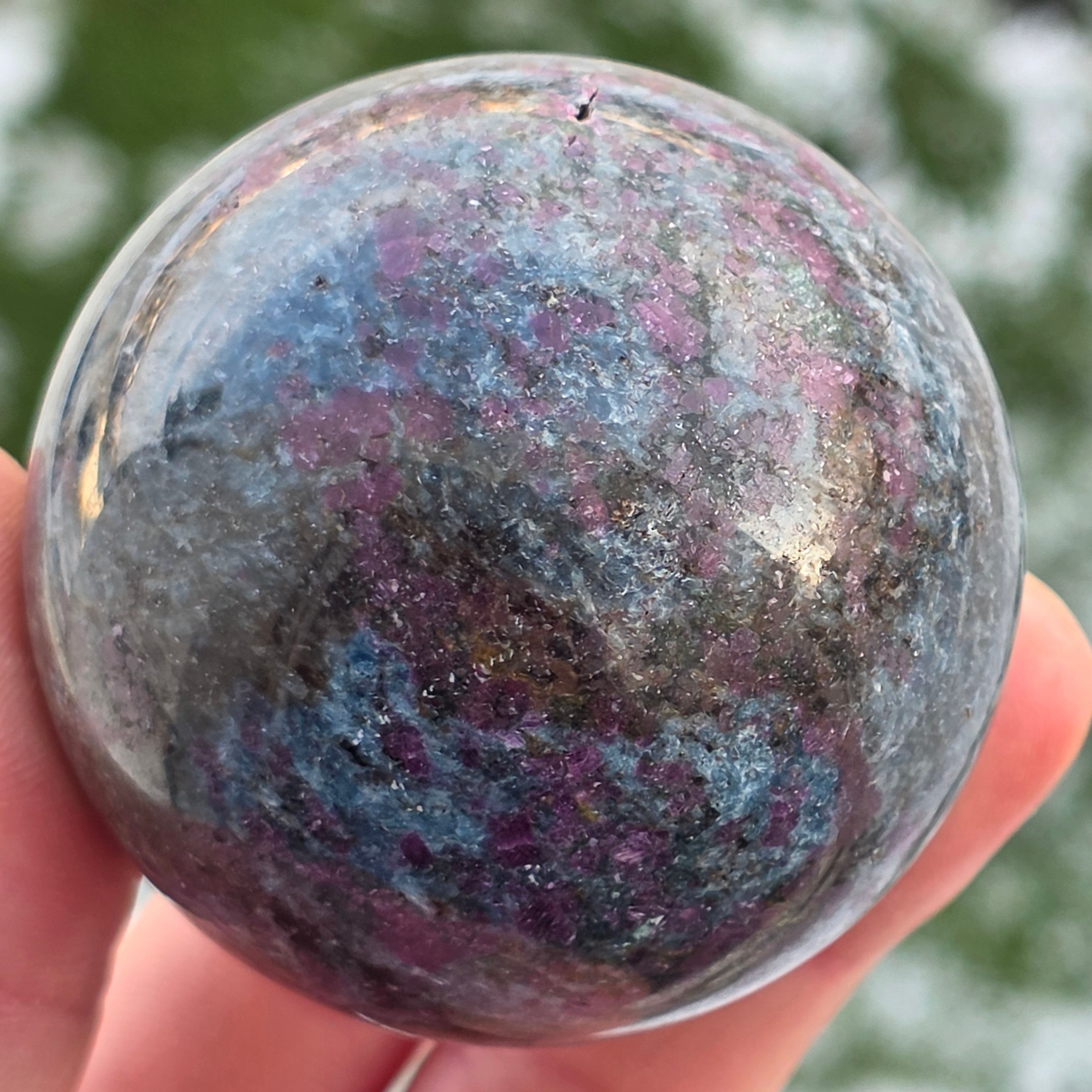 Kula z rubinu w fuchsicie z kianitem łączy trzy komplementarne energie: witalność rubinu, kojący, regenerujący spokój fuchsitu oraz klarowność kianitu. Kształt sferyczny wspiera równowagę między pasją, spokojem a autentyczną ekspresją, będąc kojarzony z harmonizowaniem emocji i wzmacnianiem połączenia między sercem a umysłem.