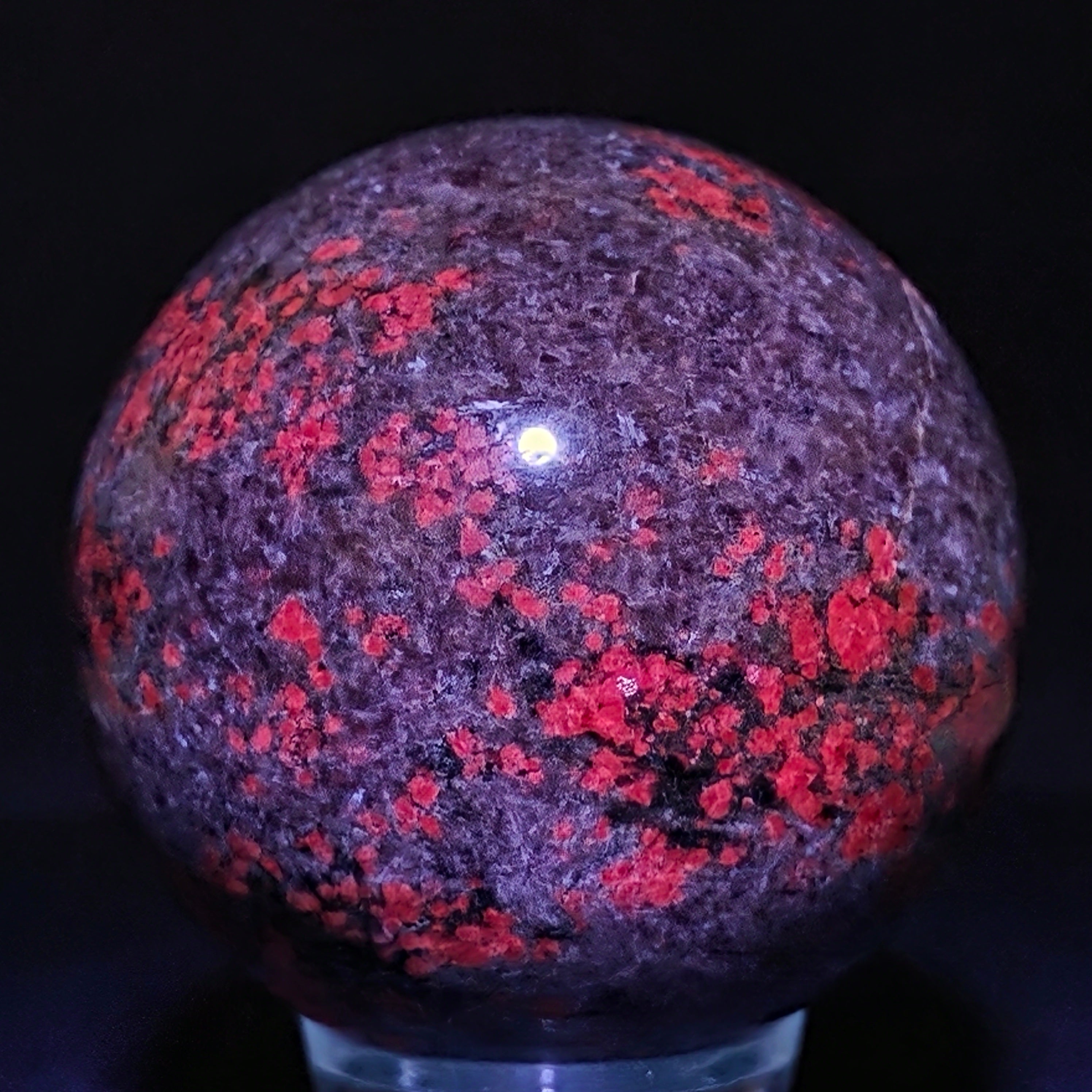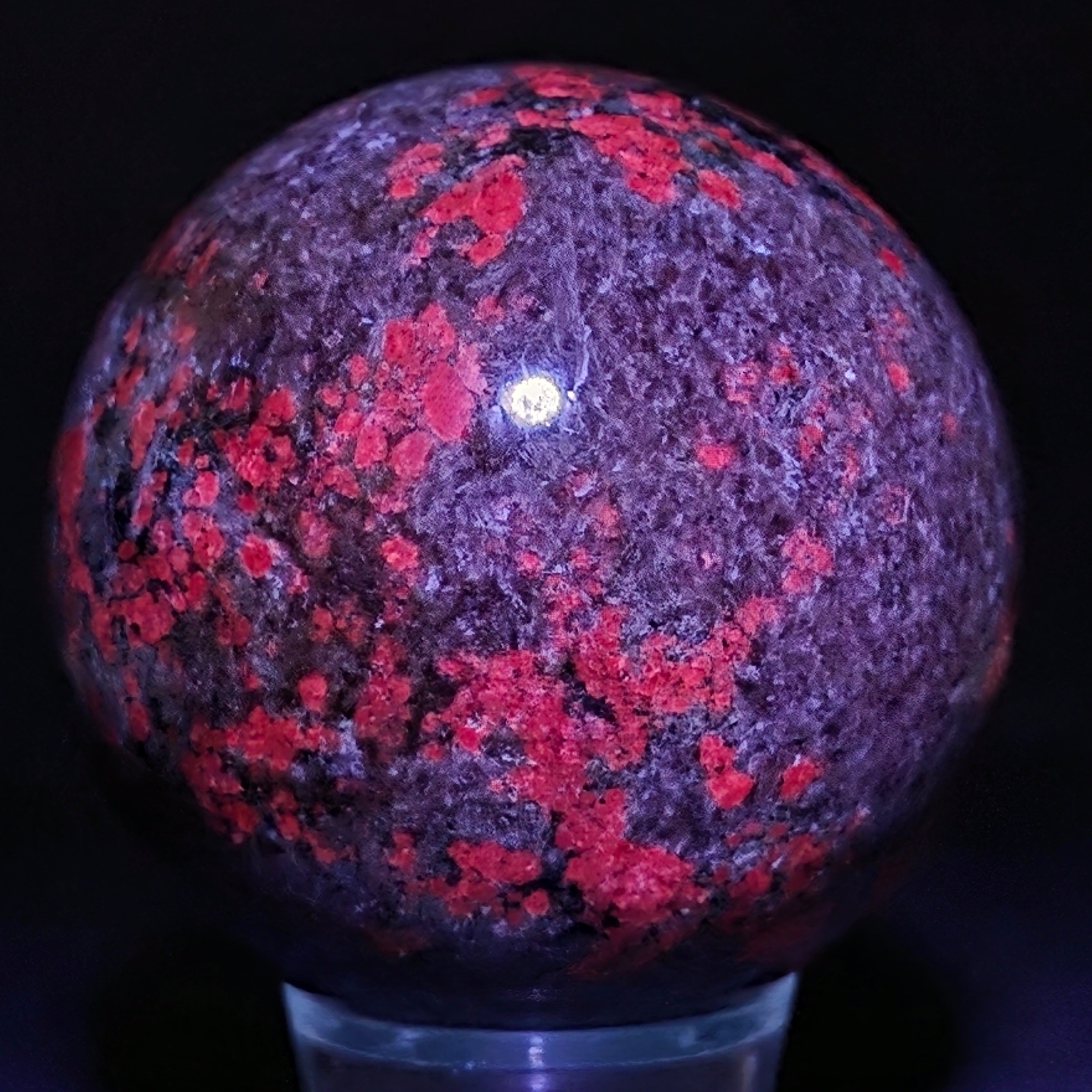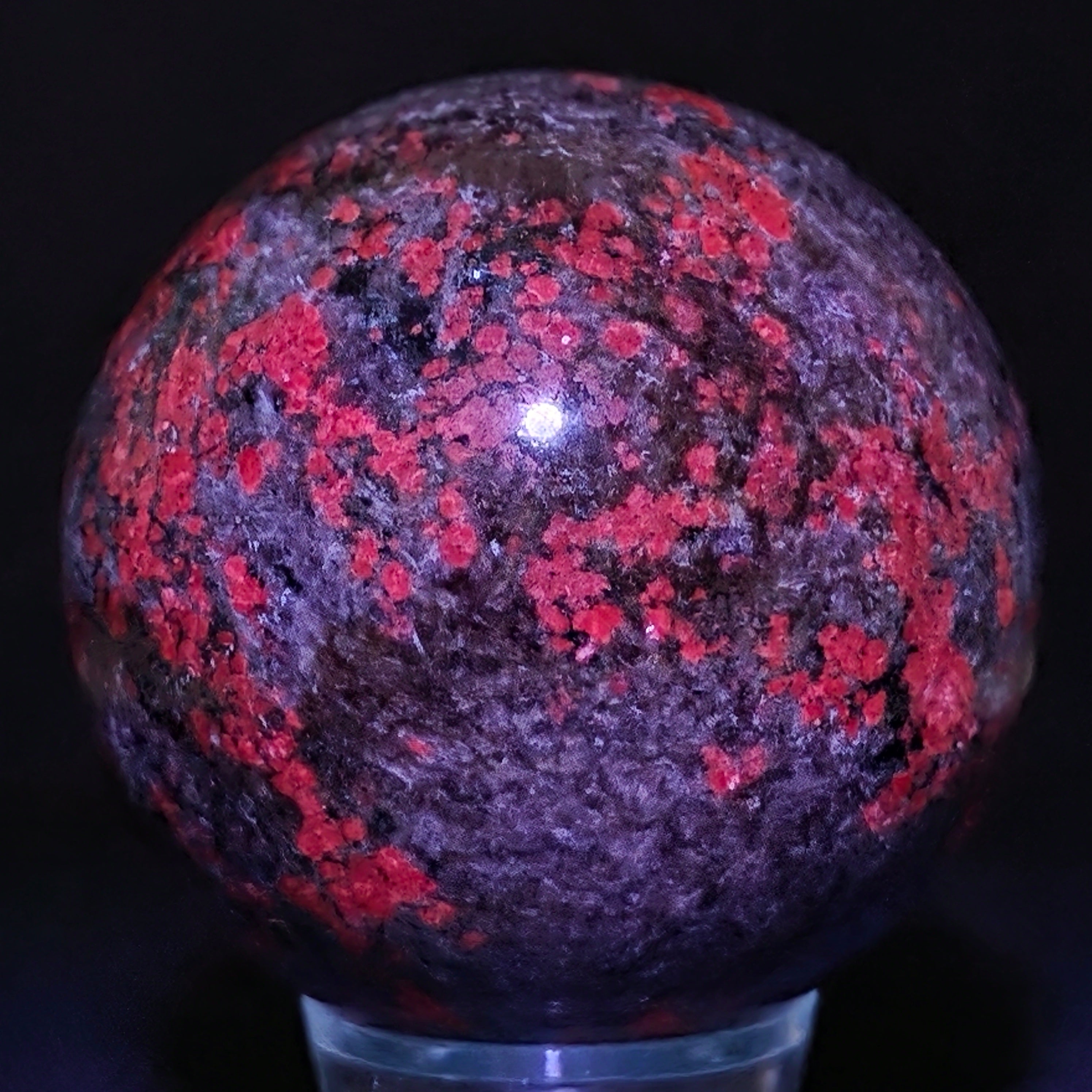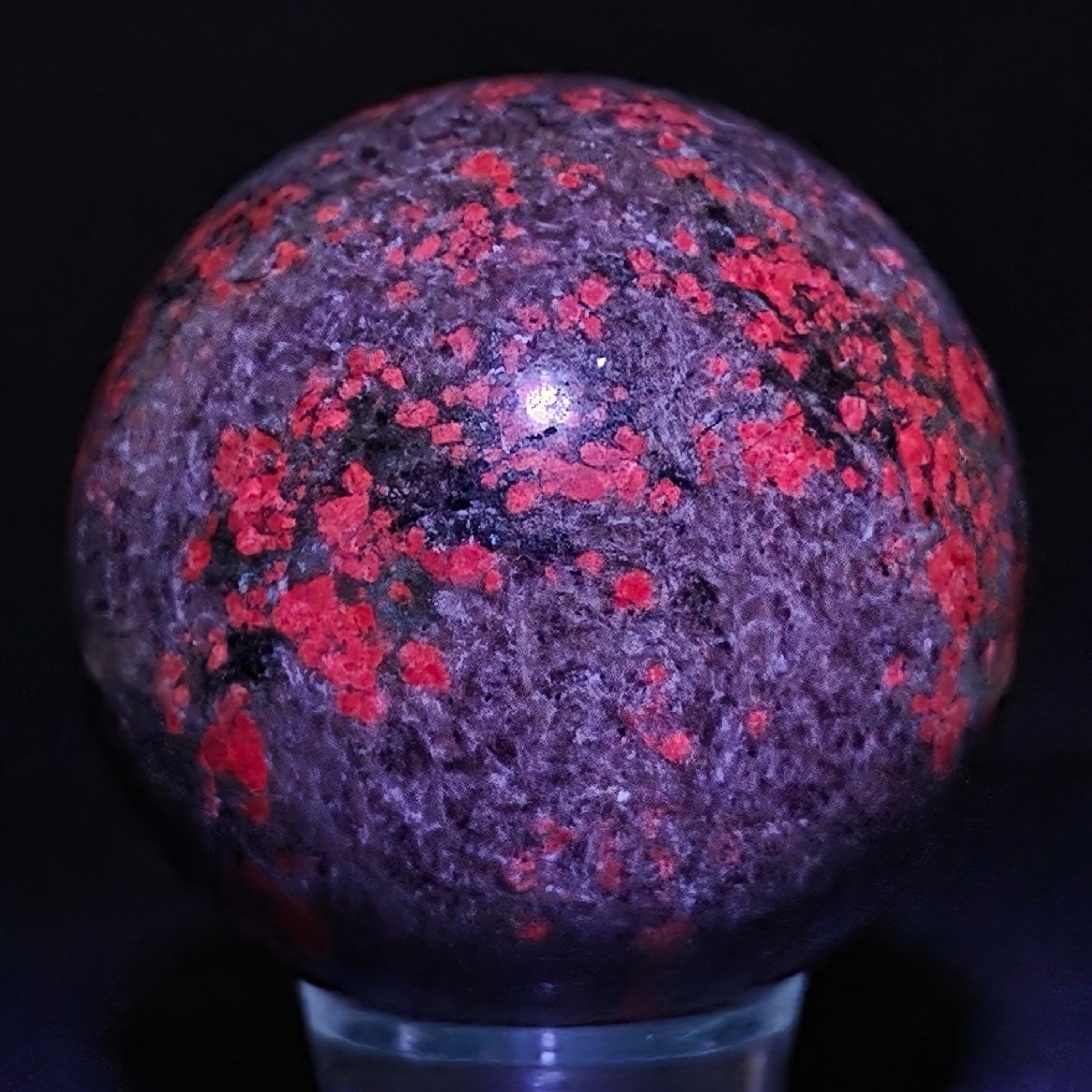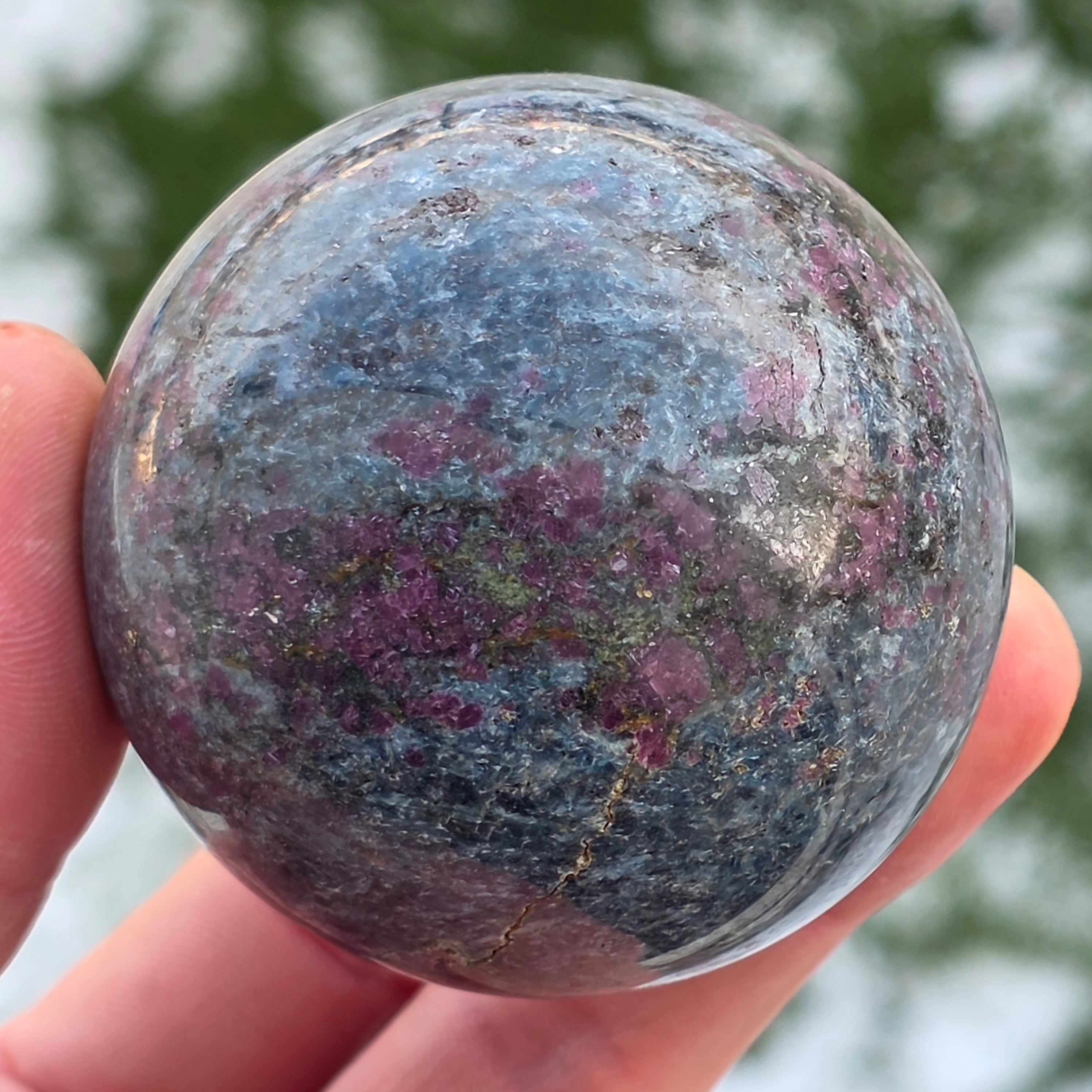 Kula z rubinu w fuchsicie z kianitem łączy trzy komplementarne energie: witalność rubinu, kojący, regenerujący spokój fuchsitu oraz klarowność kianitu. Kształt sferyczny wspiera równowagę między pasją, spokojem a autentyczną ekspresją, będąc kojarzony z harmonizowaniem emocji i wzmacnianiem połączenia między sercem a umysłem.
