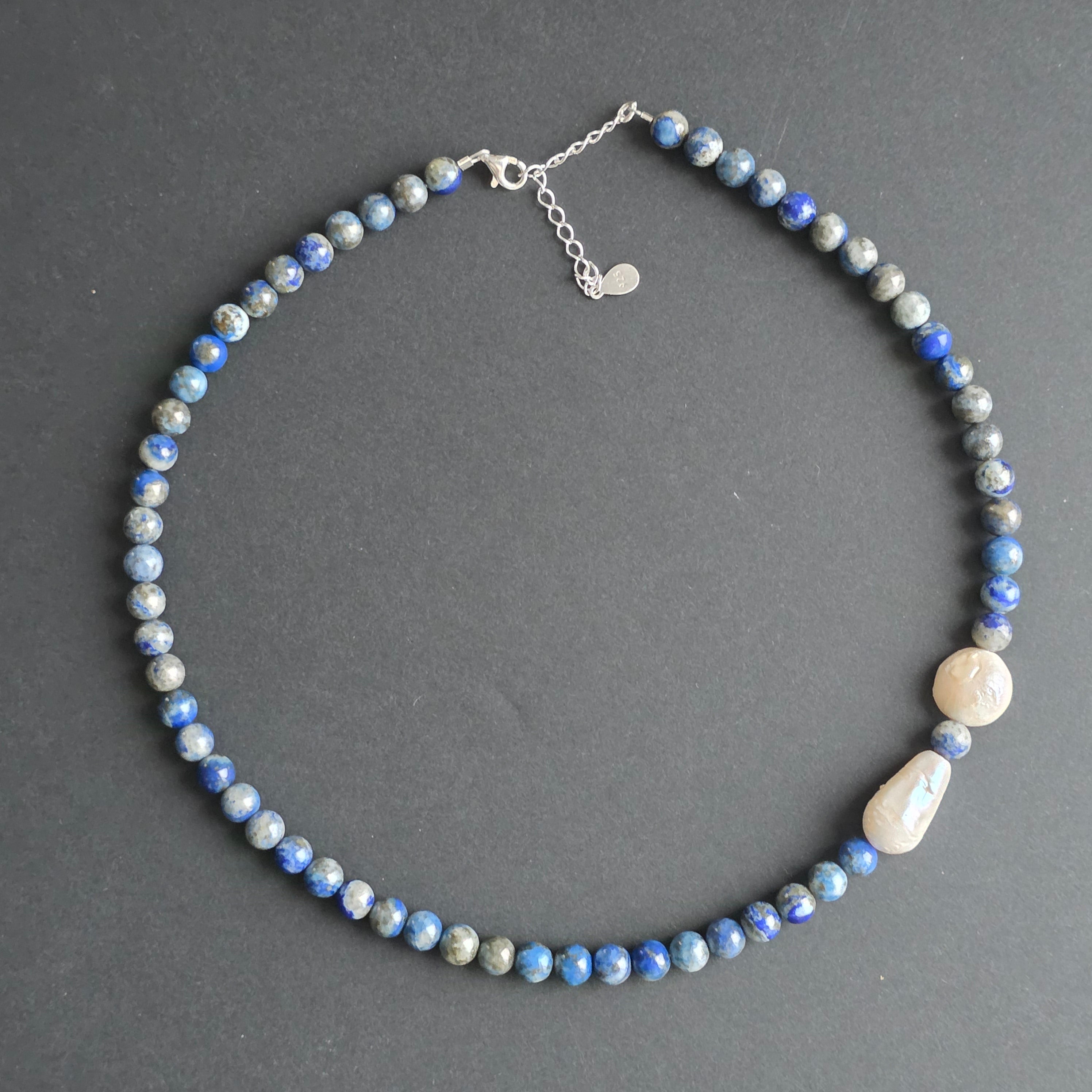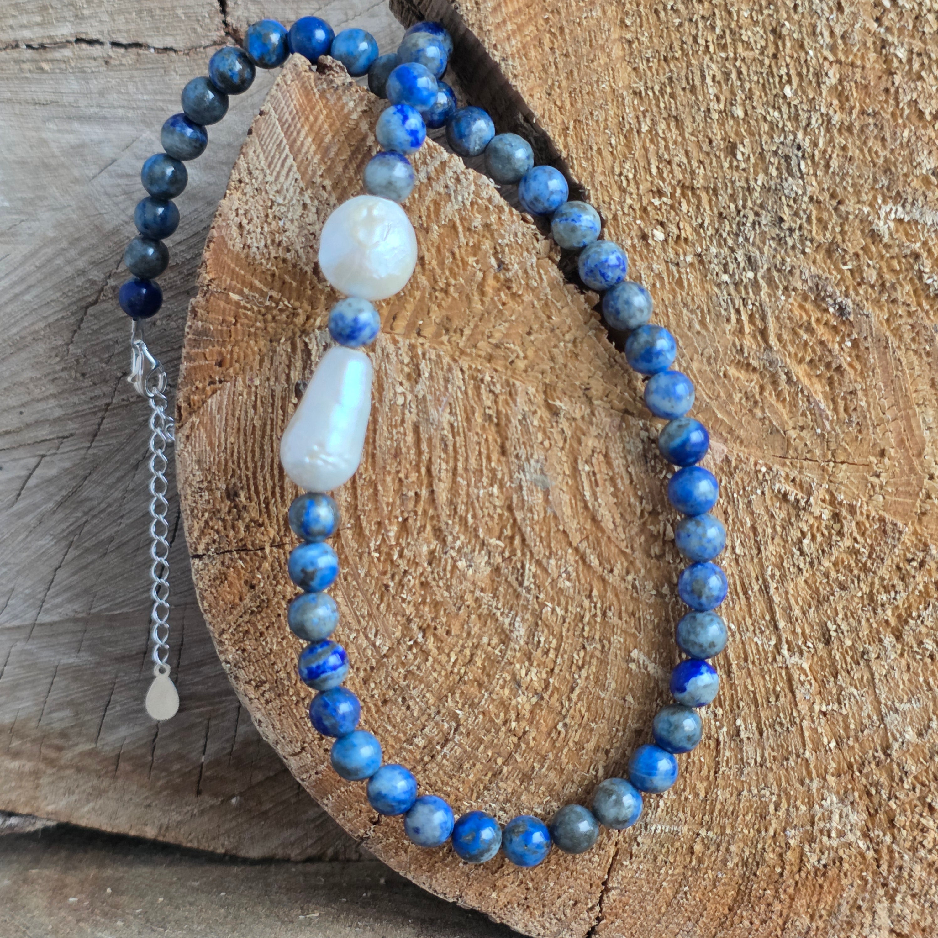 Wykonane z Lapis Lazuli Natural 6 mm, Z głębokimi odcieniami niebieskiego i subtelnymi złotymi odbiciami pirytu, naszyjnik jest uzupełniony Dwie naturalne perły Co dodaje nutę finezji i równowagi. Perły są starannie umieszczane, aby podkreślić naturalne piękno okrążenia i dodać wyrafinowany kontrast.