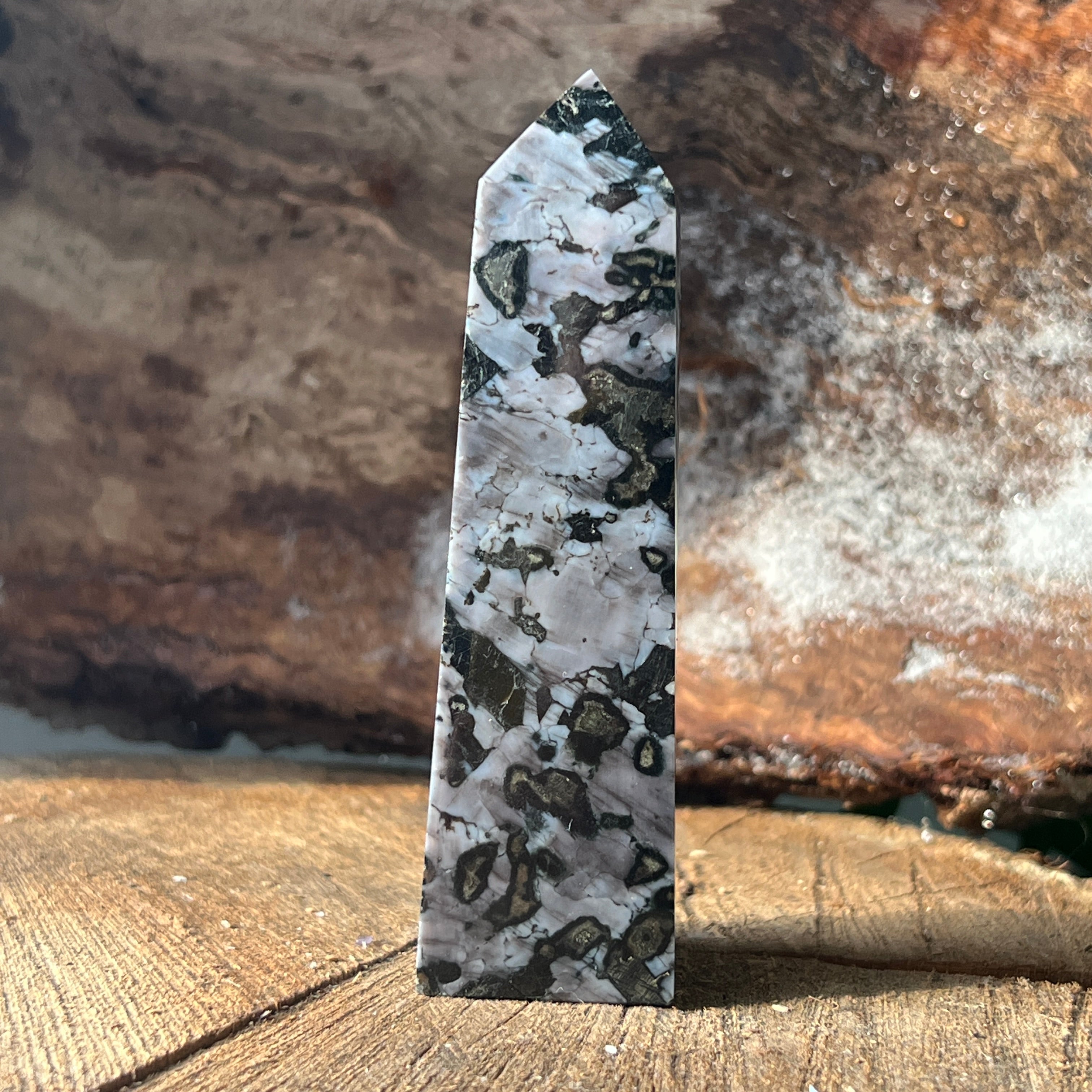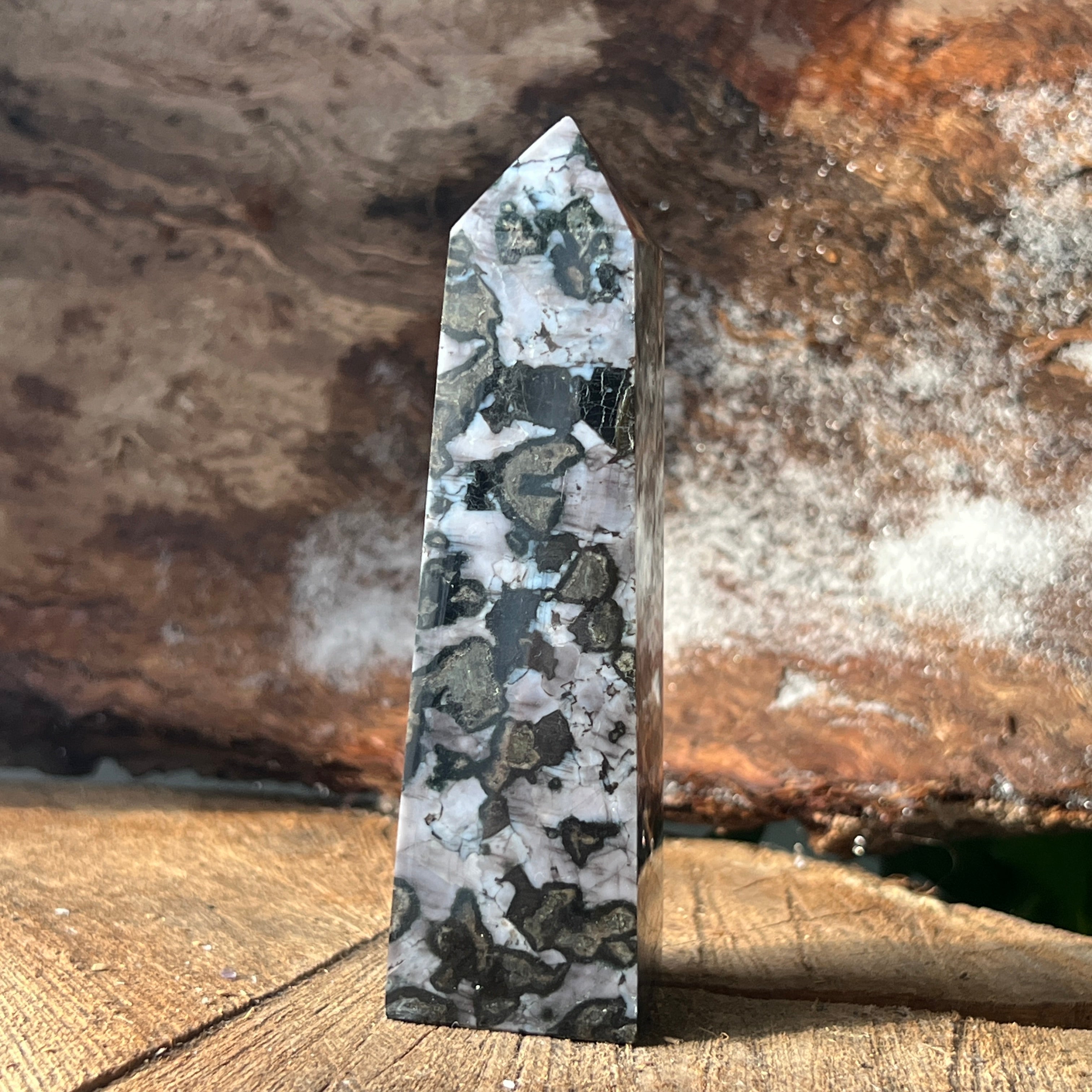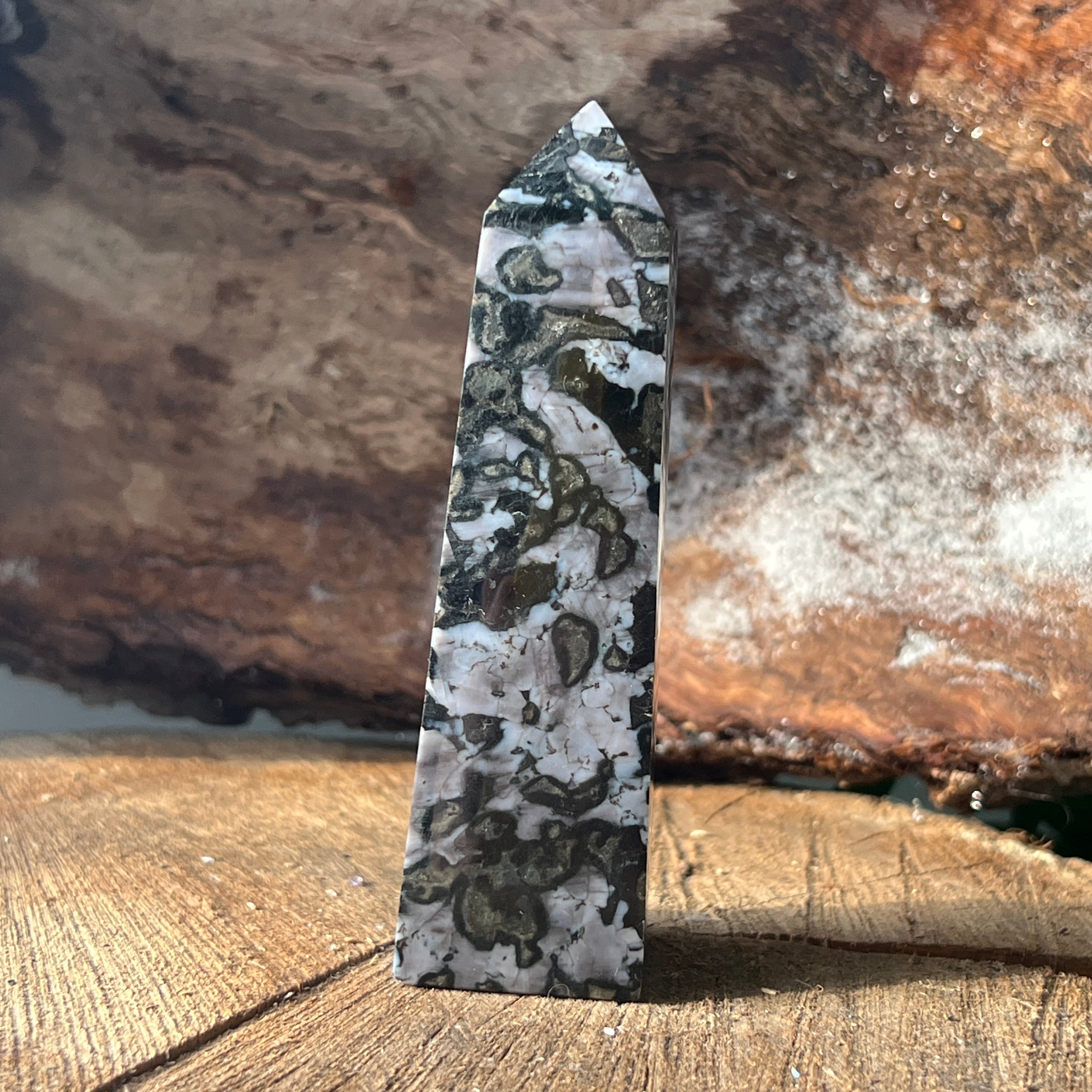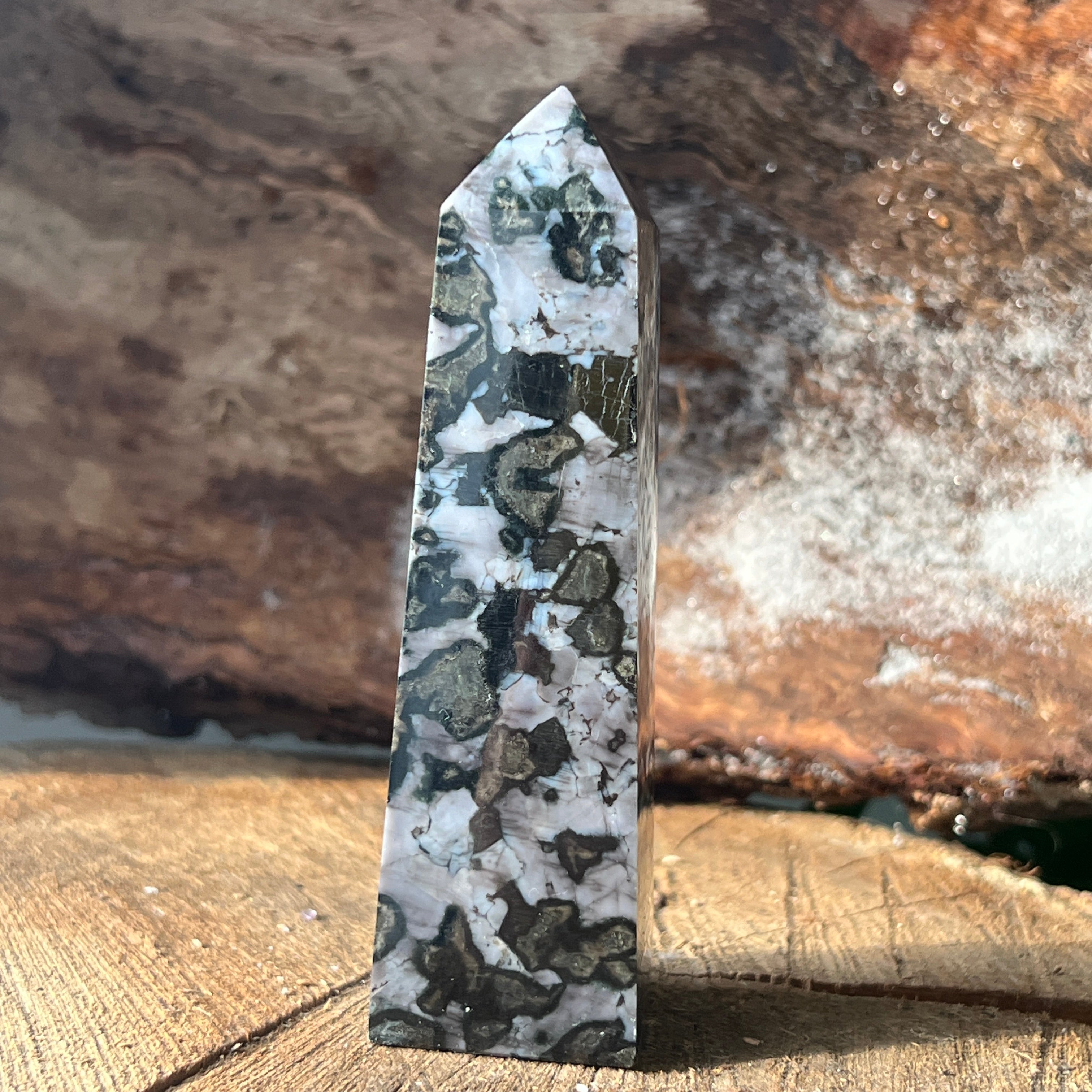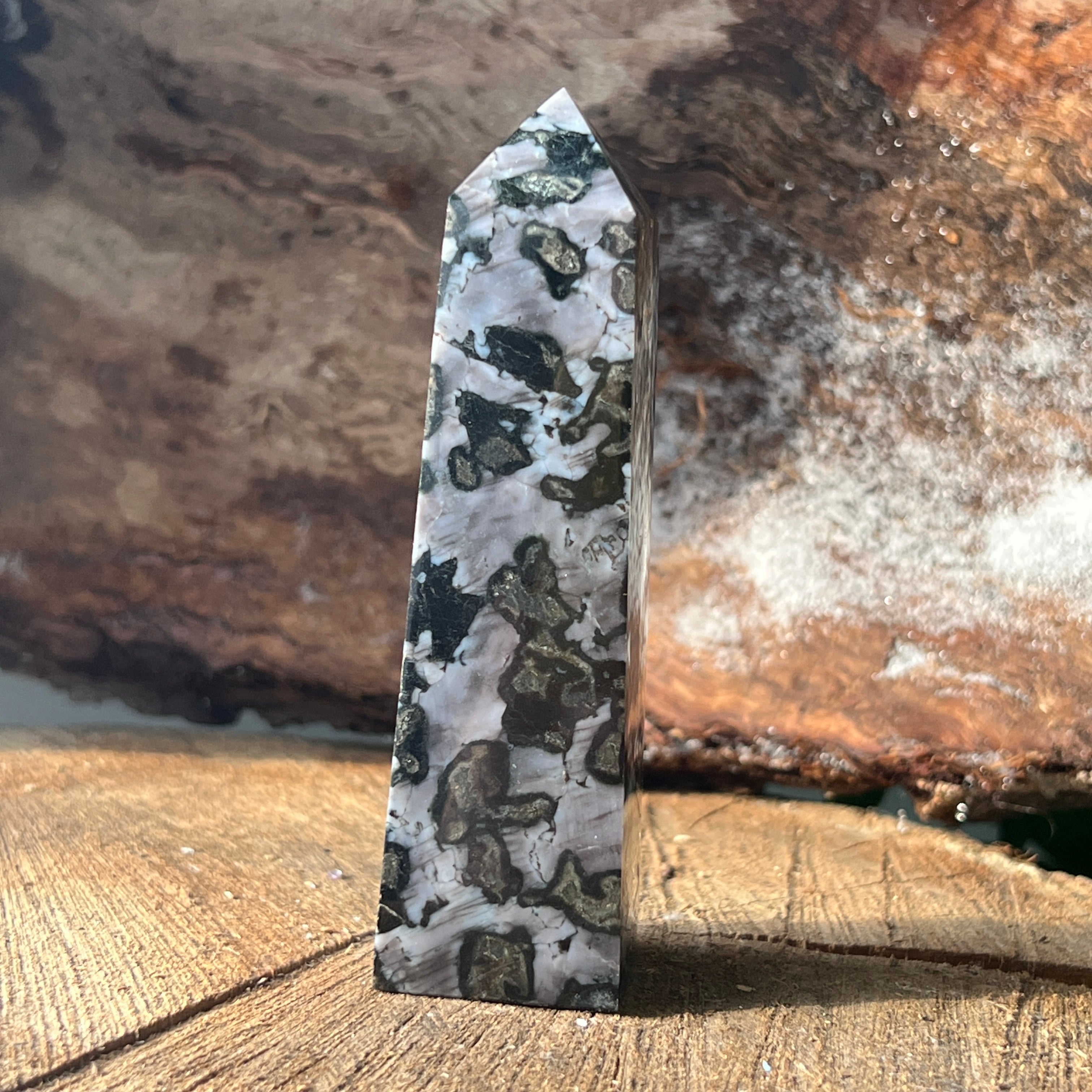 Merlinit to rzadki i fascynujący kamień półszlachetny, znany z połączenia kontrastujących kolorów, czerni i bieli, co nadaje mu niepowtarzalny wygląd. Jest uważany za odmianę opalu dendrytycznego lub połączenie kwarcu i innych minerałów, a jego złożona struktura sprawia, że jest ceniony zarówno za piękno, jak i rzekome właściwości energetyczne. Merlinit jest znany w świecie terapii kryształami ze swoich mistycznych energii i związku z intuicją, jasnowidzeniem i wiedzą duchową.
