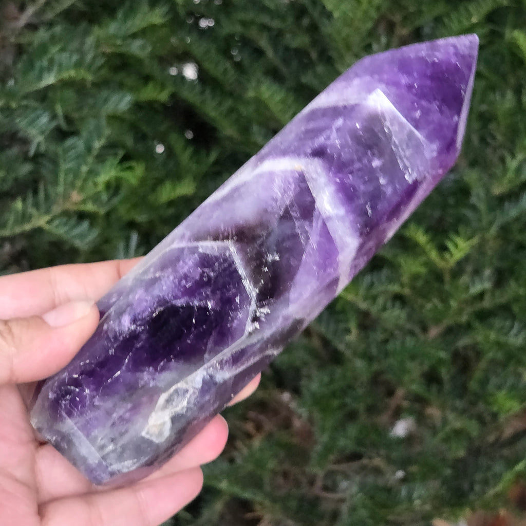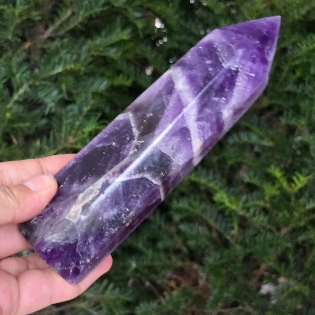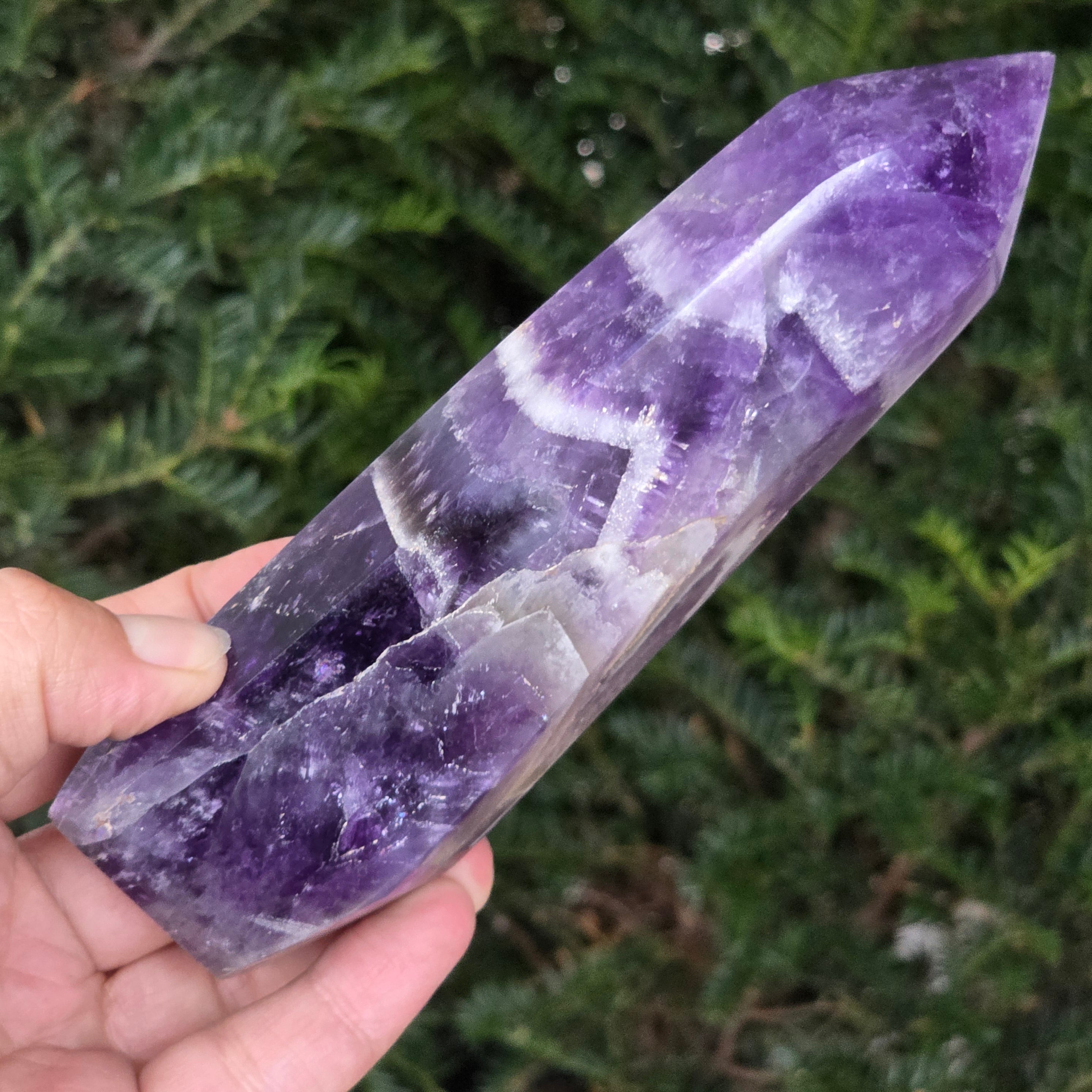 Ametyst Chevron jest znany ze swoich powiązań z czakrami korony i trzecim okiem, zwiększając intuicję i zdolność podejmowania decyzji.