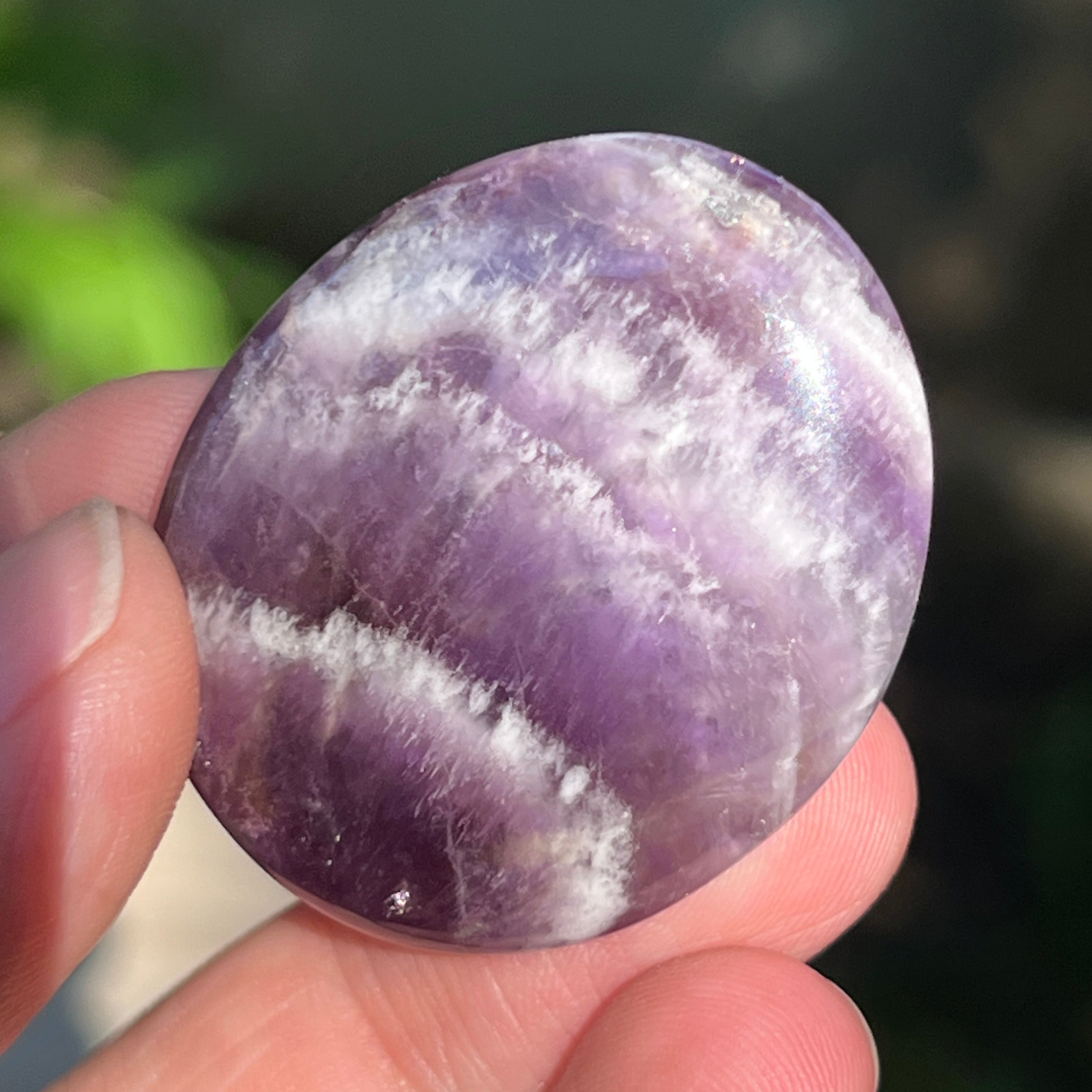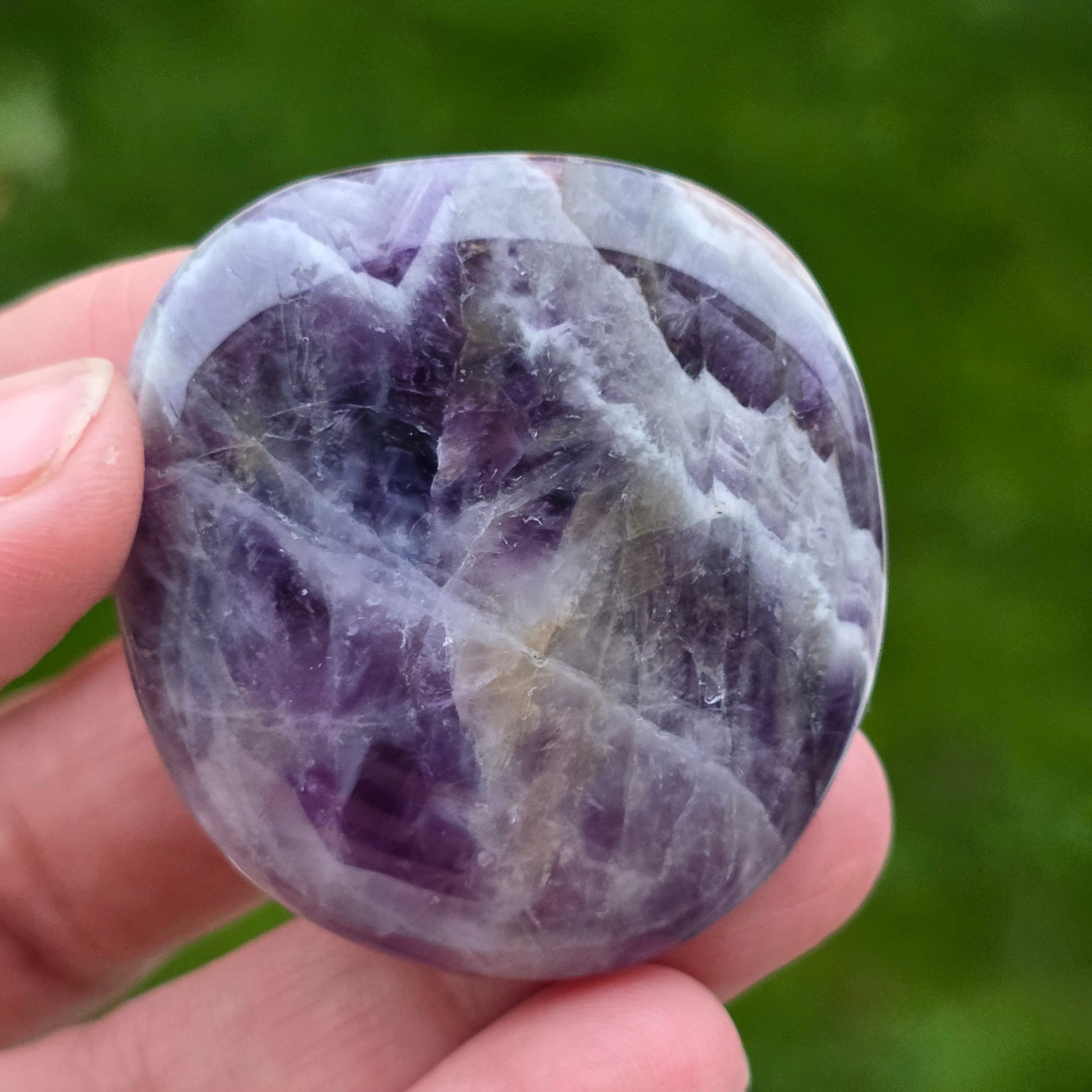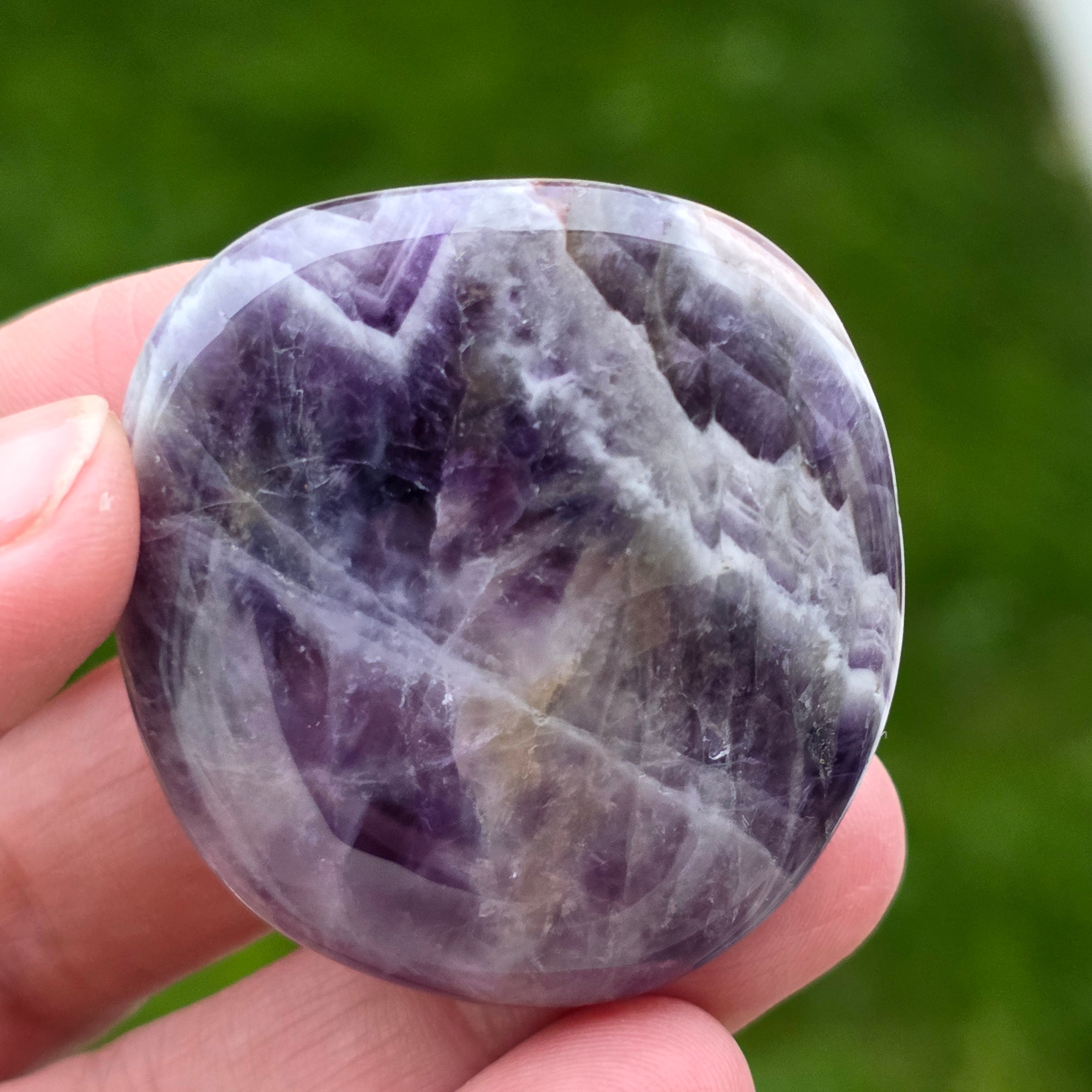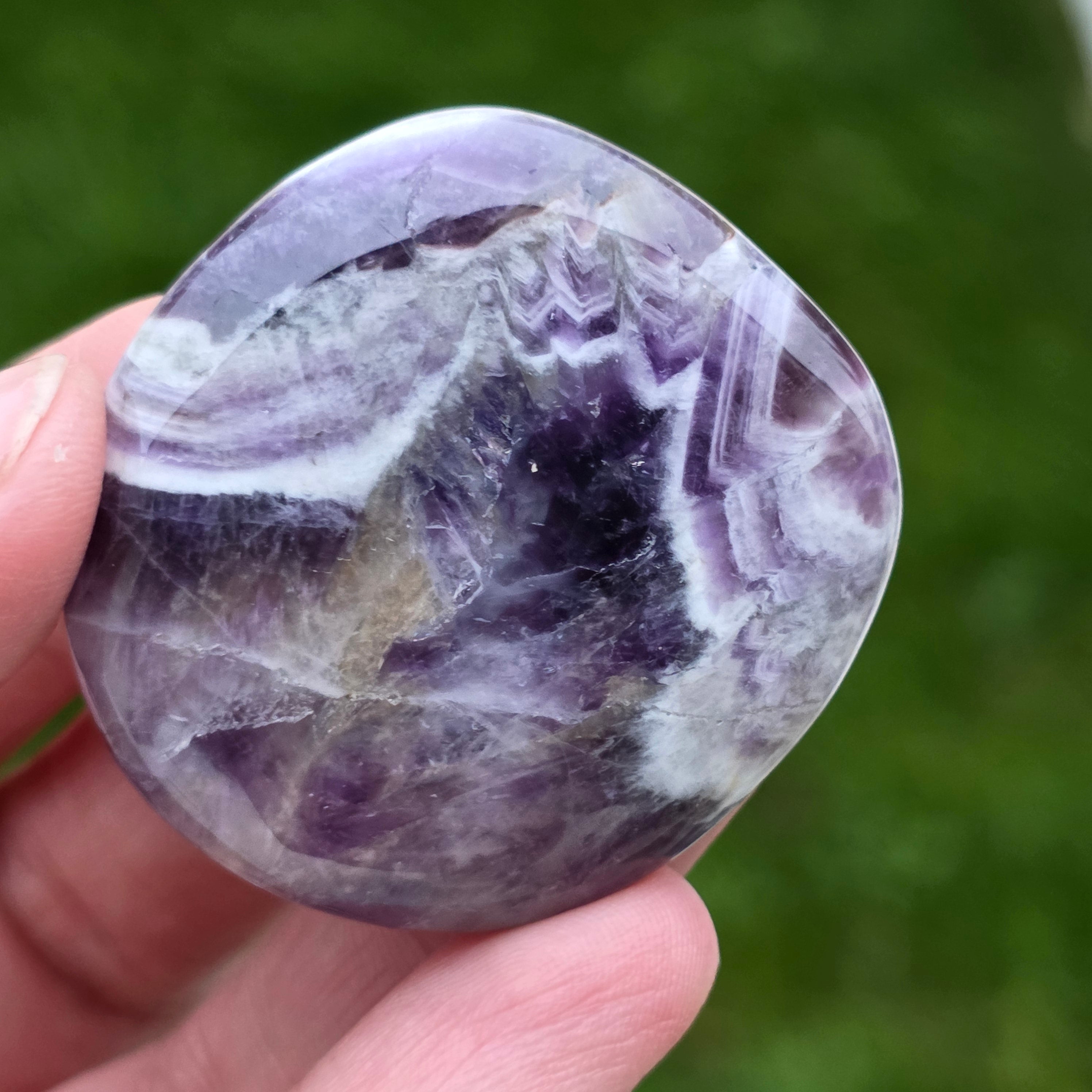 Ametyst Chevron jest znany ze swoich powiązań z czakrami korony i trzecim okiem, zwiększając intuicję i zdolność podejmowania decyzji.