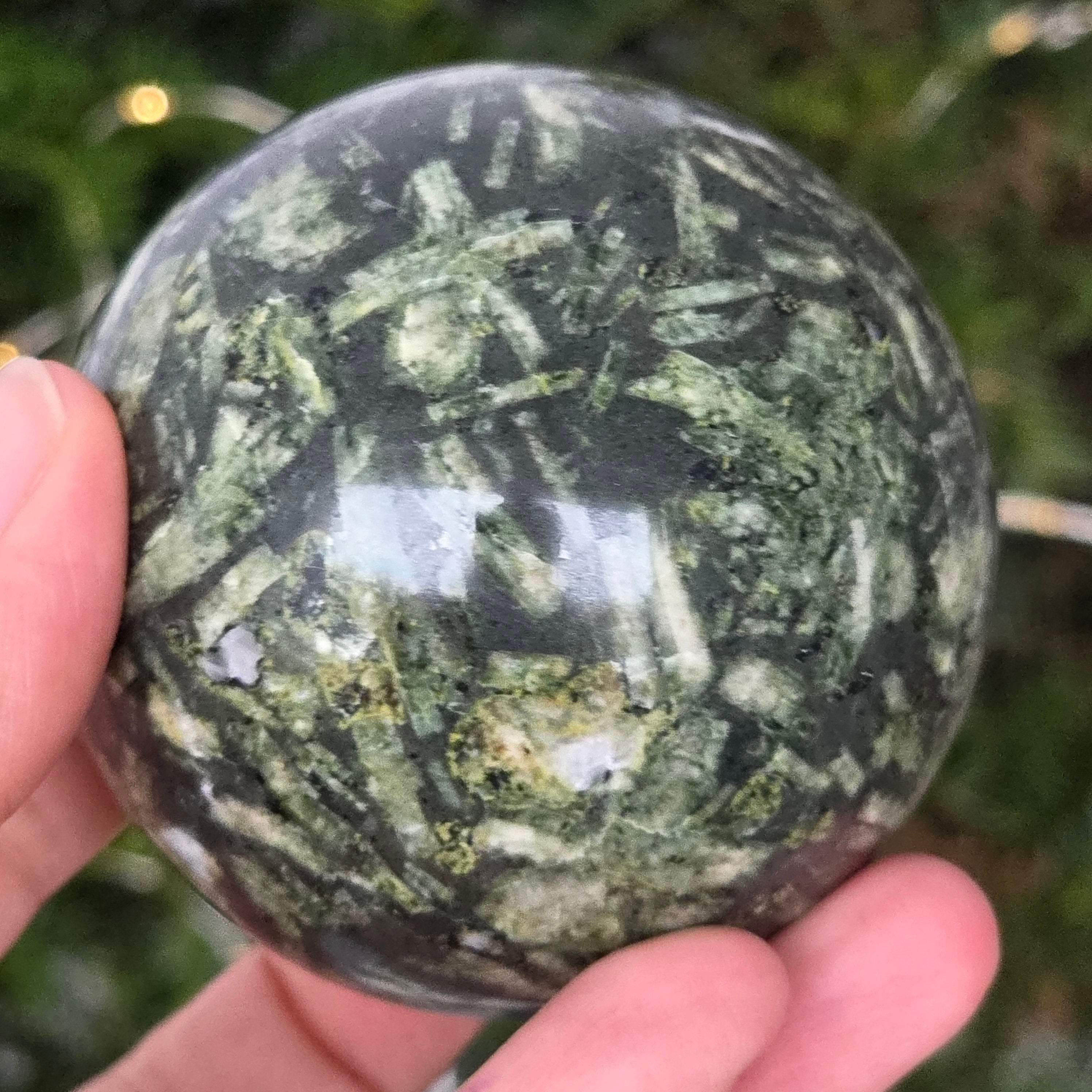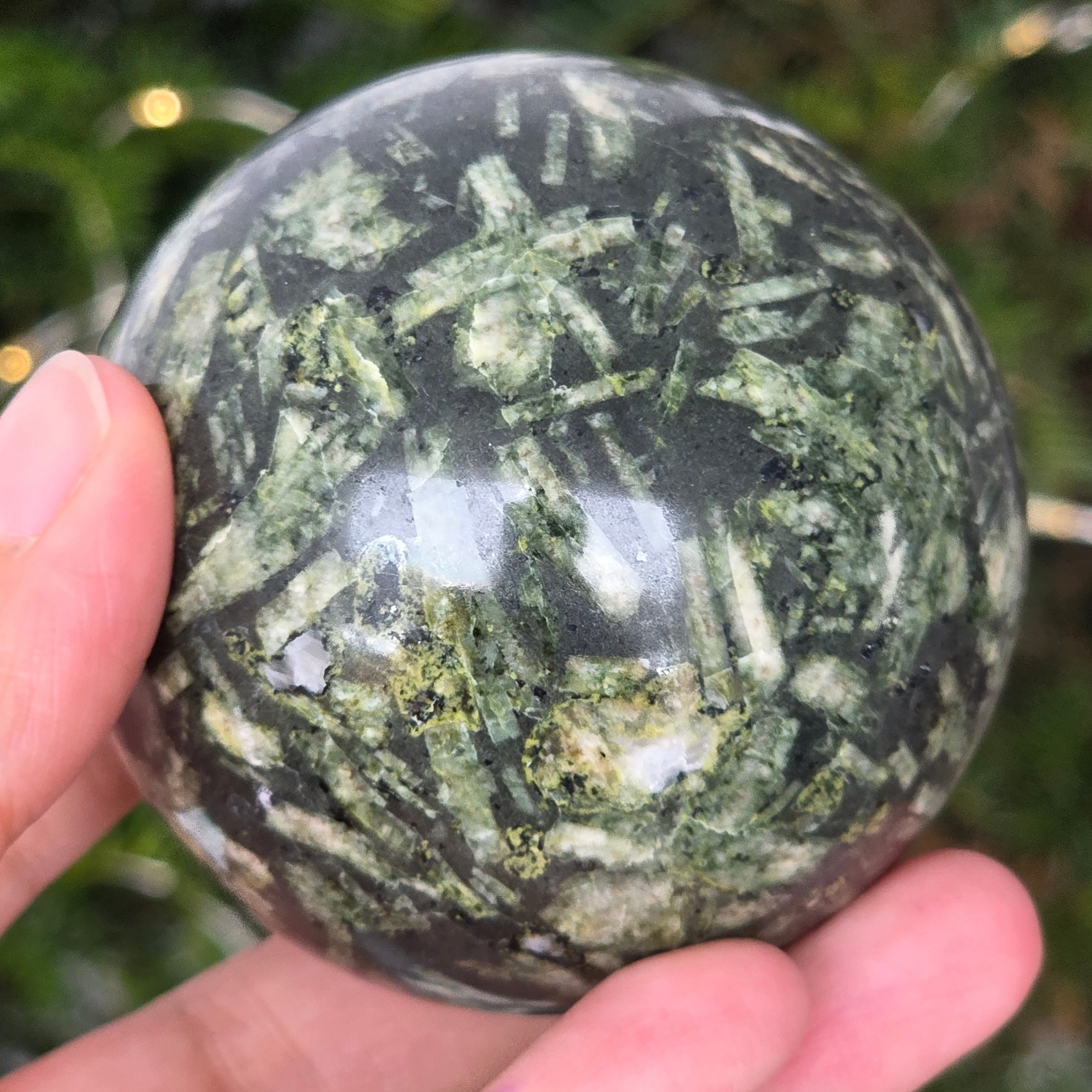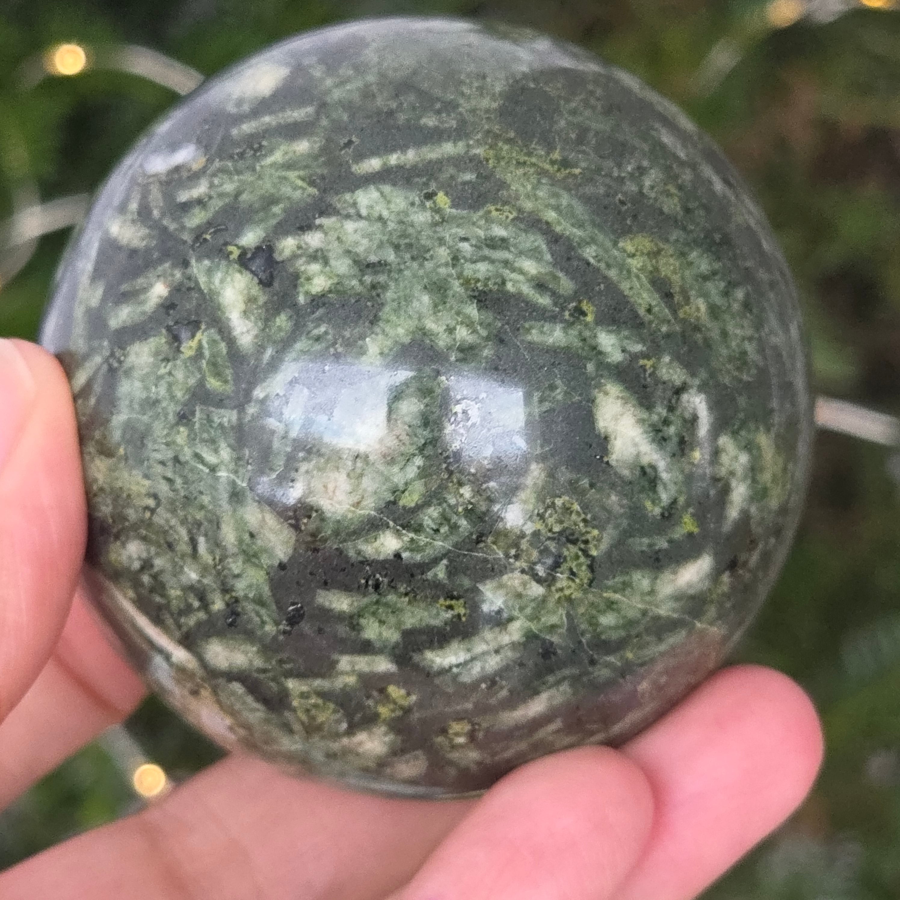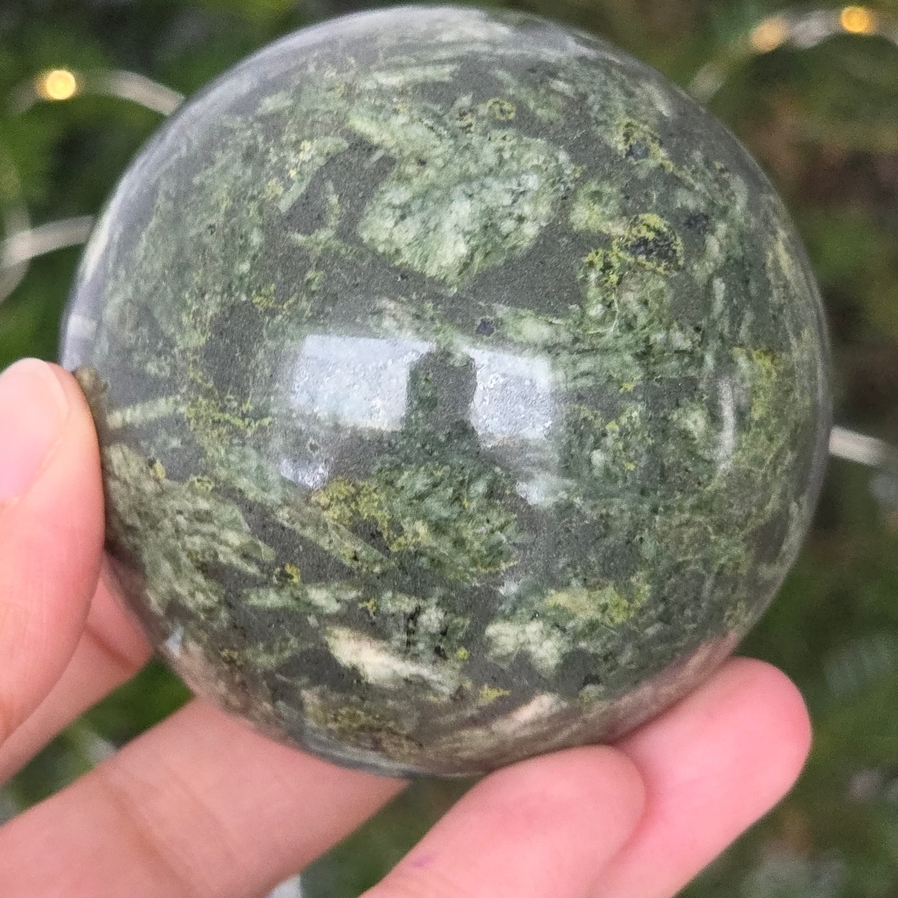 Czarna porfyra z zielonymi plamkami to dekoracyjna skała magmowa o ciemnej barwie, charakteryzująca się intensywnie czarną matrycą, w której widoczne są małe zielone kryształy rozmieszczone nieregularnie. Jej kontrastowy i fakturowany wygląd nadaje jej tajemniczy i elegancki charakter, dzięki czemu ceniona jest zarówno w kolekcjach minerałów, jak i w elementach dekoracyjnych lub okładzinach.