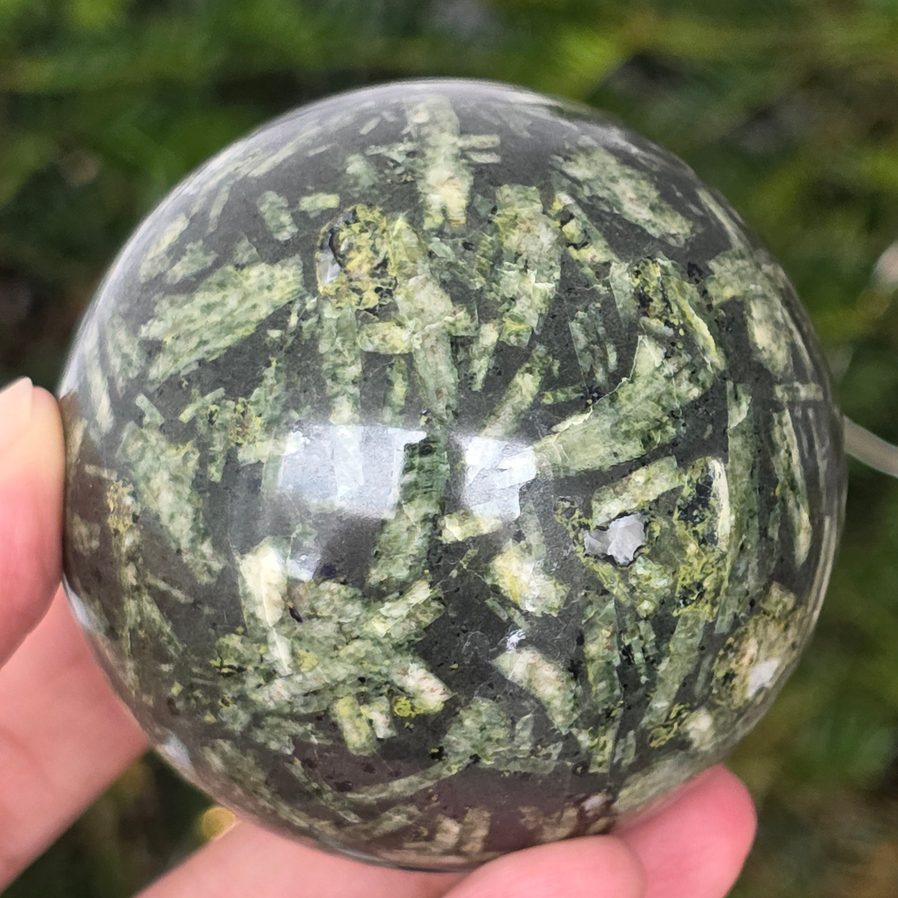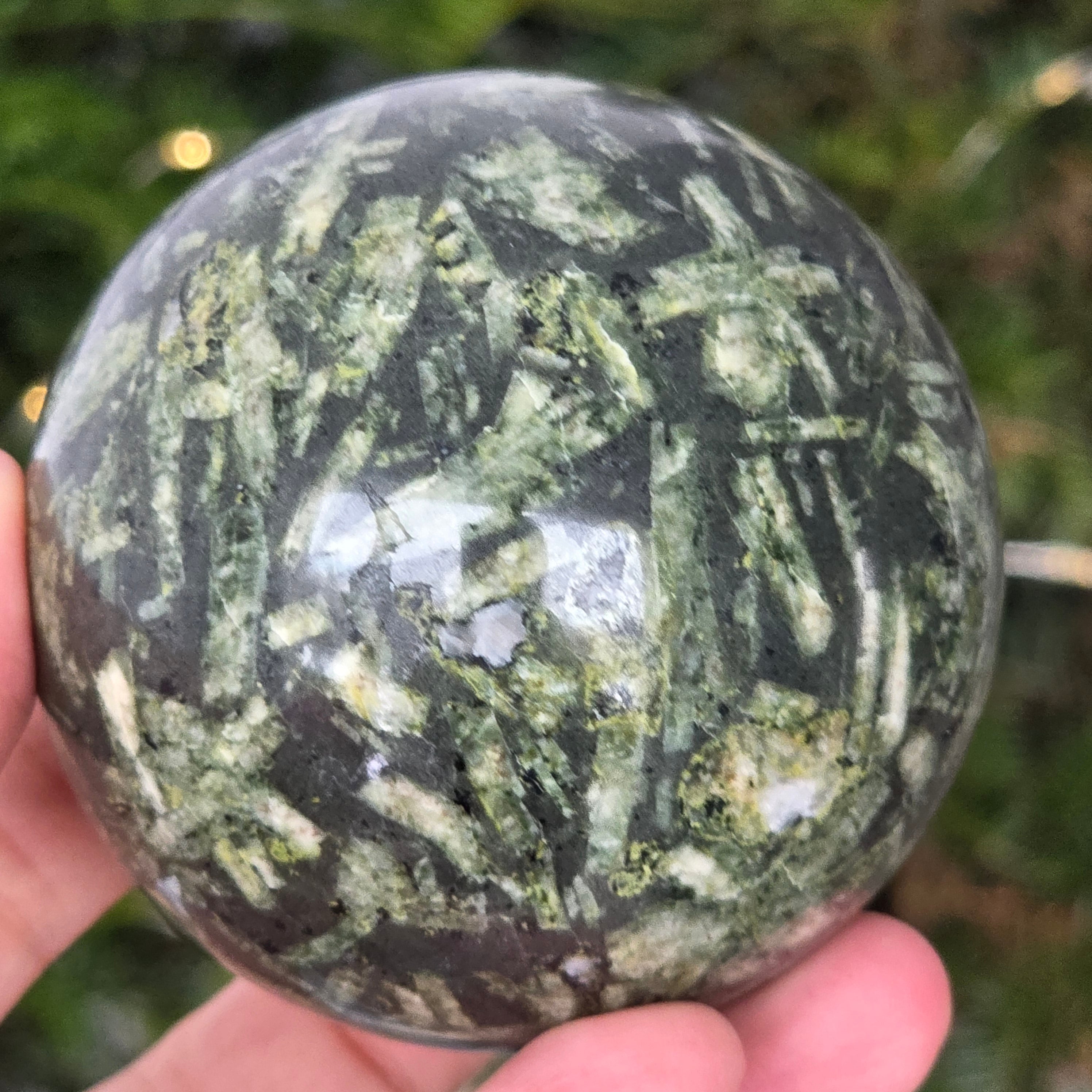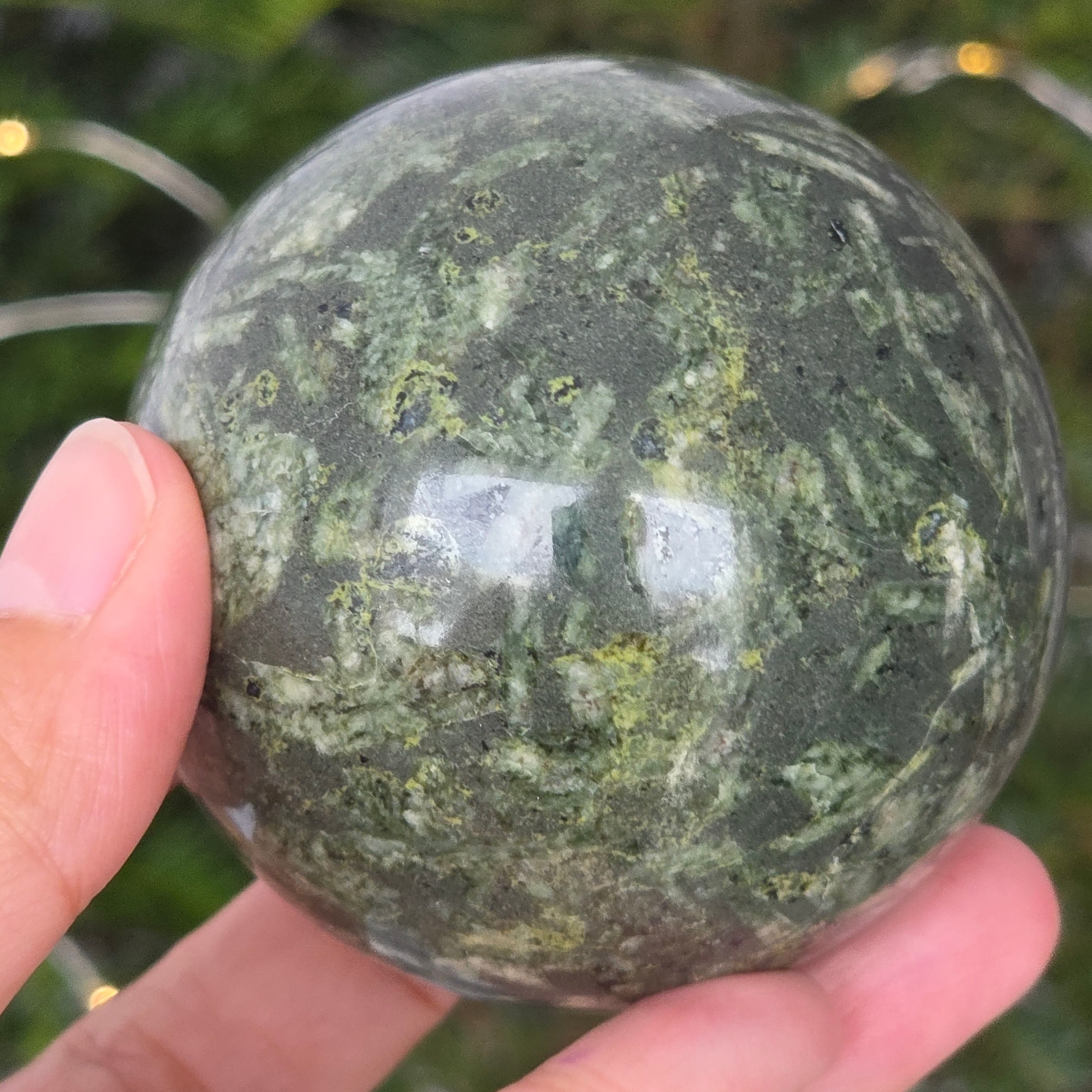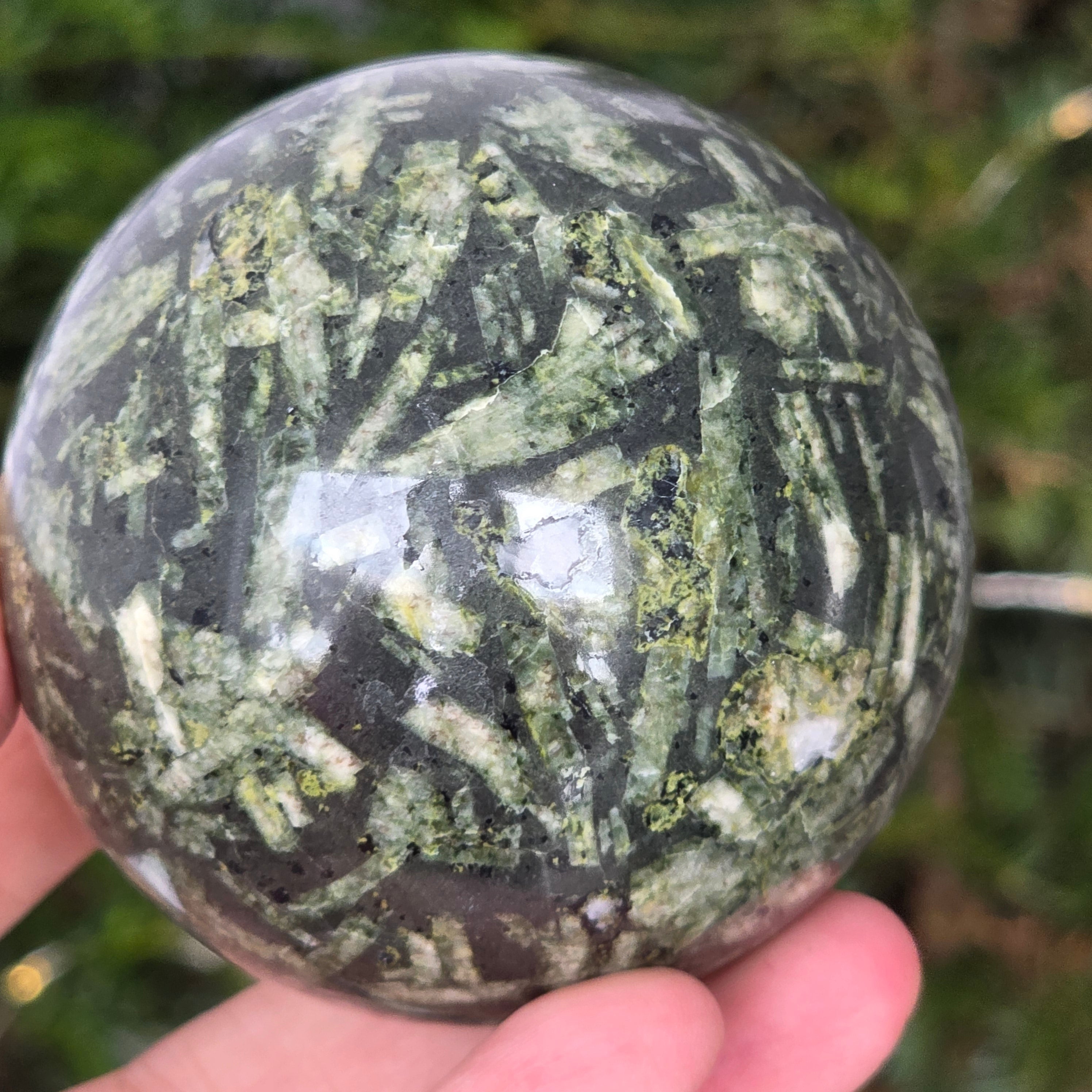 Czarna porfyra z zielonymi plamkami to dekoracyjna skała magmowa o ciemnej barwie, charakteryzująca się intensywnie czarną matrycą, w której widoczne są małe zielone kryształy rozmieszczone nieregularnie. Jej kontrastowy i fakturowany wygląd nadaje jej tajemniczy i elegancki charakter, dzięki czemu ceniona jest zarówno w kolekcjach minerałów, jak i w elementach dekoracyjnych lub okładzinach.