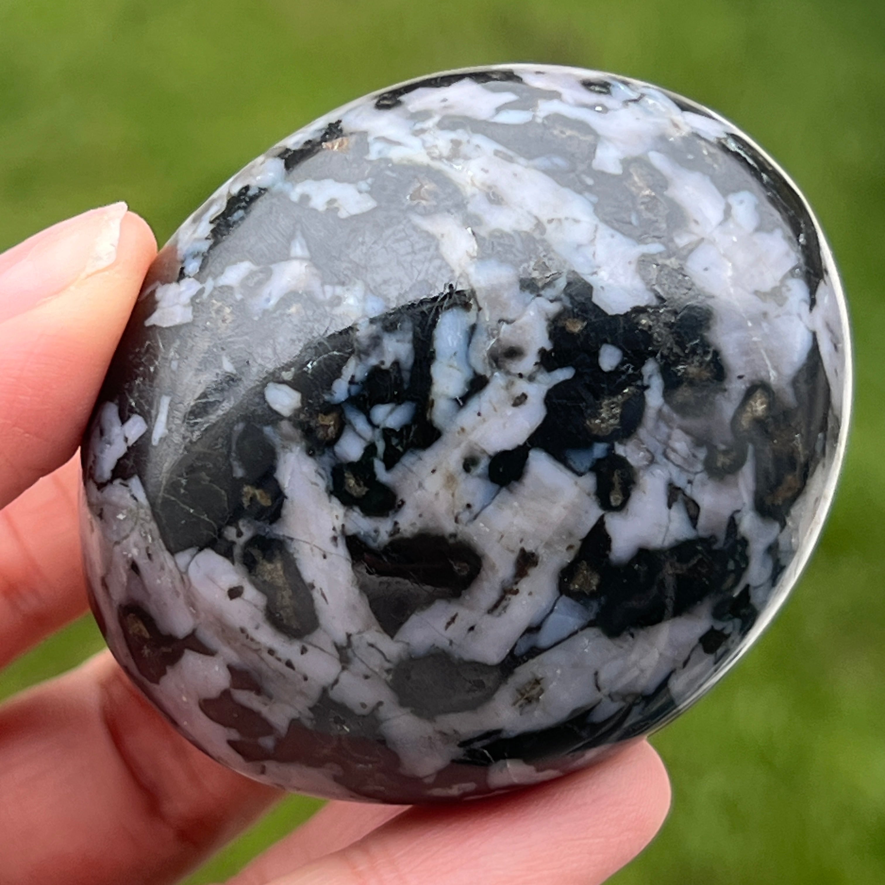 Merlinit jest rzadkim i fascynującym kamieniem półszlachetnym, znanym z kombinacji kontrastujących kolorów, białego i czarnego, co nadaje mu wyjątkowy wygląd. Uważa się go za odmianę opalu dendrytowego lub kombinację kwarcu z innymi minerałami, a jego skomplikowana struktura sprawia, że jest ceniony zarówno za piękno, jak i domniemane właściwości energetyczne. Merlinit jest znany w świecie kryształoterapii z mistycznej energii oraz powiązania z intuicją, jasnowidzeniem i wiedzą duchową.