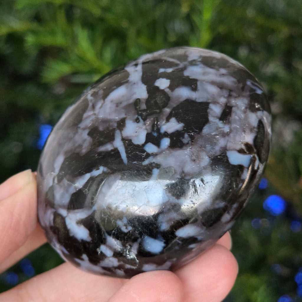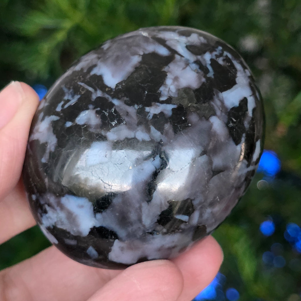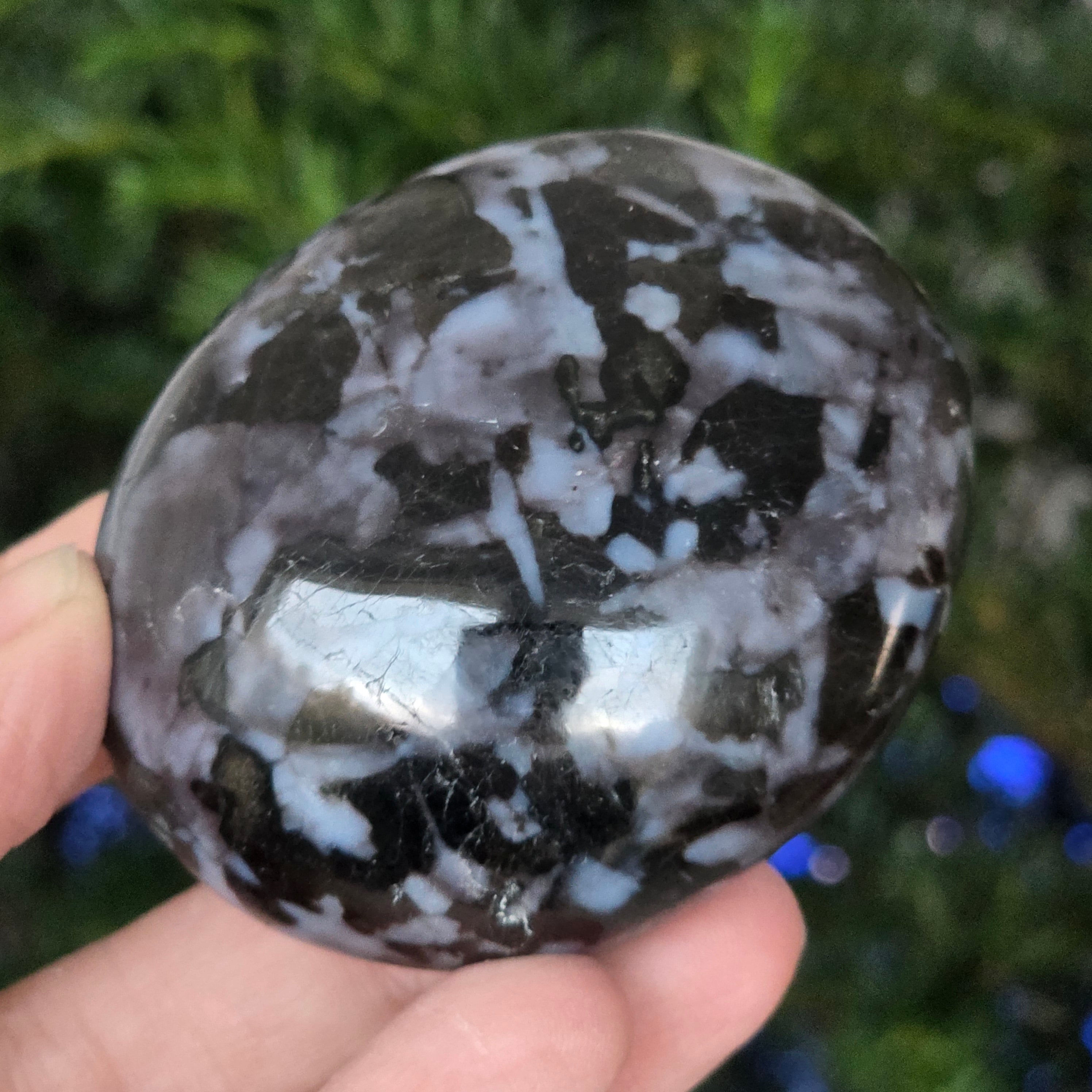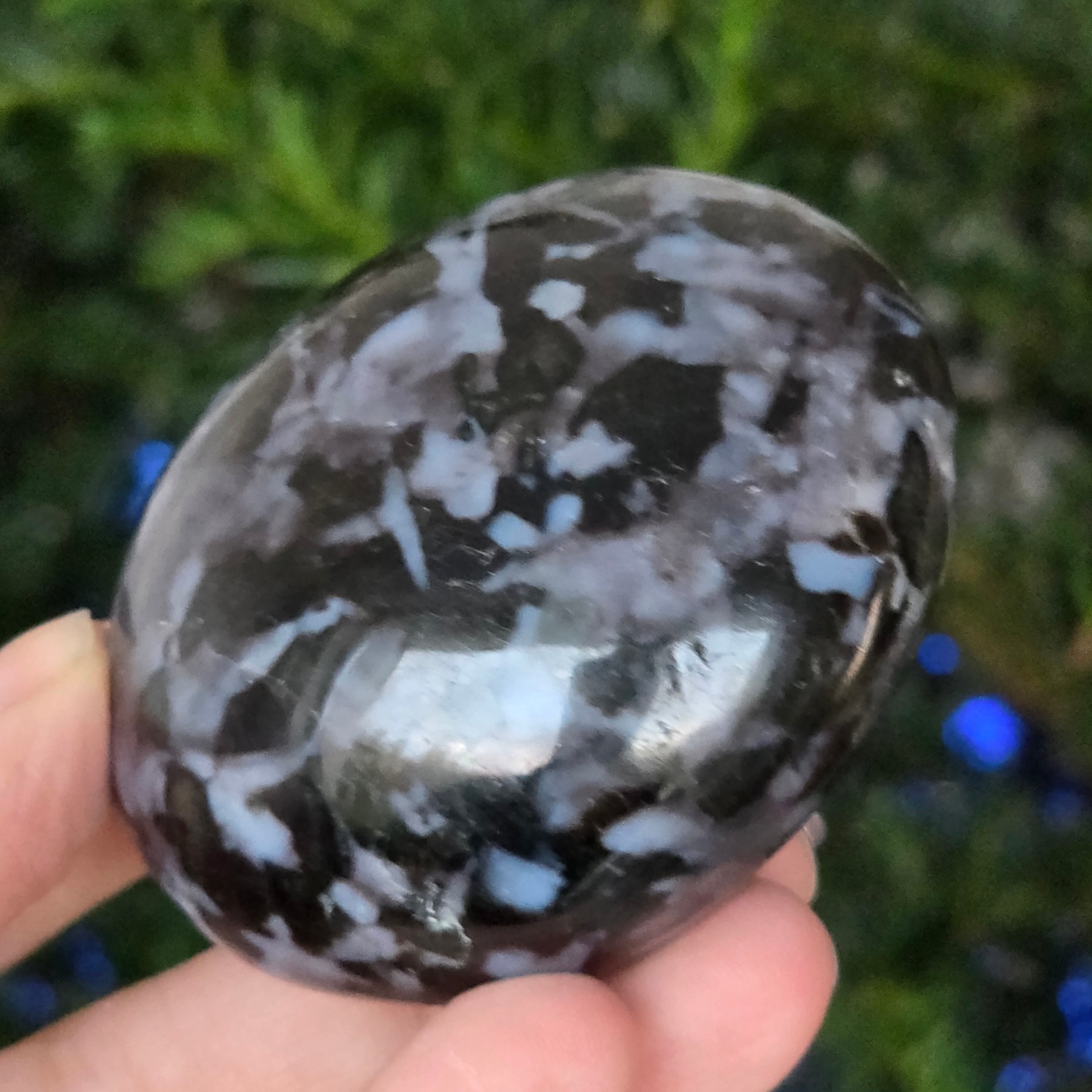 Merlinit jest rzadkim i fascynującym kamieniem półszlachetnym, znanym z połączenia kontrastujących kolorów, białego i czarnego, co nadaje mu unikalny wygląd. Uważa się go za odmianę opalu dendrytycznego lub kombinację kwarcu i innych minerałów, a jego skomplikowana struktura sprawia, że ceniony jest zarówno za piękno, jak i domniemane właściwości energetyczne. Merlinit jest znany w świecie krystaloterapii ze względu na swoje mistyczne energie oraz związek z intuicją, jasnowidzeniem i duchową wiedzą.