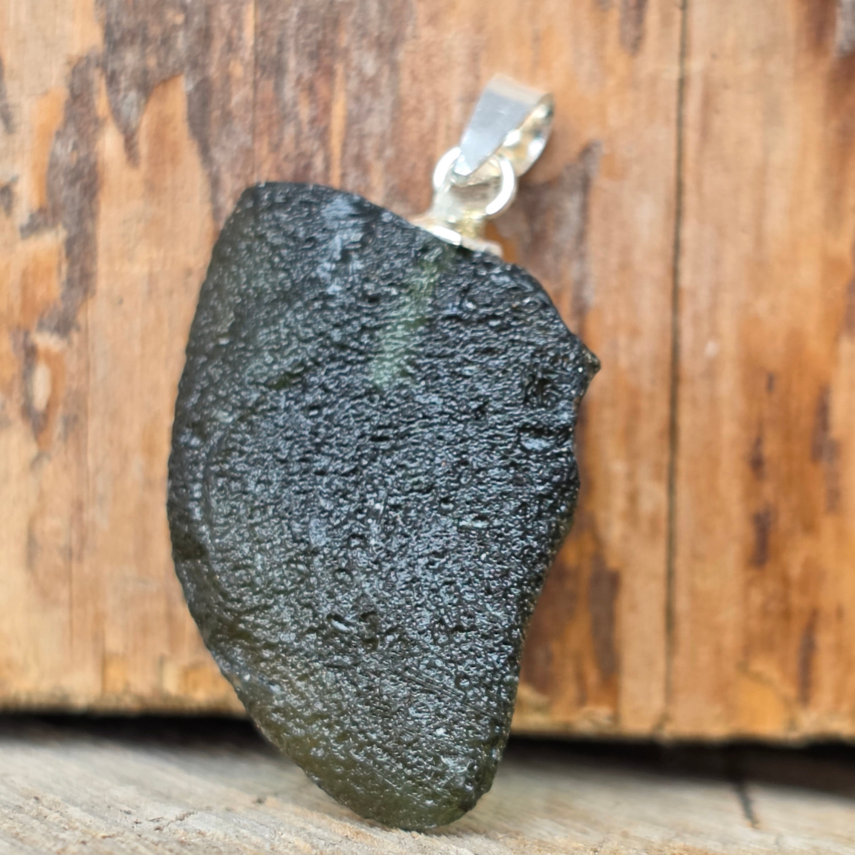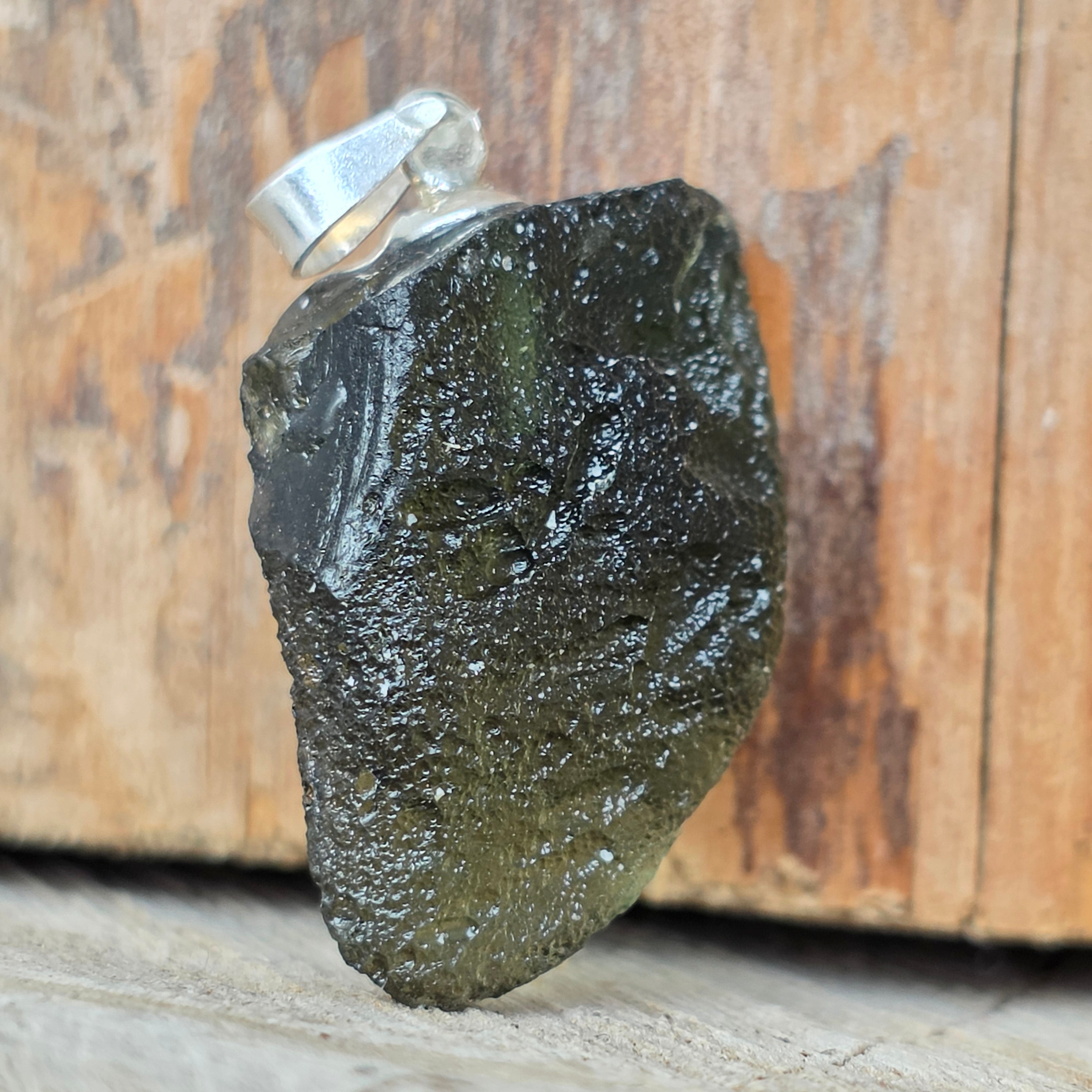 Rzadki i oryginalny wisiorek z surowy mołdawit, minimalistycznie zamontowany Srebro próby 925 aby podkreślić jego naturalny kształt.