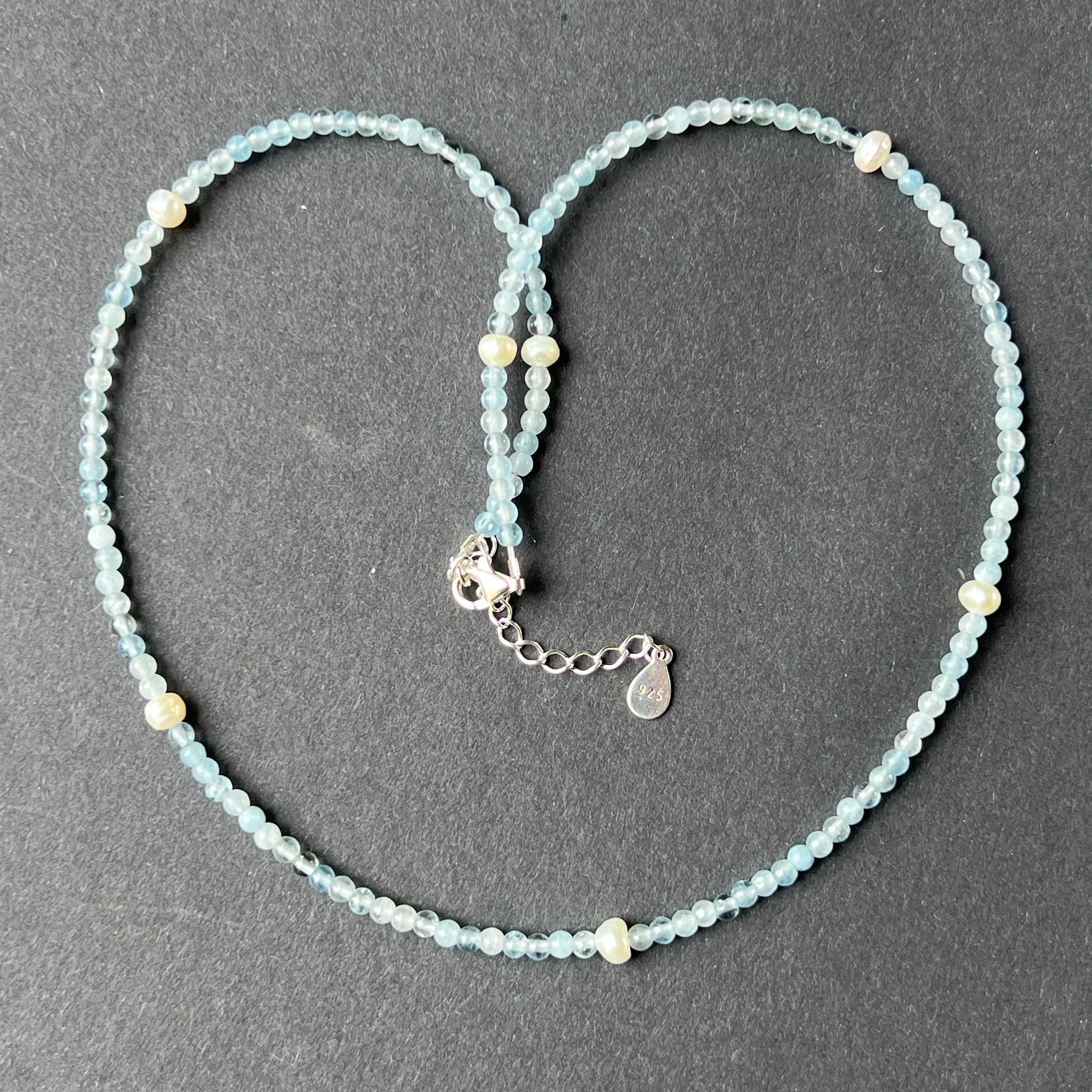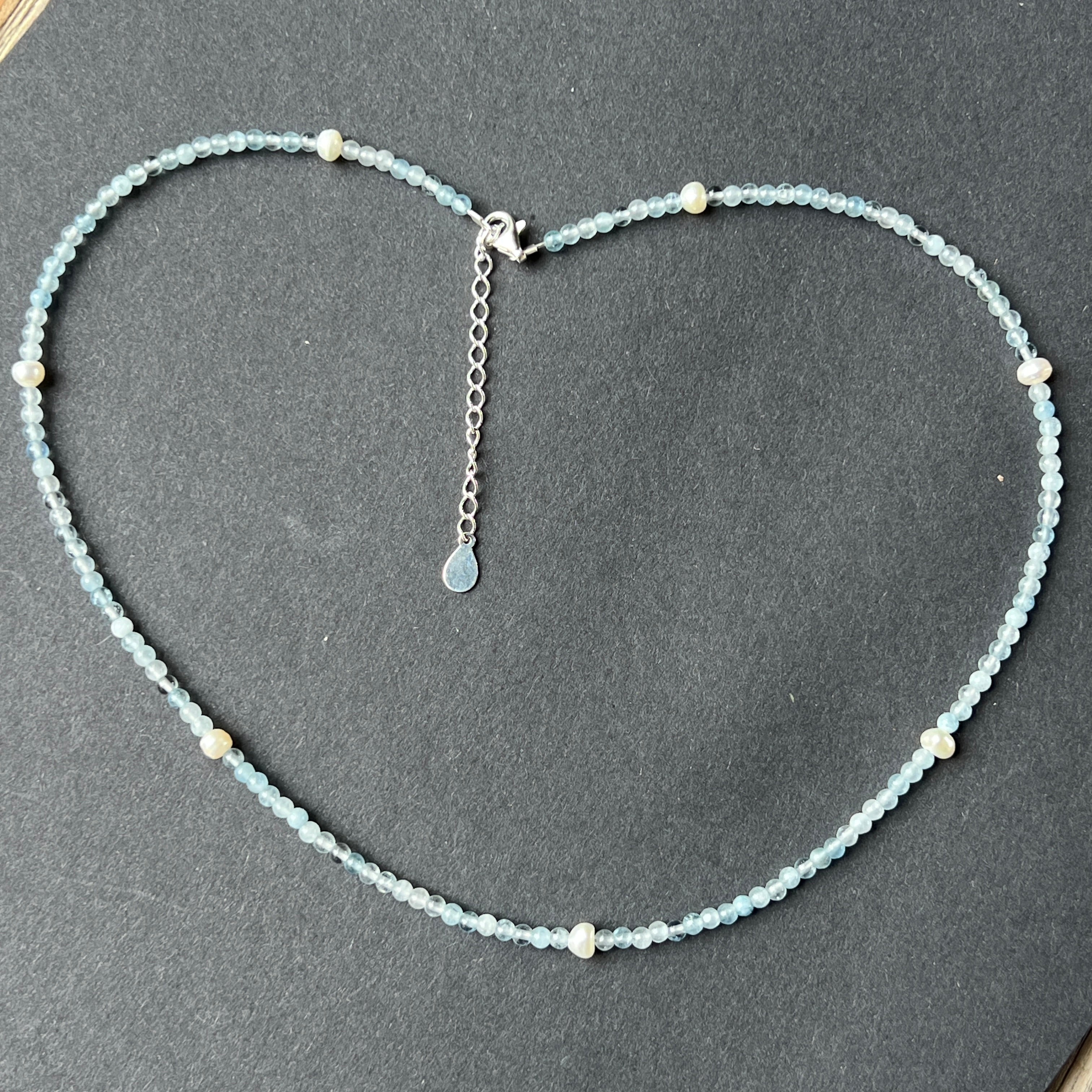 Naszyjnik jak szept z nieba – delikatny, eteryczny i głęboko kojący. Angelitowe koraliki fasetowane o średnicy 2 mm, drobne jak proszek niebieskiego światła, osiadają w nici jasności i spokoju, jak spokojny oddech w samym środku zgiełku.