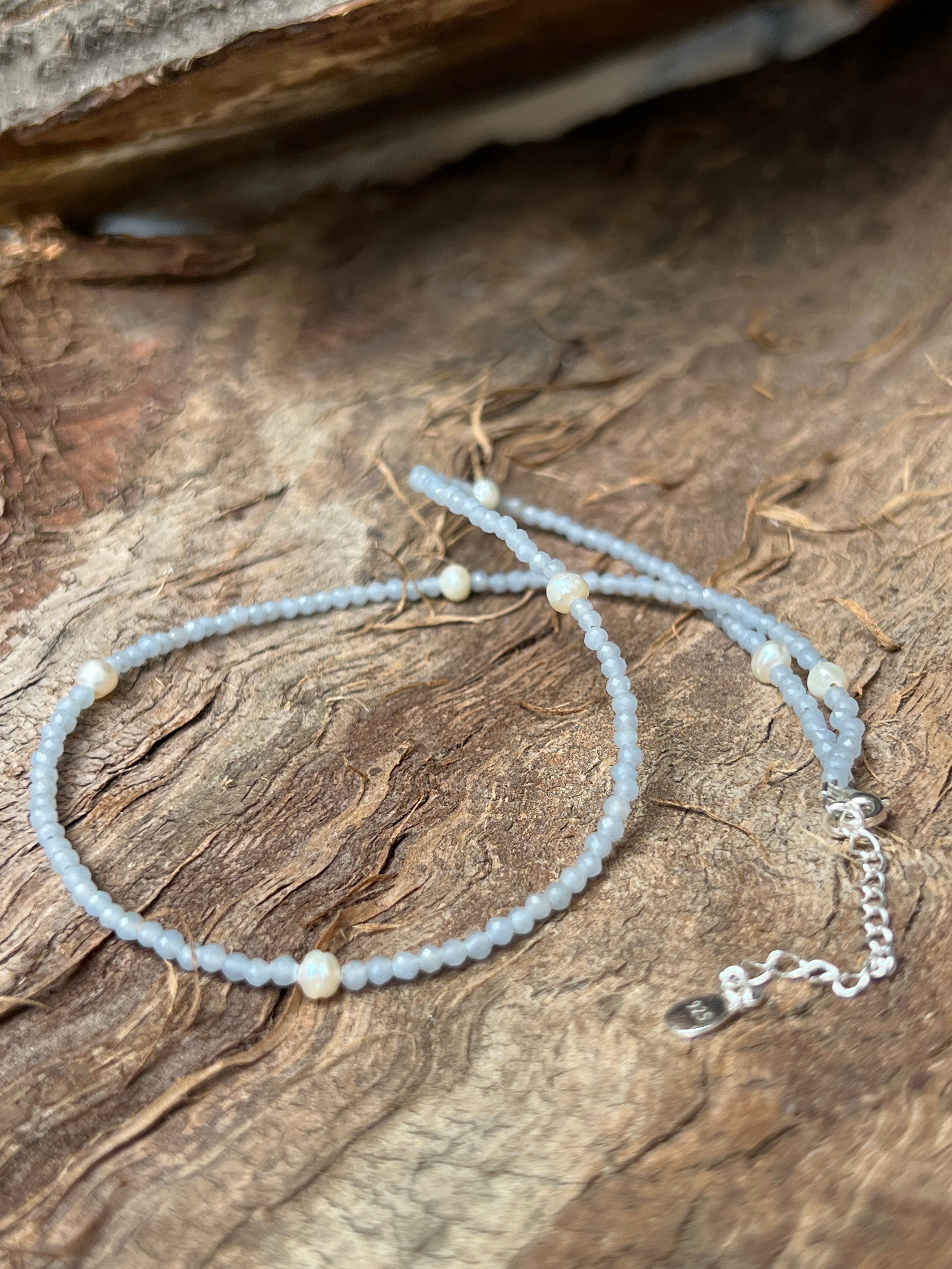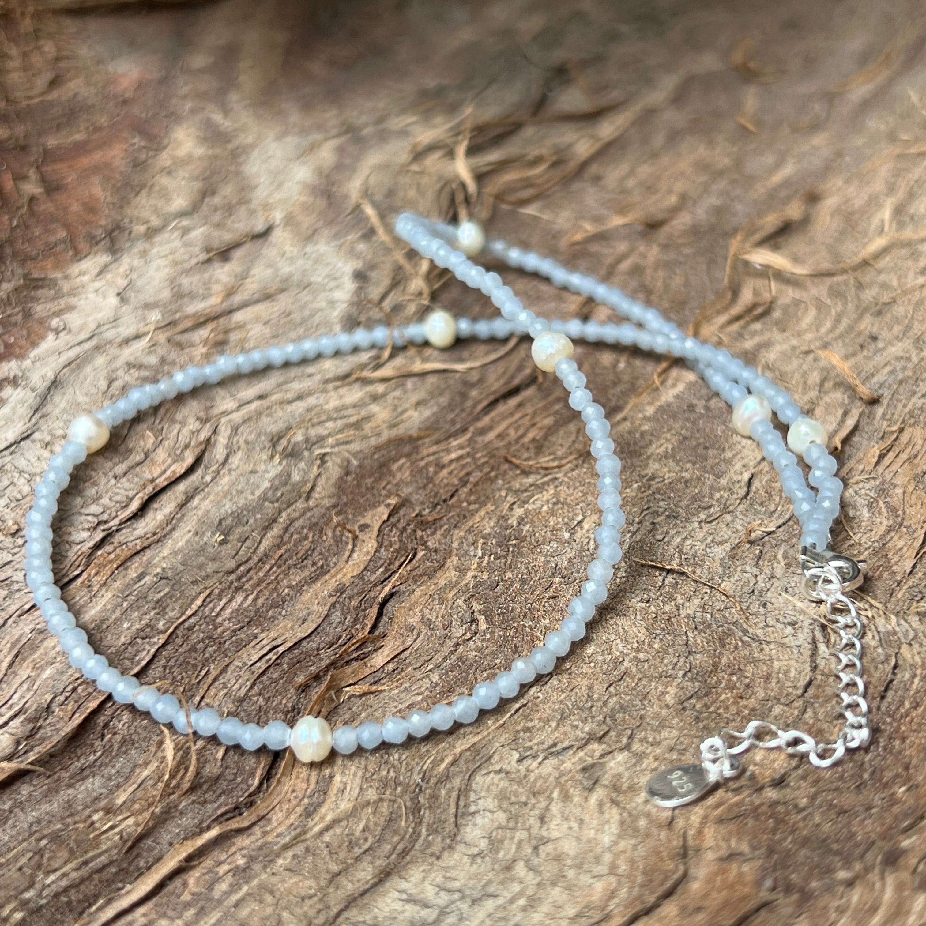 Angelit jest znany jako anielski kamień – kryształ spokoju umysłu, duchowego połączenia i niewerbalnej komunikacji ze światem subtelnym. Mówi się, że przynosi łagodną ochronę, zaufanie i otwartość na wyższe wymiary istnienia. Perły wzmacniają tę energię swoją cichą czystością, przywołując subtelne piękno i emocjonalną mądrość