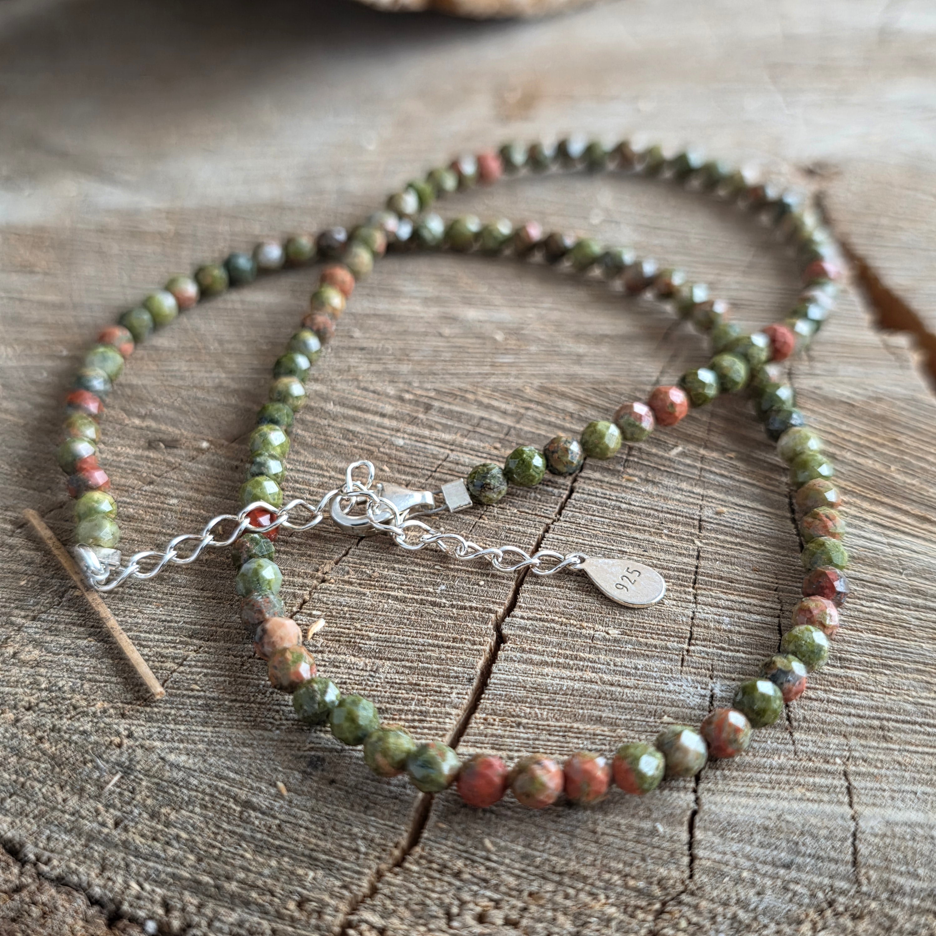 Naszyjnik z duszą z żywej ziemi – ciepły, wyważony i łagodny. Fasetowane koraliki unakitu 4 mm łączą odcienie zieleni mechowej i różu terakotowego, niczym ciepły jesienny krajobraz uchwycony w biżuterii.