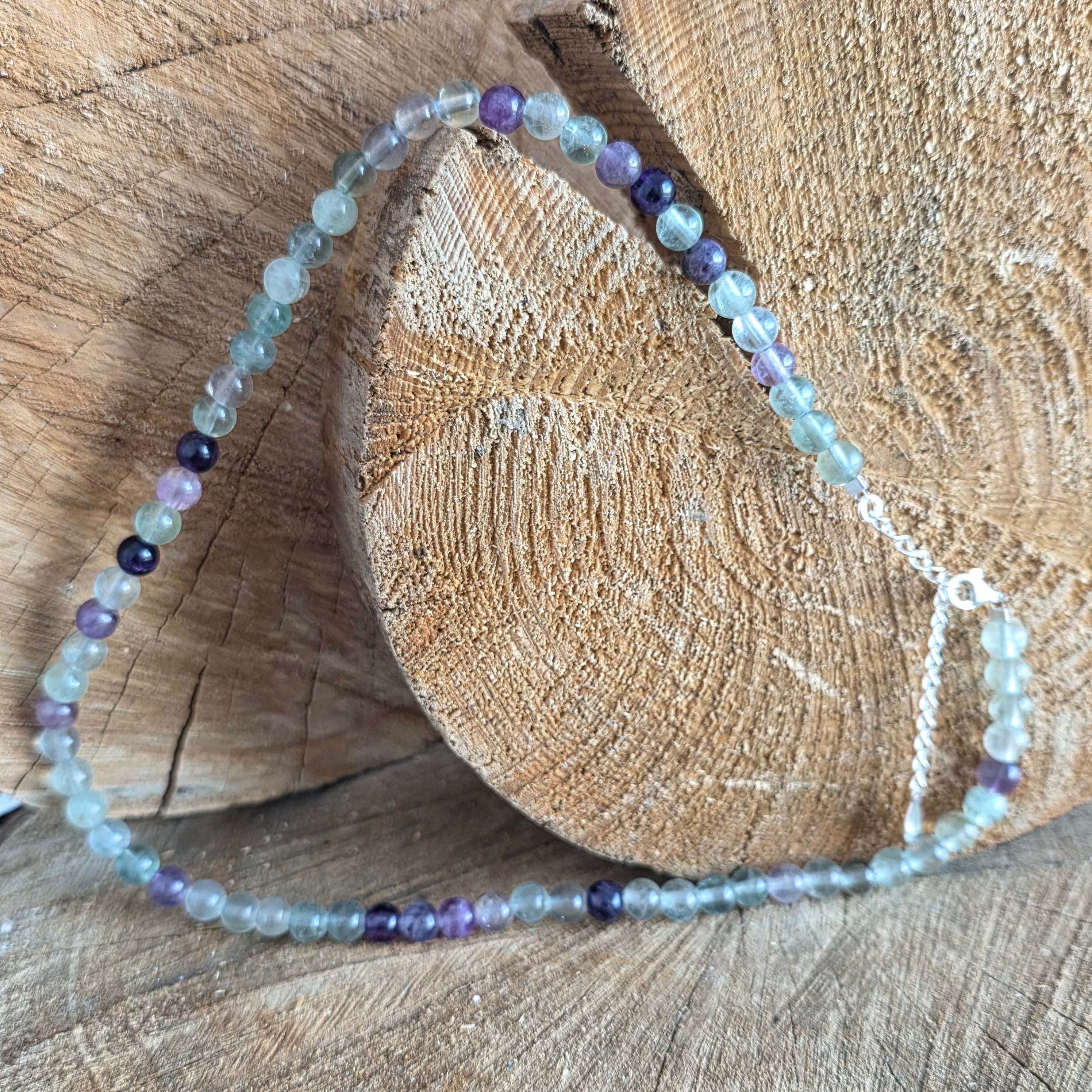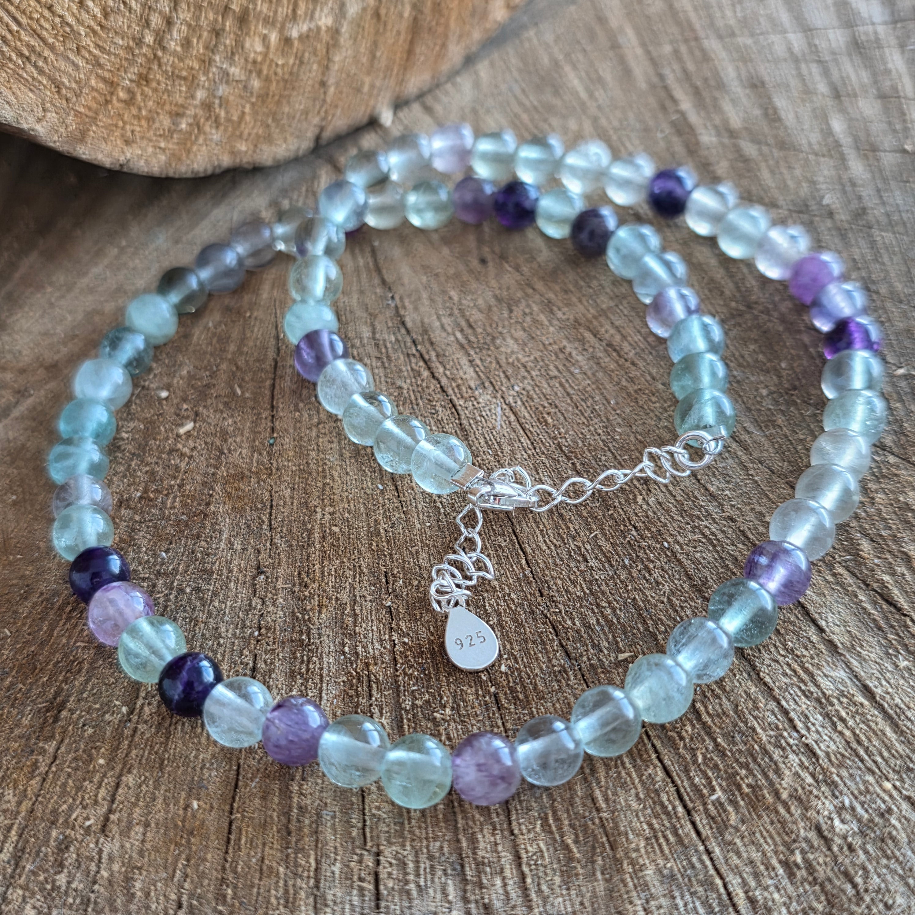 Delikatny i świetlisty, ten naszyjnik z fluorytu tęczowego wykonany jest z fasetowanych kulek o średnicy 3 mm, starannie szlifowanych, aby podkreślić przezroczystość i naturalne zmiany koloru kamienia. Subtelne odcienie zieleni, fioletu i niebieskiego łączą się harmonijnie, nadając naszyjnikowi lekki i wyrafinowany wygląd.
