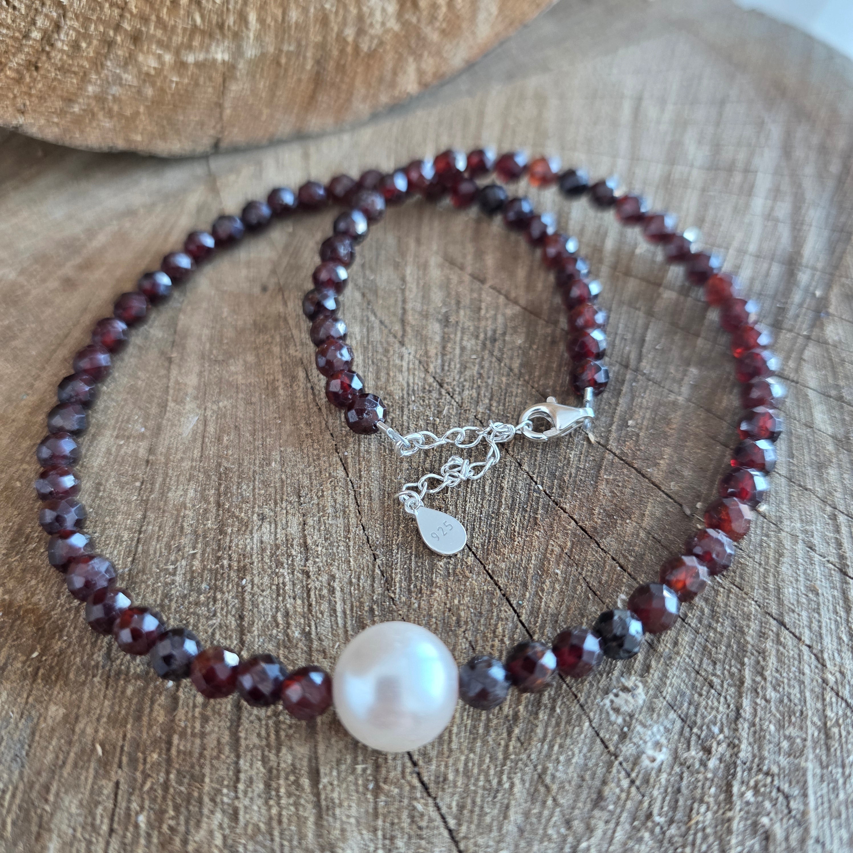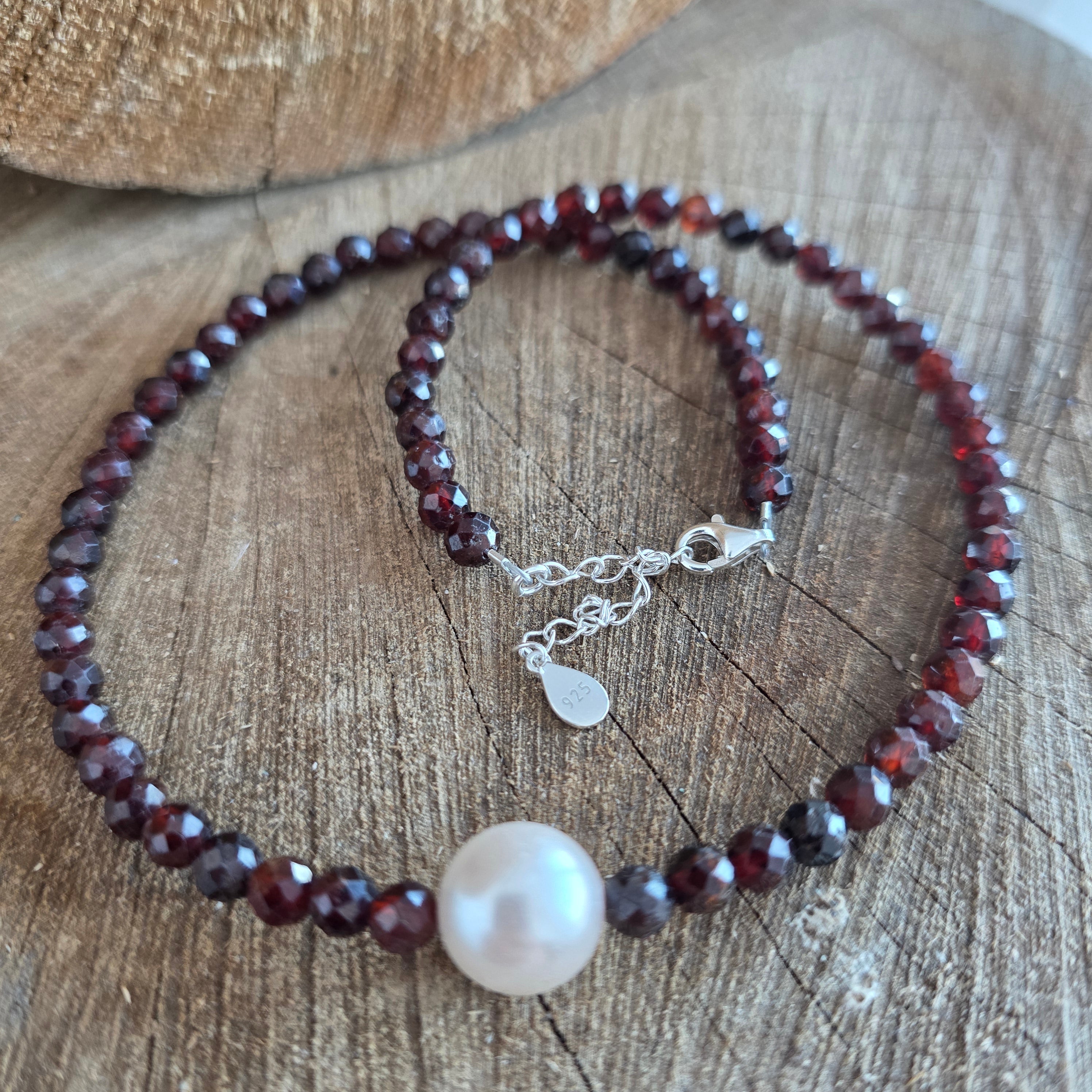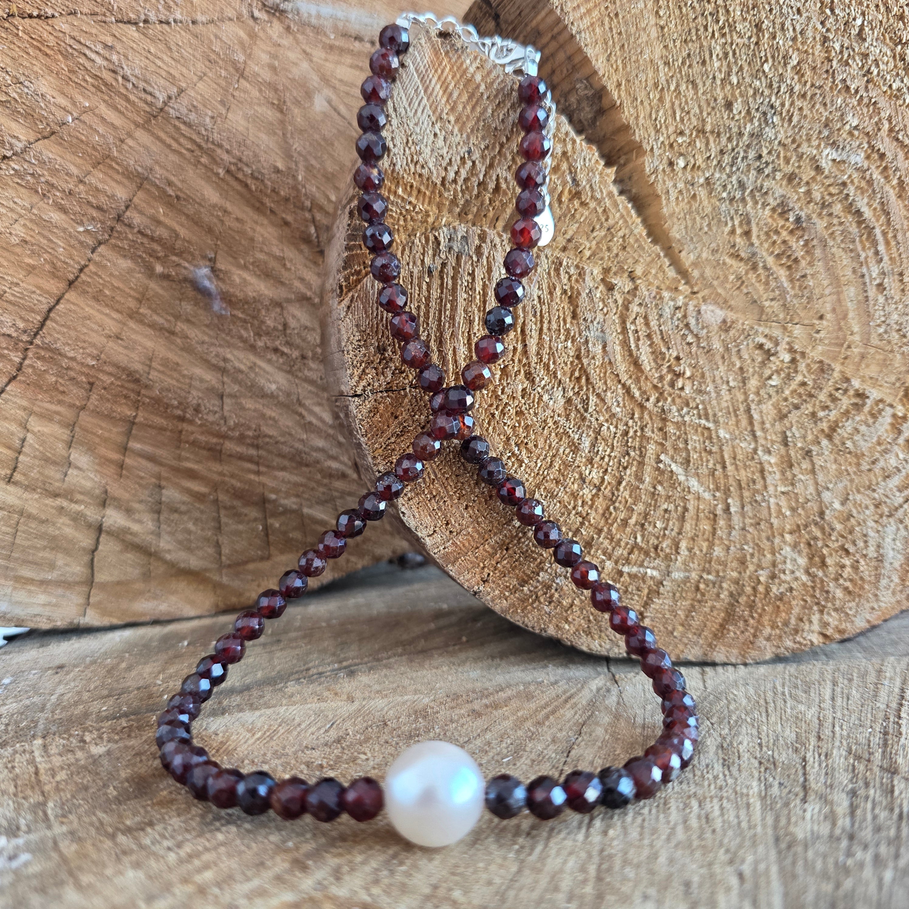 Materiały: ciemnoczerwony granat fasetowany, koraliki 5 mm, srebro 925, perła 1 cm