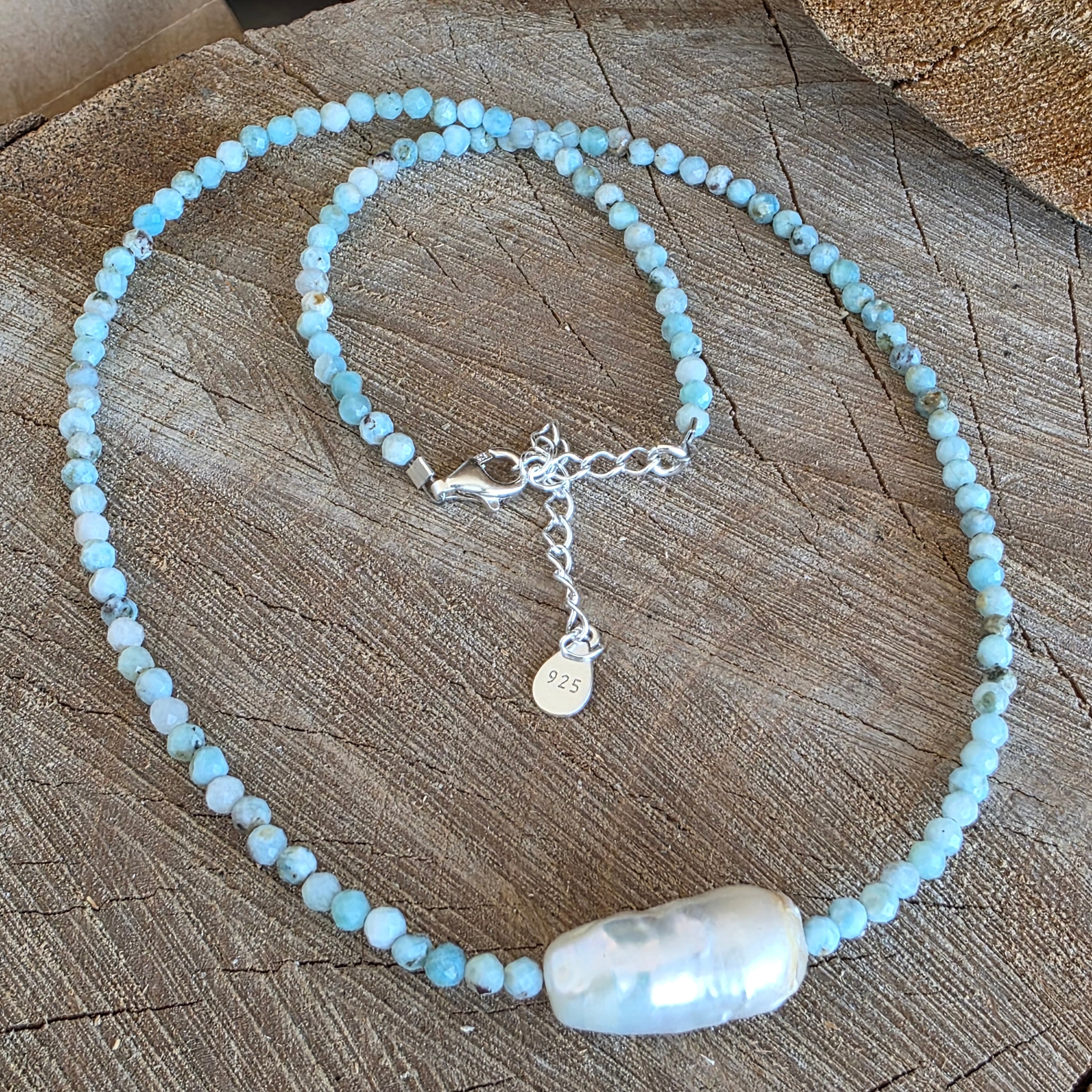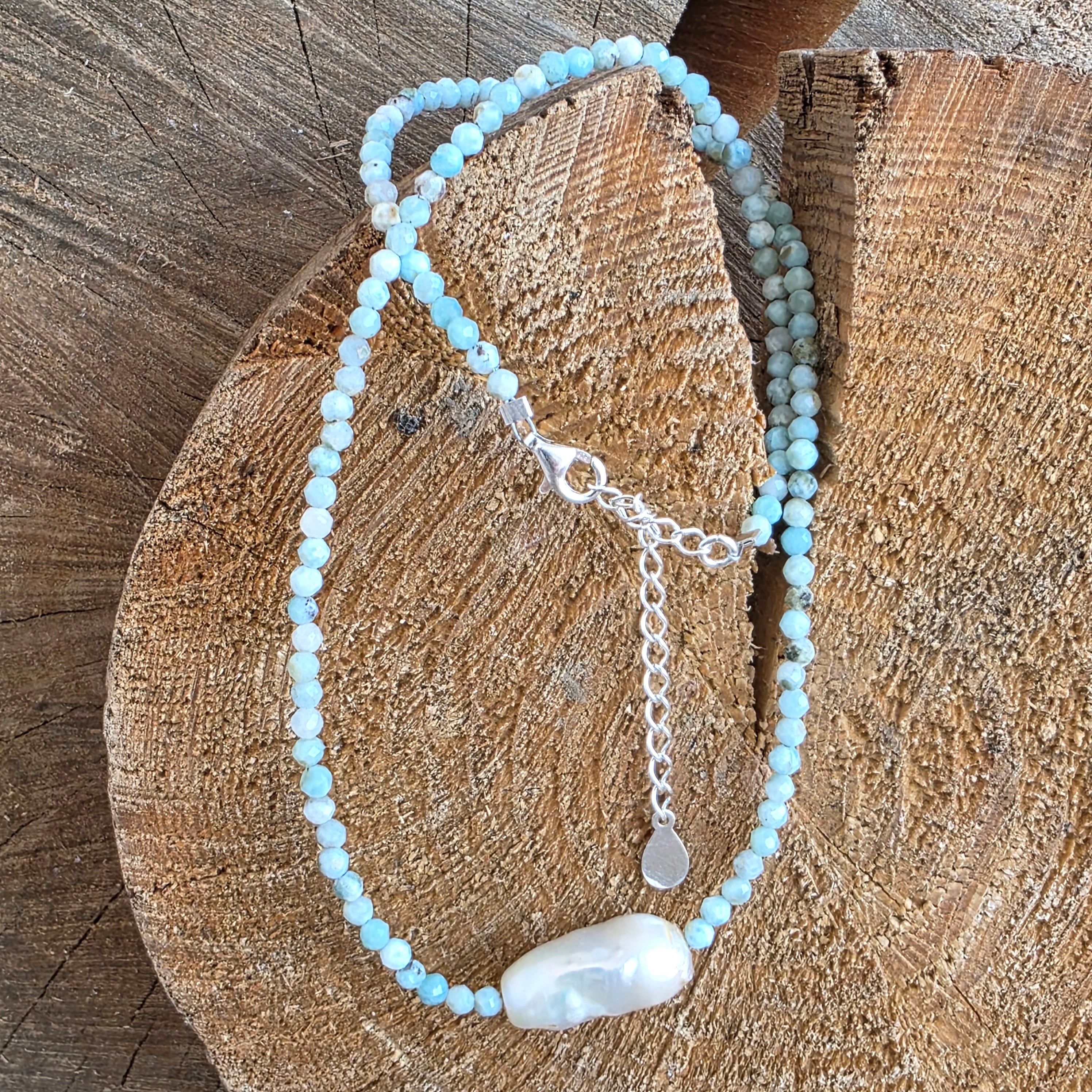 Jasny i wyrafinowany naszyjnik wykonany z fasetowanych koralików larimaru 3 mm, uzupełniony perełką akcentową 1,8 cm, rozmieszczoną jako subtelne i wyważone akcenty. Jasnoniebieski kolor larimaru, z mlecznymi odcieniami i delikatnymi falami, przywodzi na myśl spokój wody i otwartą przestrzeń, podczas gdy perły dodają subtelnego, organicznego kontrastu, nadając biżuterii głębi i klasycznej elegancji. Delikatne fasetowanie subtelnie odbija światło, zachowując lekki i harmonijny wygląd.