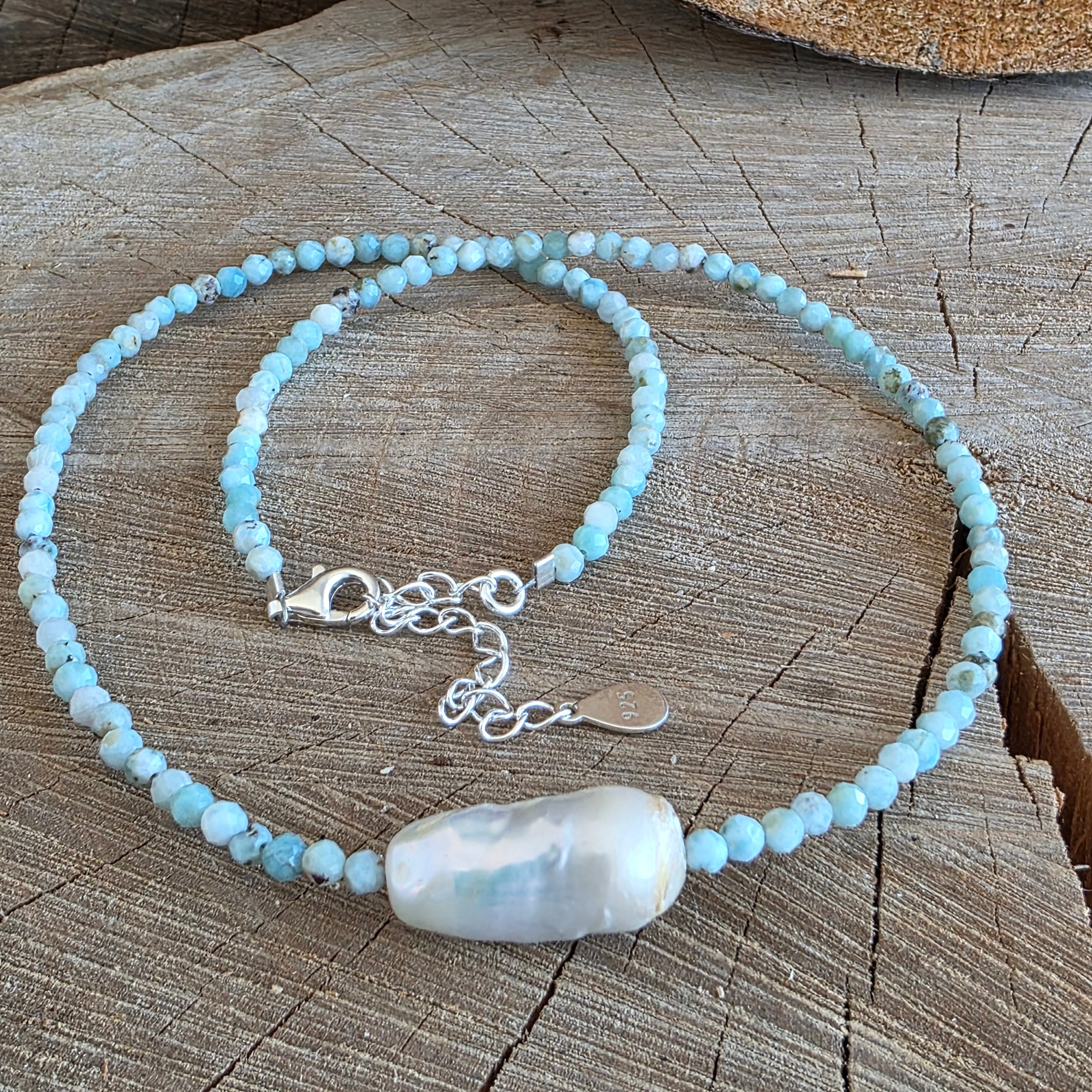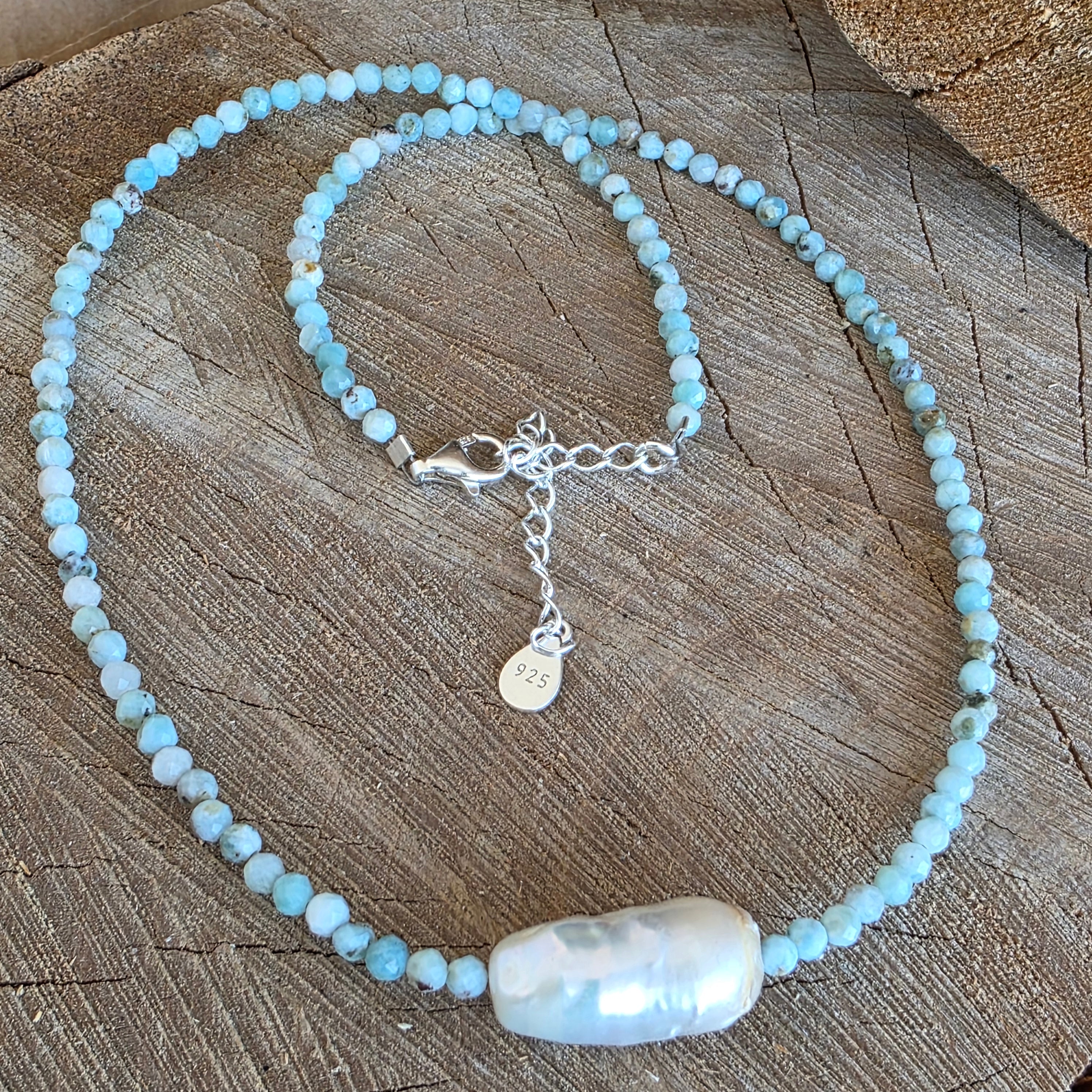 Materiały: naturalny larimar, fasetowane koraliki 3 mm, perełka akcentowa 1,8 cm, srebro 925