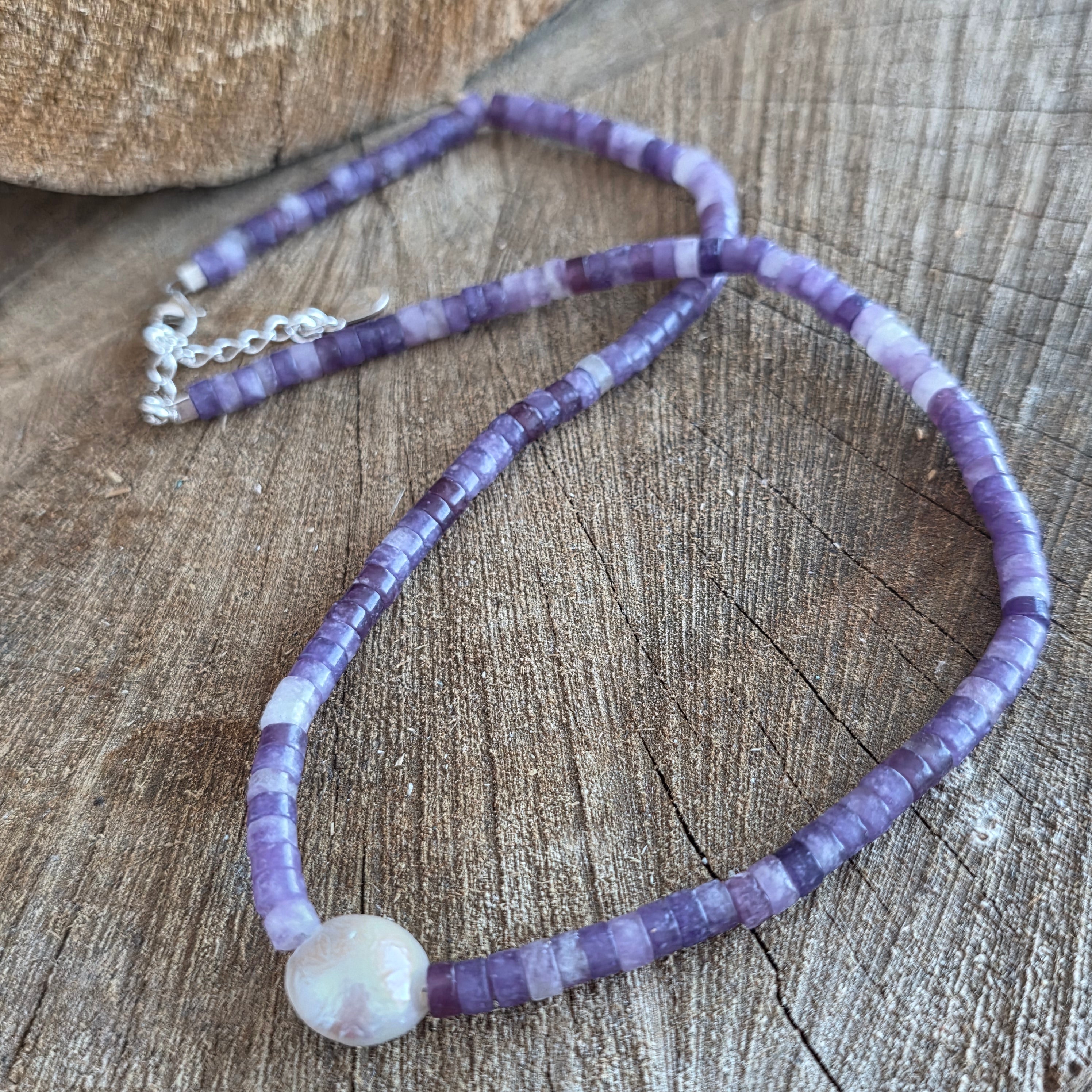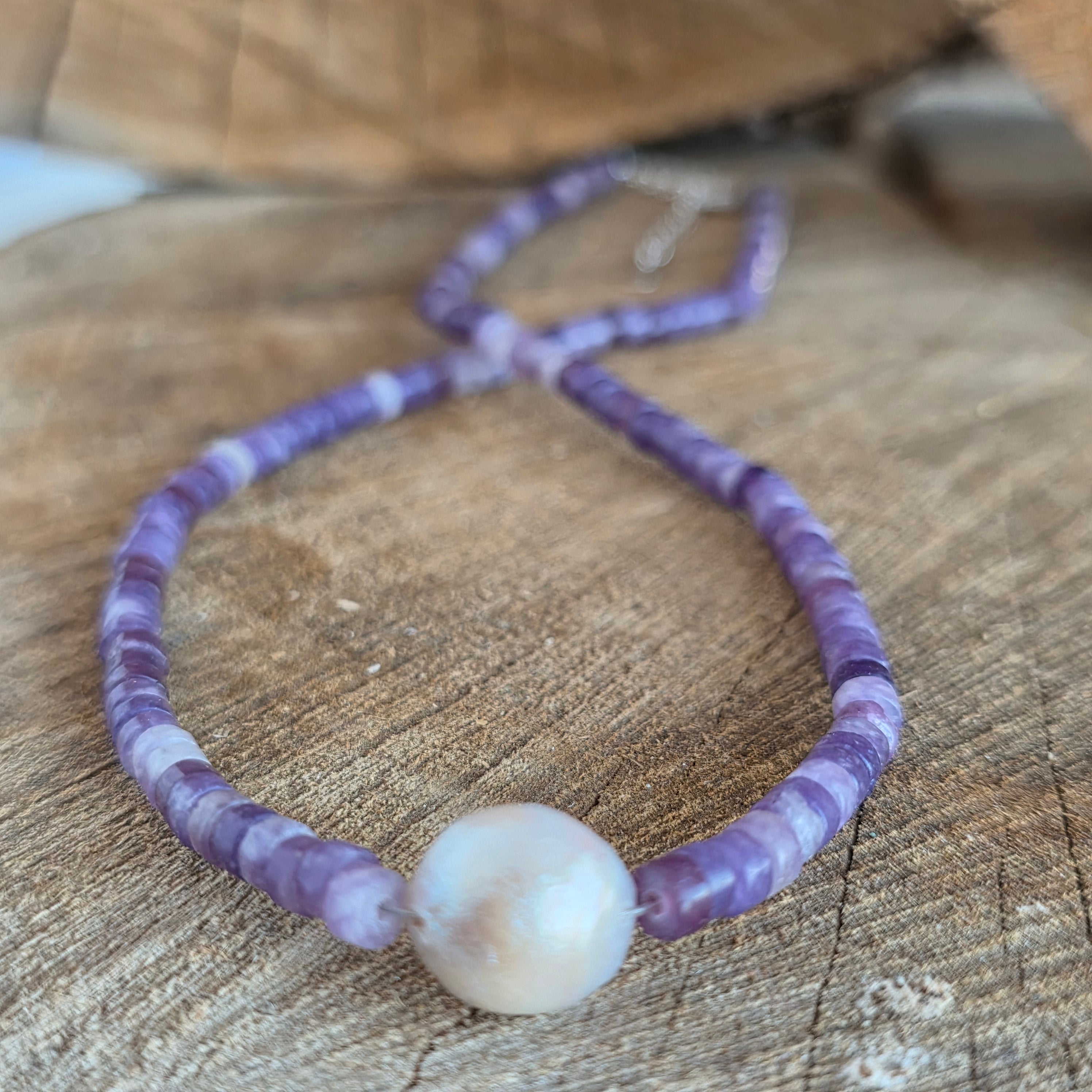 Naszyjnik, który emanuje spokojem i wyrafinowaniem, powstały z subtelnego połączenia lepidolitu ze aksamitnym blaskiem perły. Naturalny lepidolit o średnicy 8 mm, z przejrzystymi odcieniami fioletowo-liliowymi, przynosi uczucie spokoju i równowagi, niczym głęboki oddech w środku burzy. Każda kula niesie delikatną, przezroczystą wibrację, przypominającą o wewnętrznym pokoju i klarowności umysłu.