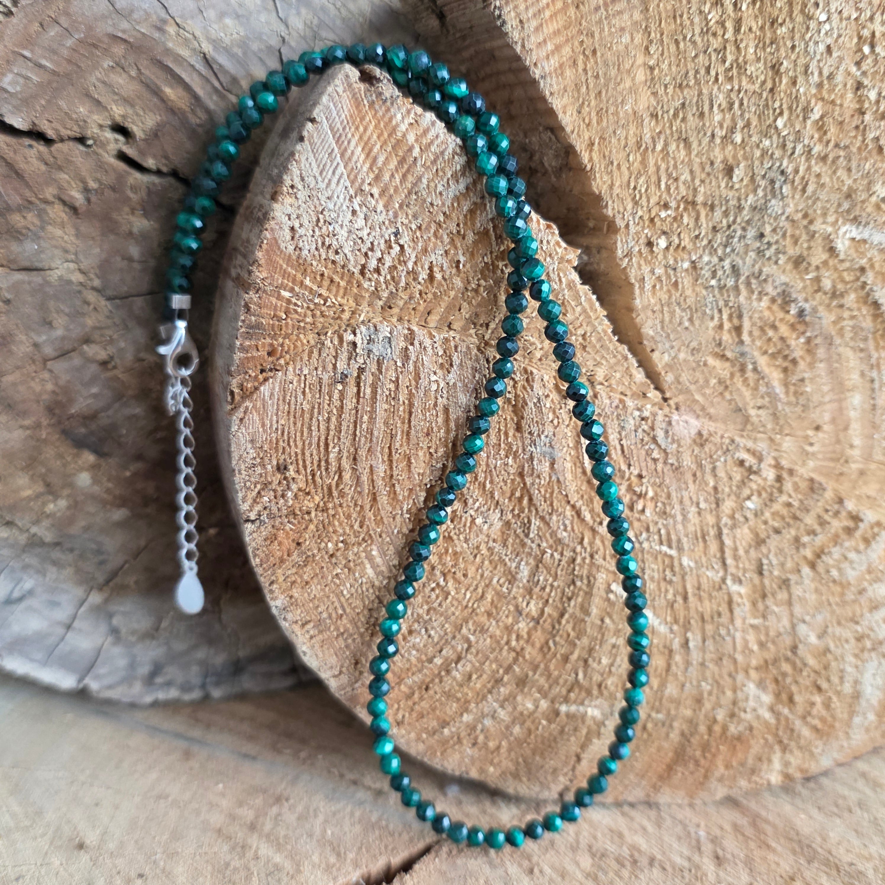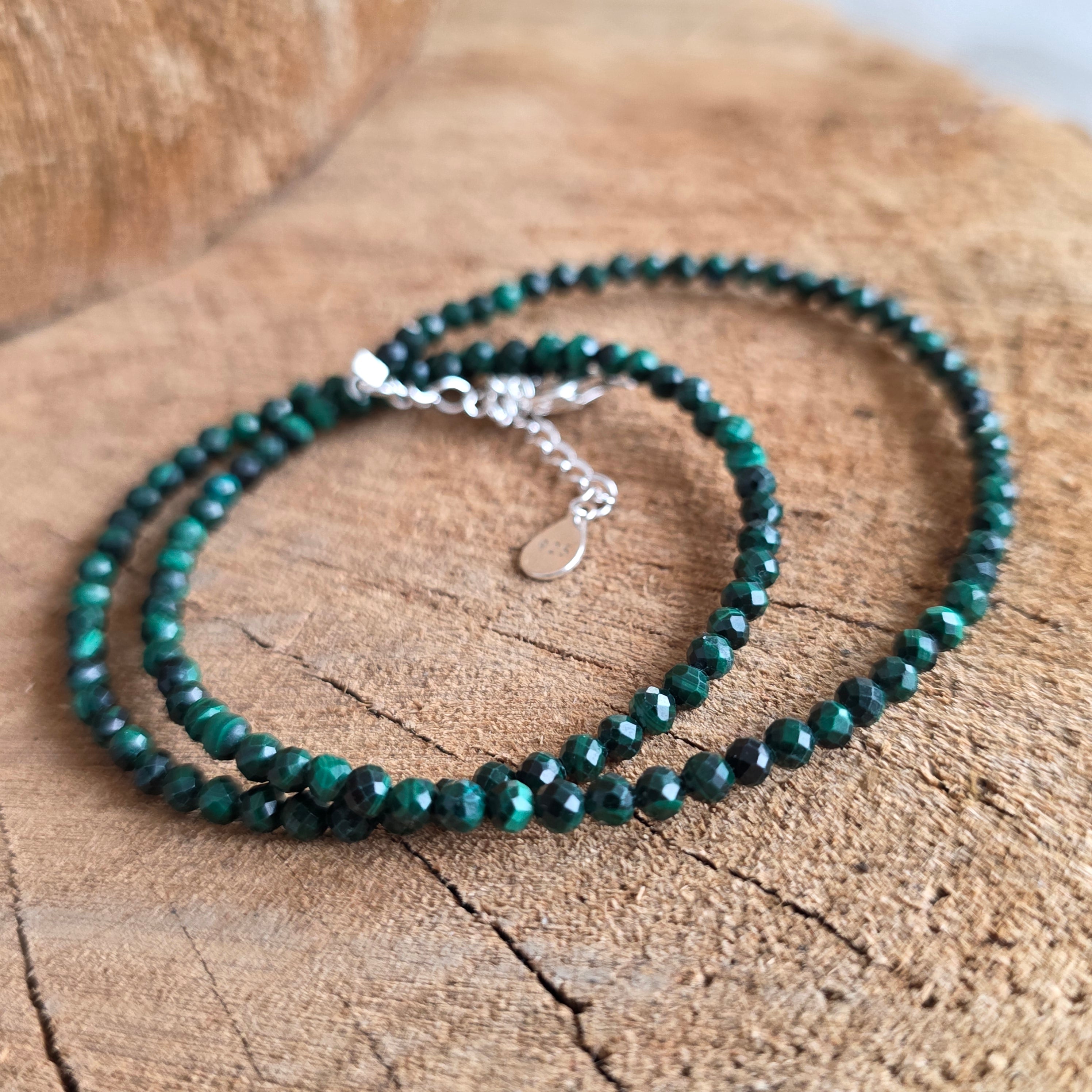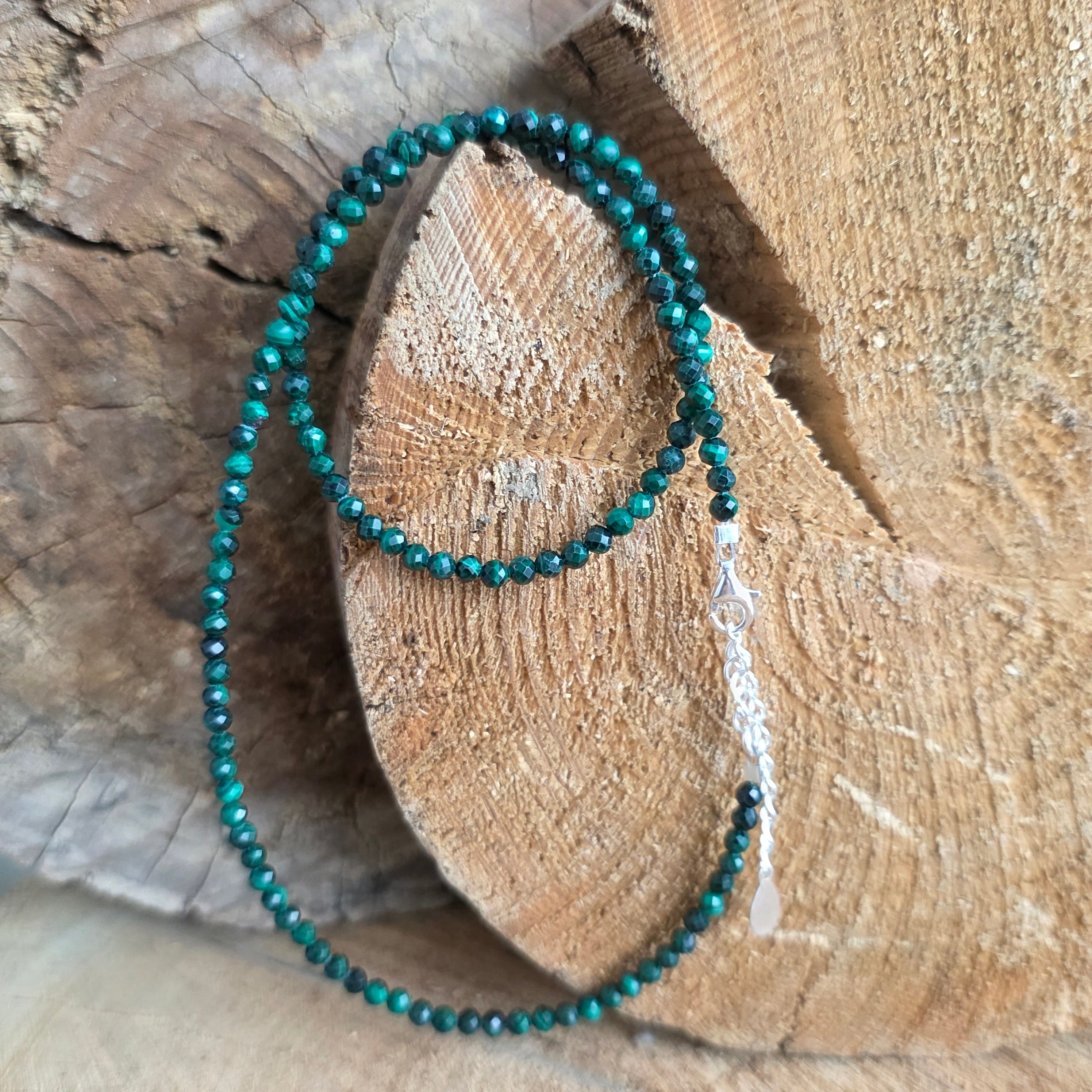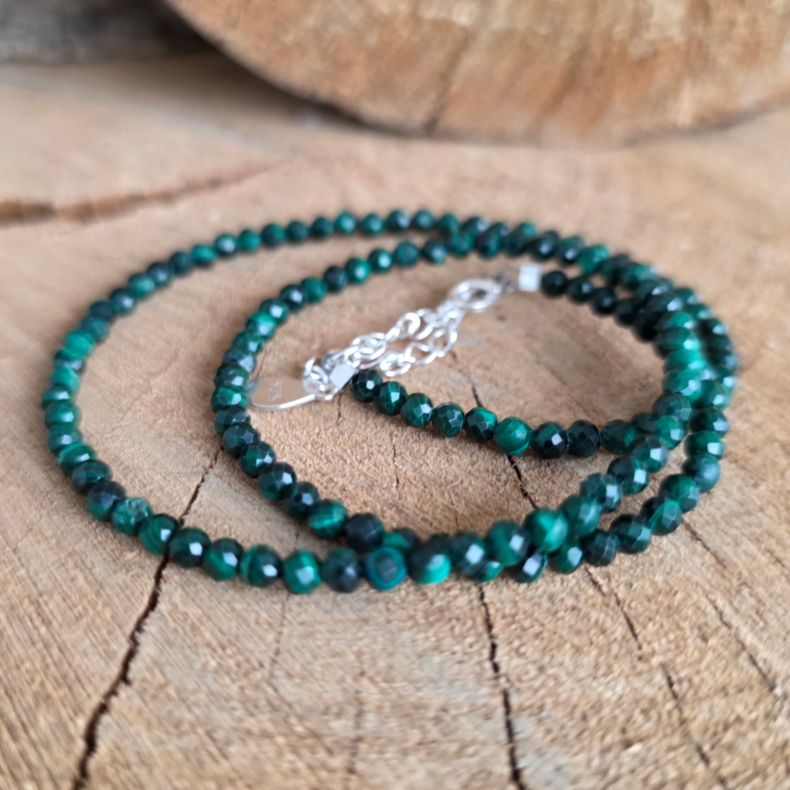 Naszyjnik, który niesie głęboką pieśń ziemi, echo siły i regeneracji. Malachit, ze swoimi intensywnymi zielonymi odcieniami i płynnymi pasami, jest żywym kamieniem — wyrazem przemiany, ochrony i wewnętrznego odrodzenia. Każda fasetowana kulka 2 mm jest światem samym w sobie, tańcem między światłem szmaragdu a cieniem lasu.