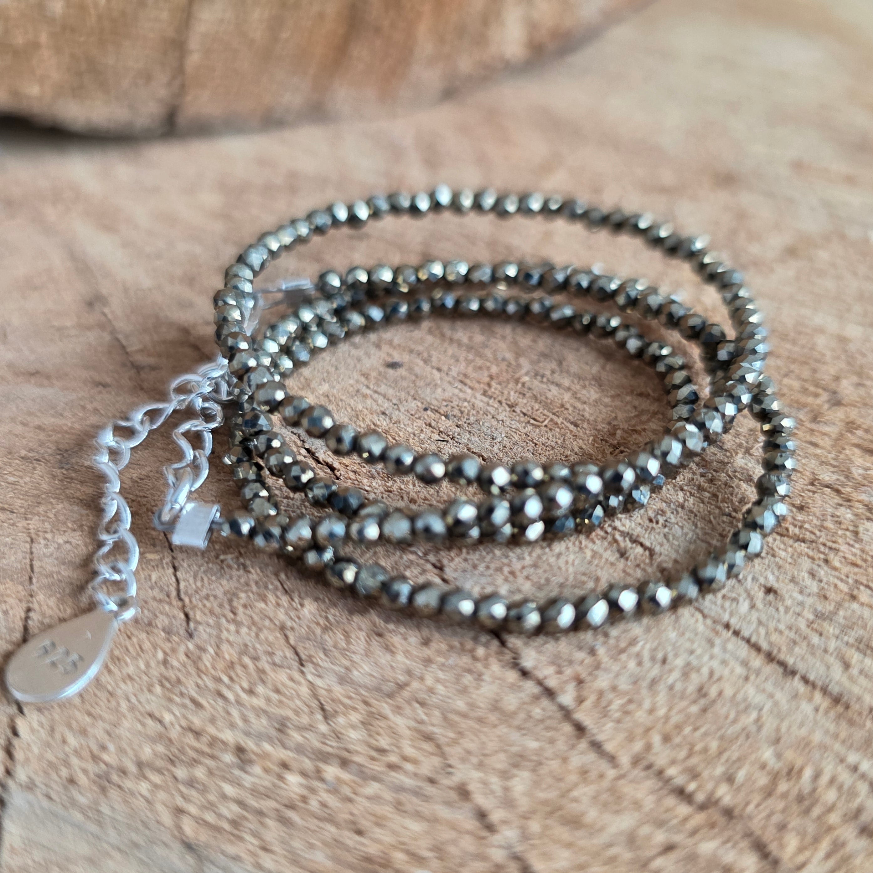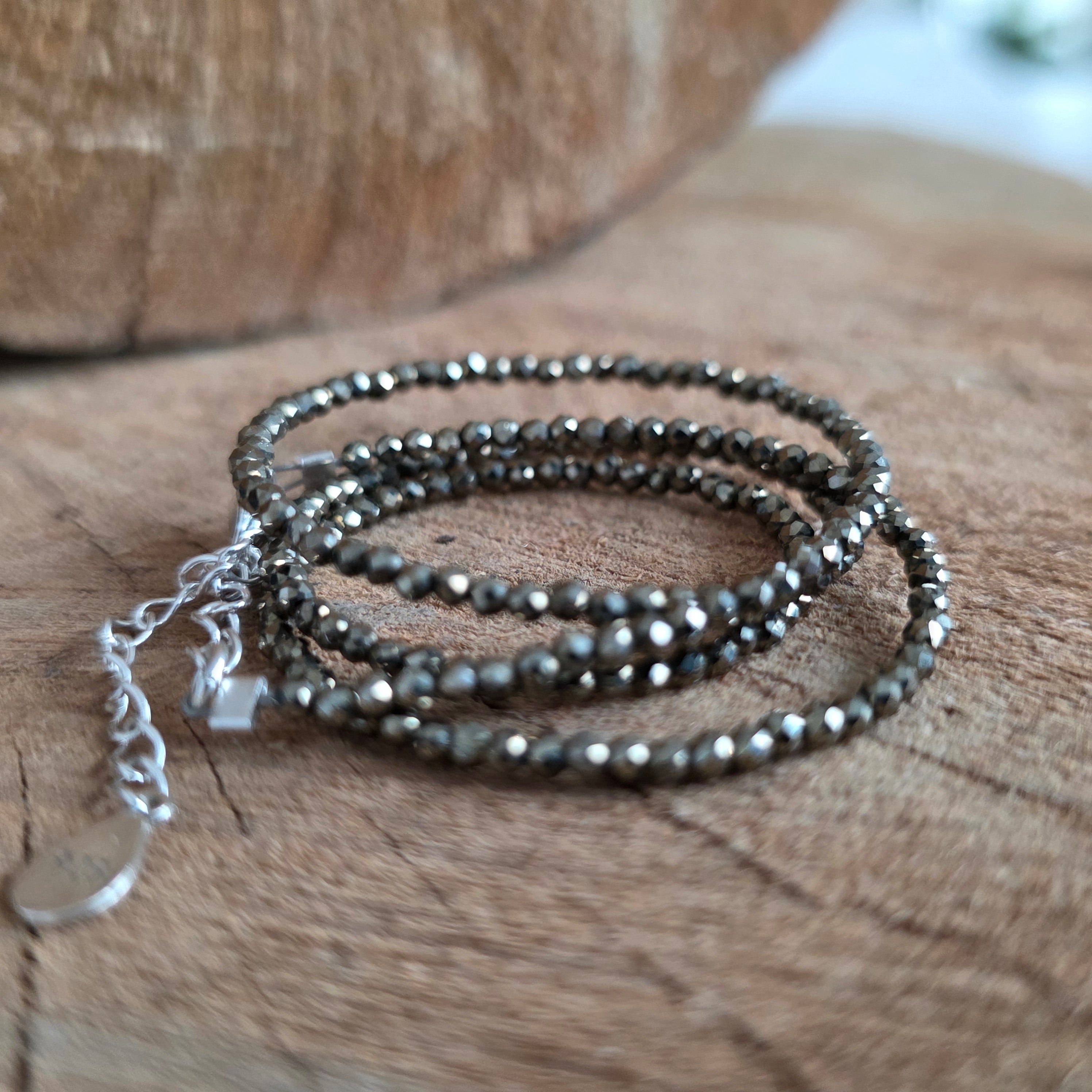Naszyjnik o silnej osobowości i mineralnej elegancji, wykonany z 8 mm kulek pirytu, których metaliczne refleksy załamują światło w subtelnej grze złota i grafitu. Każda kulka ma własny, lekko surowy blask, przypominający o krystalicznej strukturze kamienia i jego pierwotnej sile. To biżuteria, która nie potrzebuje dodatkowych ozdób, by przyciągać uwagę.