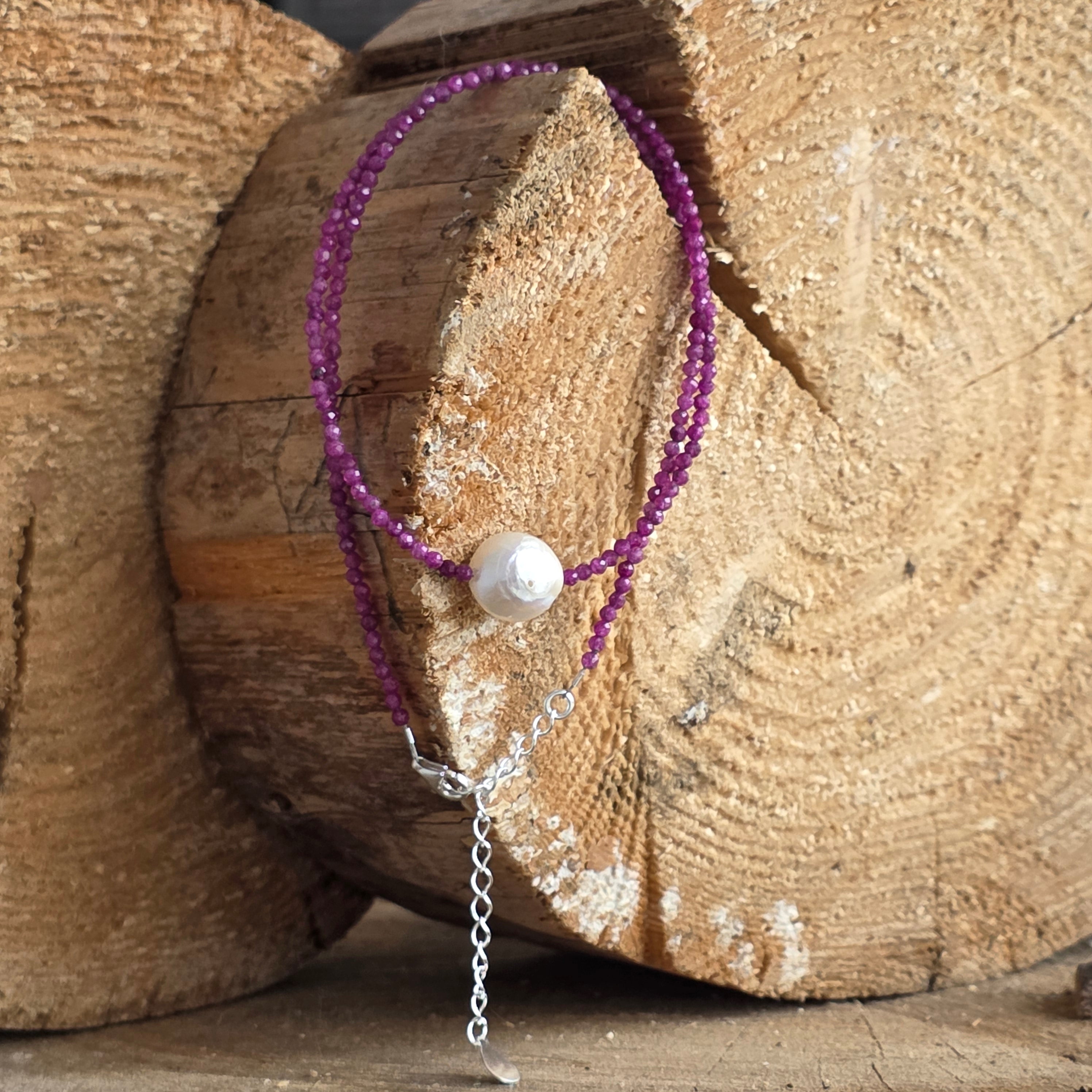 Delikatny, a zarazem wyrazisty naszyjnik, wykonany z fasetowanych kul naturalnego rubinu 2,5 mm, w głębokim odcieniu intensywnej wiśni, z ciepłymi, niemal królewskimi refleksami. Każda mała, dyskretna perełka subtelnie odbija światło, jak szept pasji, zamiaru i wewnętrznej szlachetności.