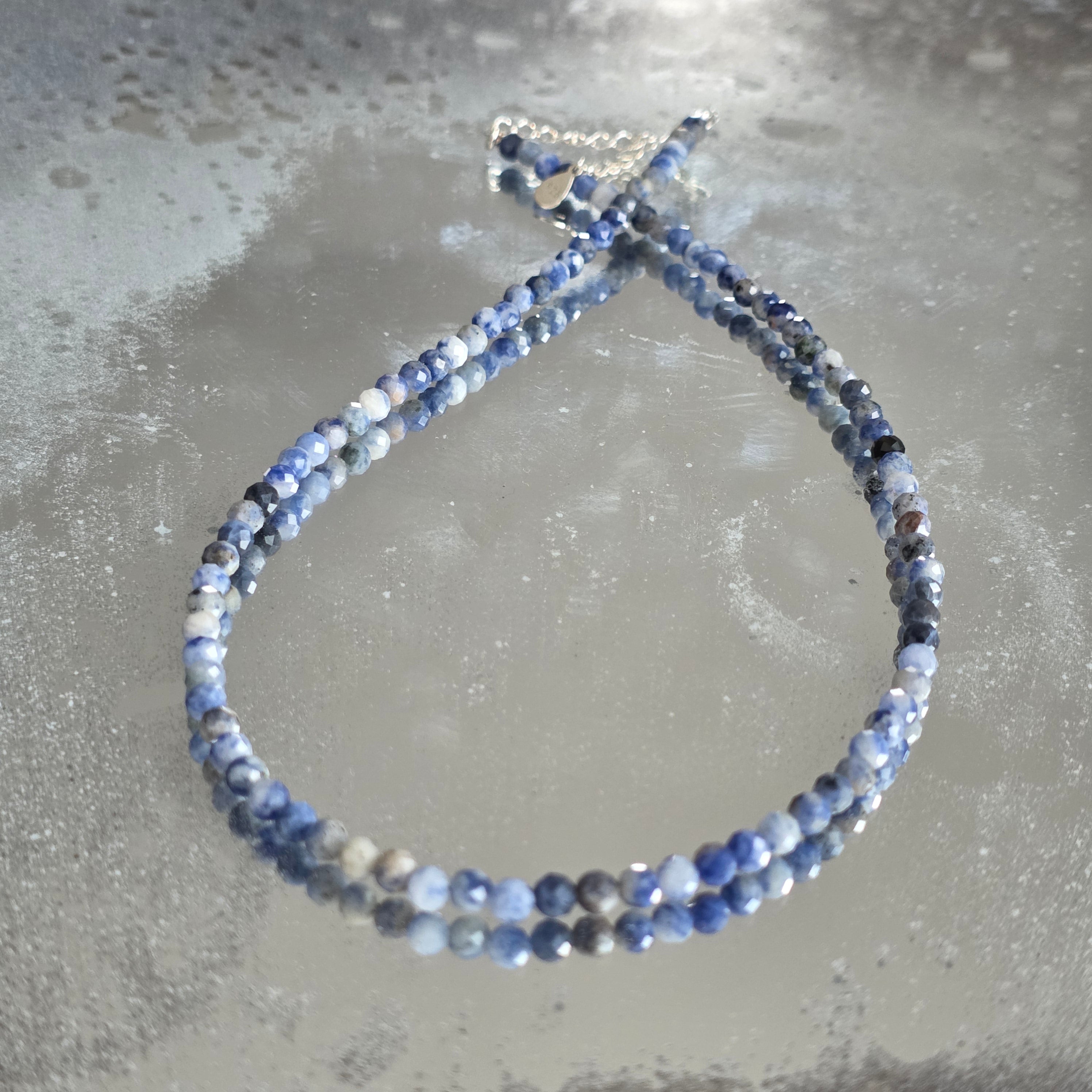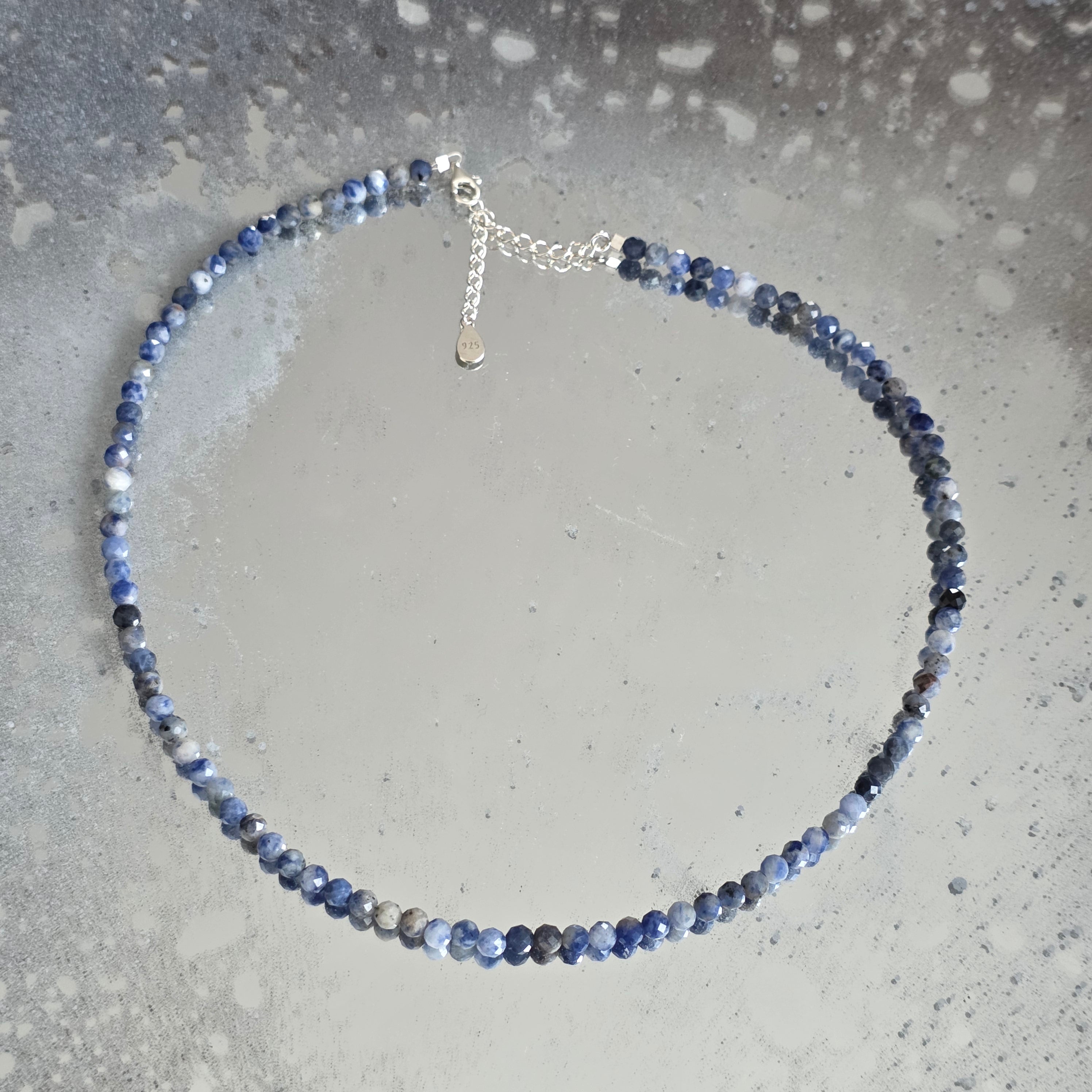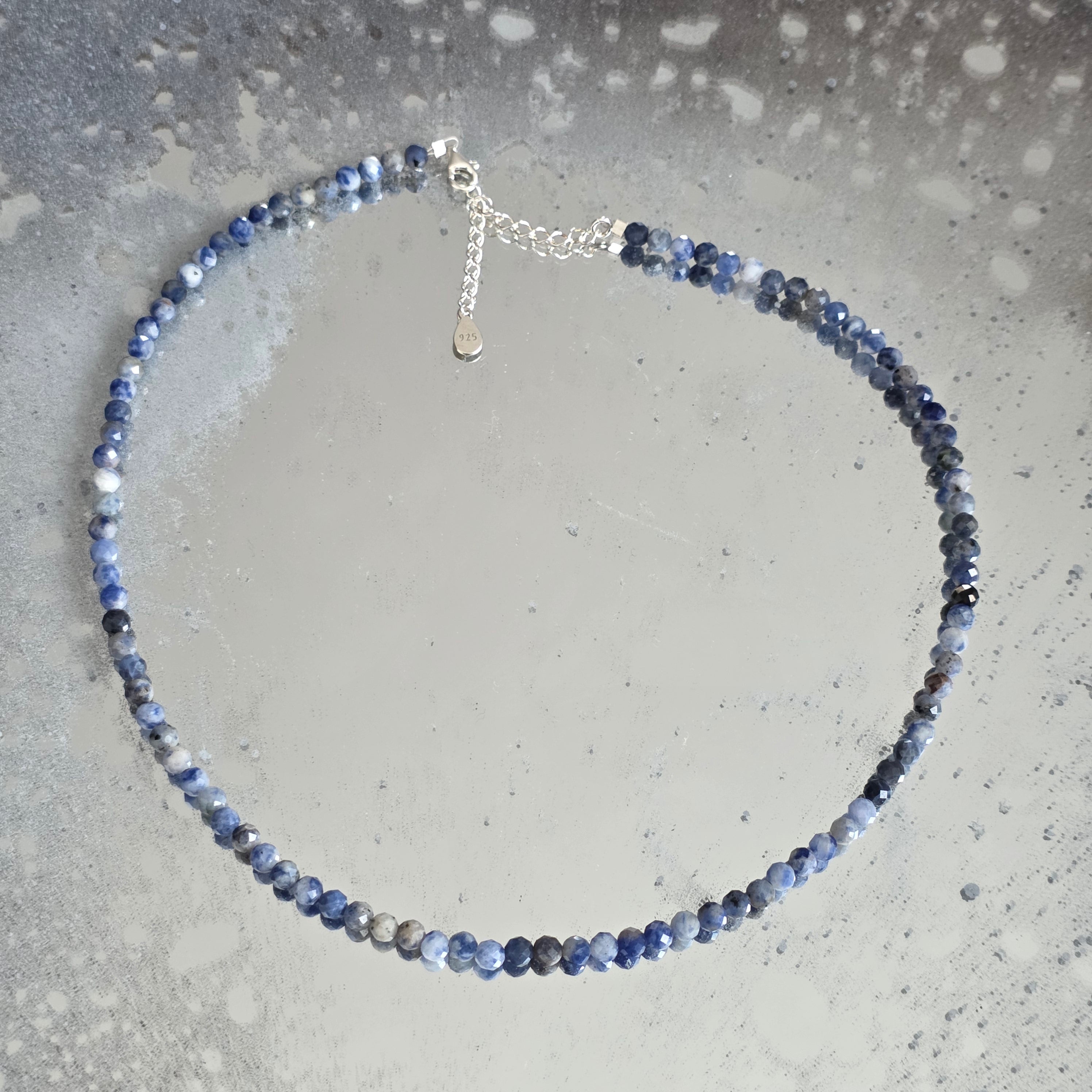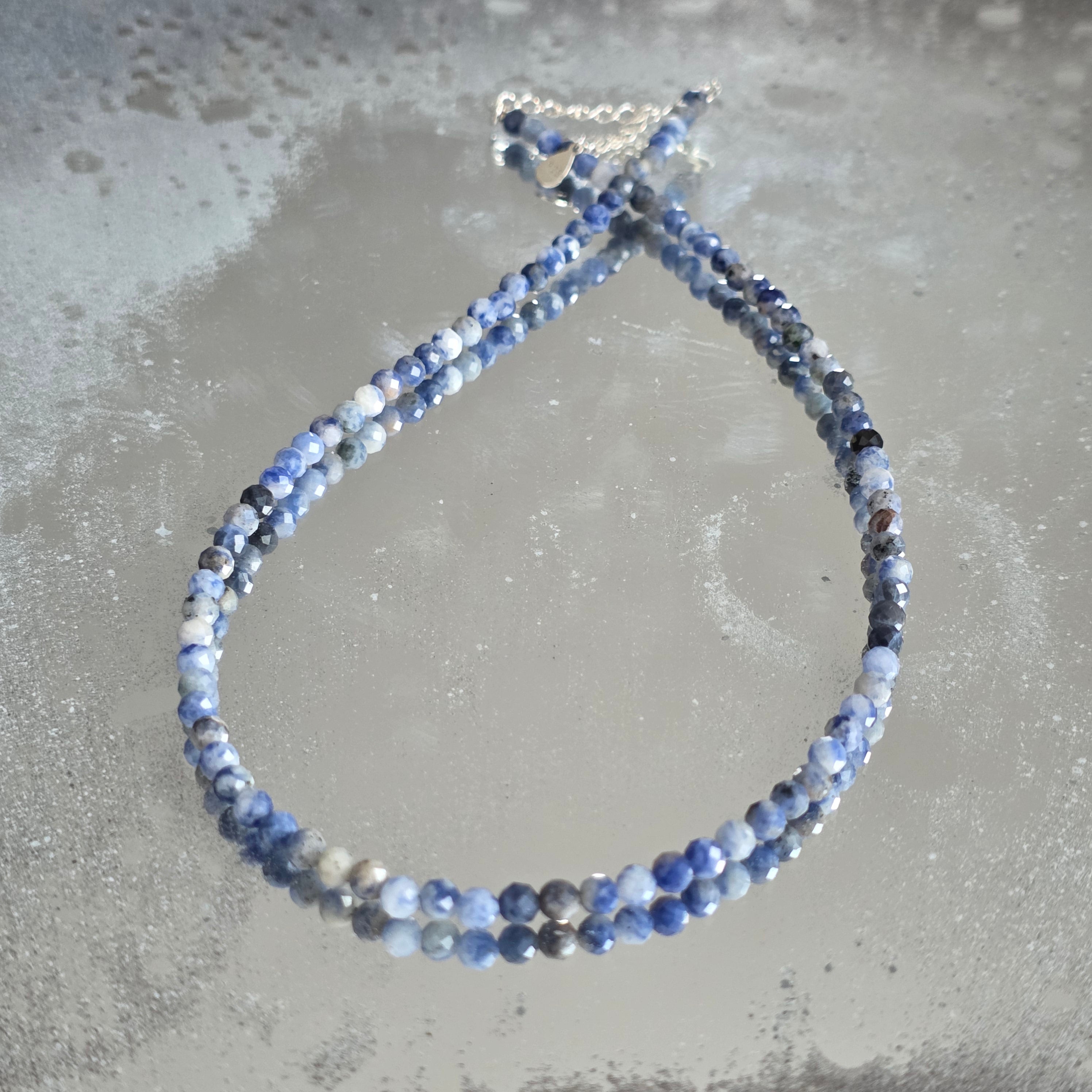 Naszyjnik, który niesie spokój nieba i głębię jasnego myślenia. Naturalny sodalit fasetowany 4 mm łączy odcienie głębokiego niebieskiego z delikatnymi białymi i szarymi żyłkami, w eleganckiej i kojącej grze wizualnej. Drobne fasety subtelnie odbijają światło, nadając biżuterii subtelny blask, idealnie wyważony między wyrafinowaniem a naturalnością.