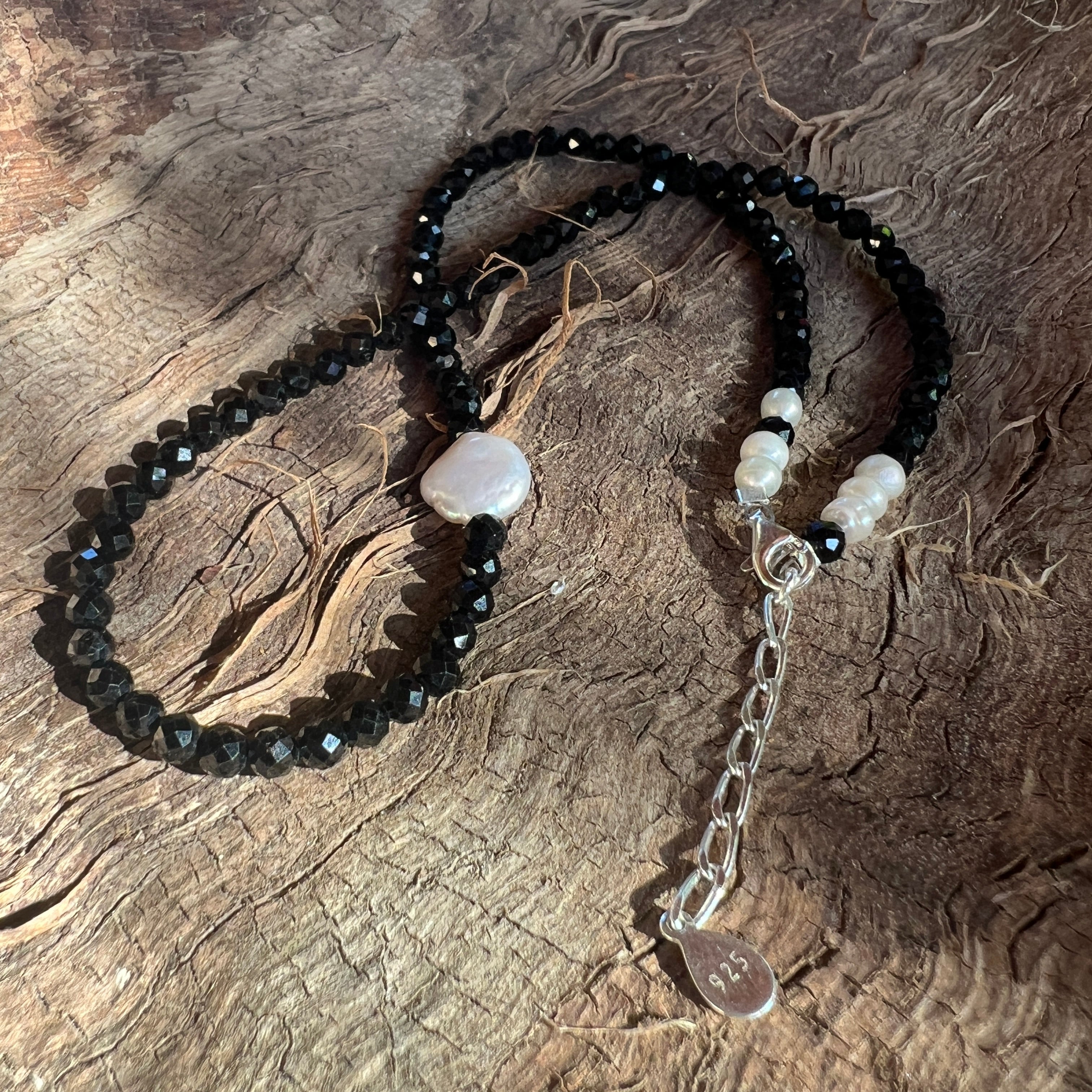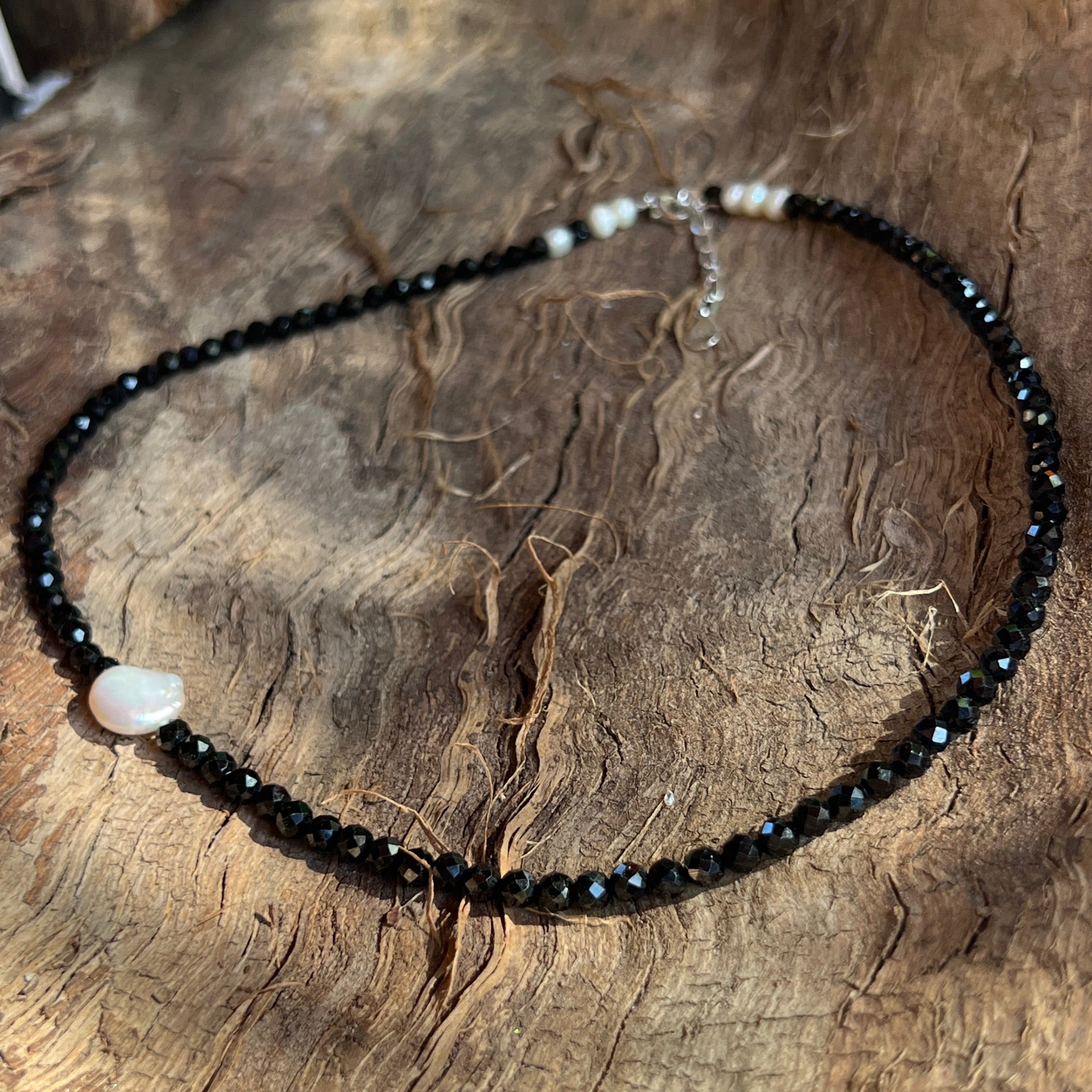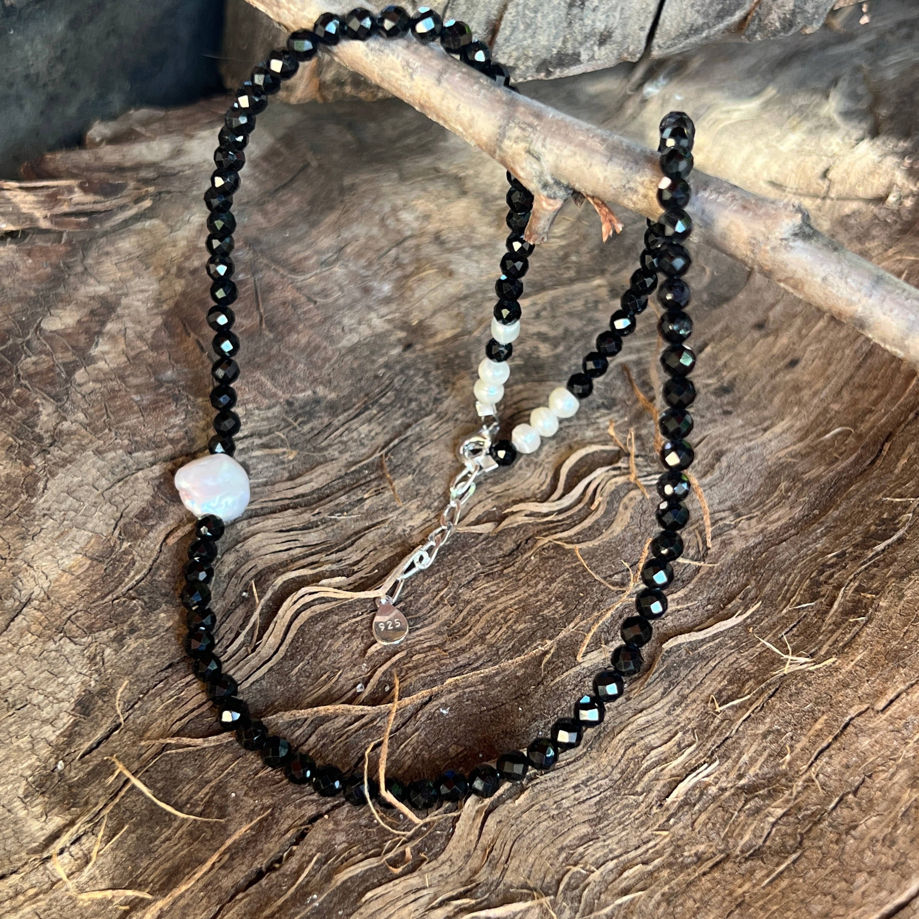 Wykonane z 4 mm naturalny spinel, z fascynującymi odcieniami głębokich czarnych i metalicznych odbicia, które wychwytują światło, naszyjnik jest wzbogacony delikatne akcenty kamieni szlachetnych, każdy dodaje subtelnego kontrastu i wyrafinowanej gry kolorów. Akcenty te są starannie umieszczane w celu zintensyfikowania naturalnego piękna kręgosłupa i dodania magii biżuterii.