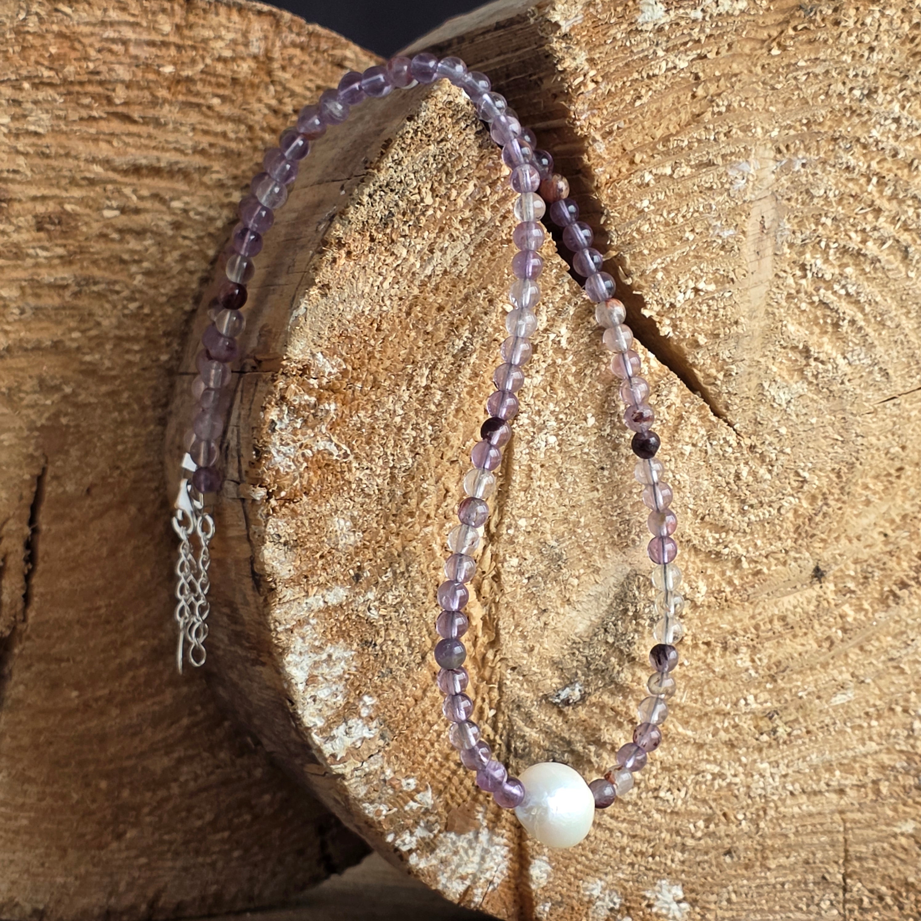 Materiały: Naturalny Super Seven, kulki 4 mm, perła akcentowa 1 cm, srebro 925