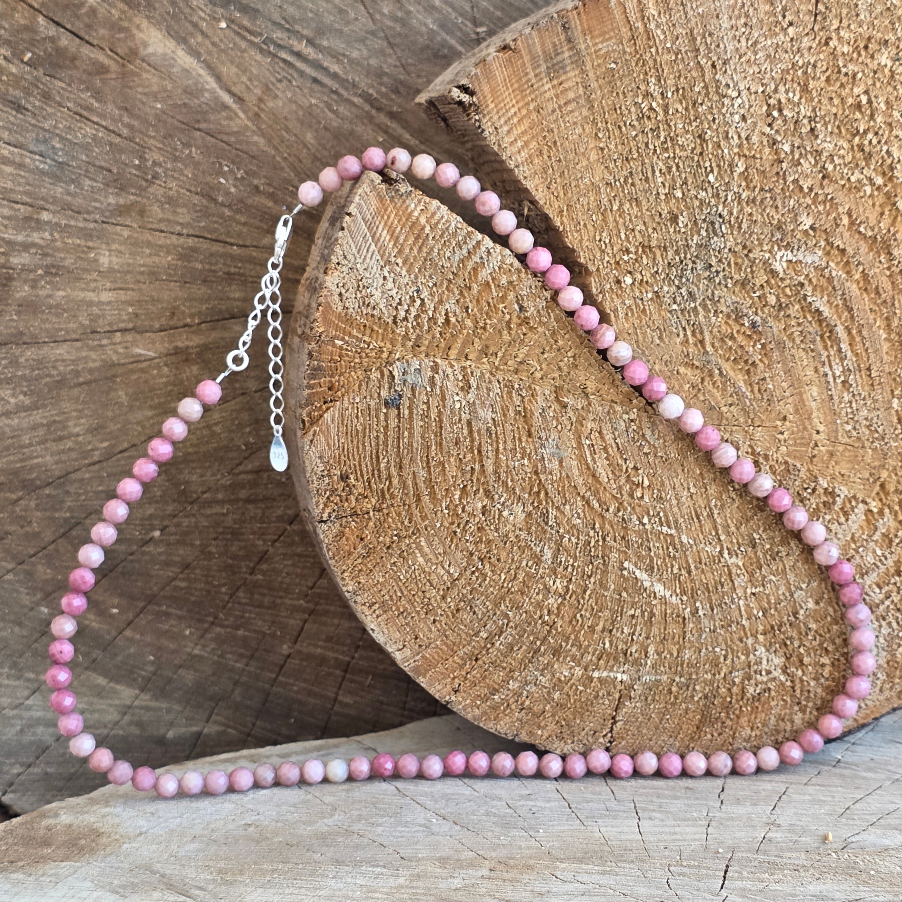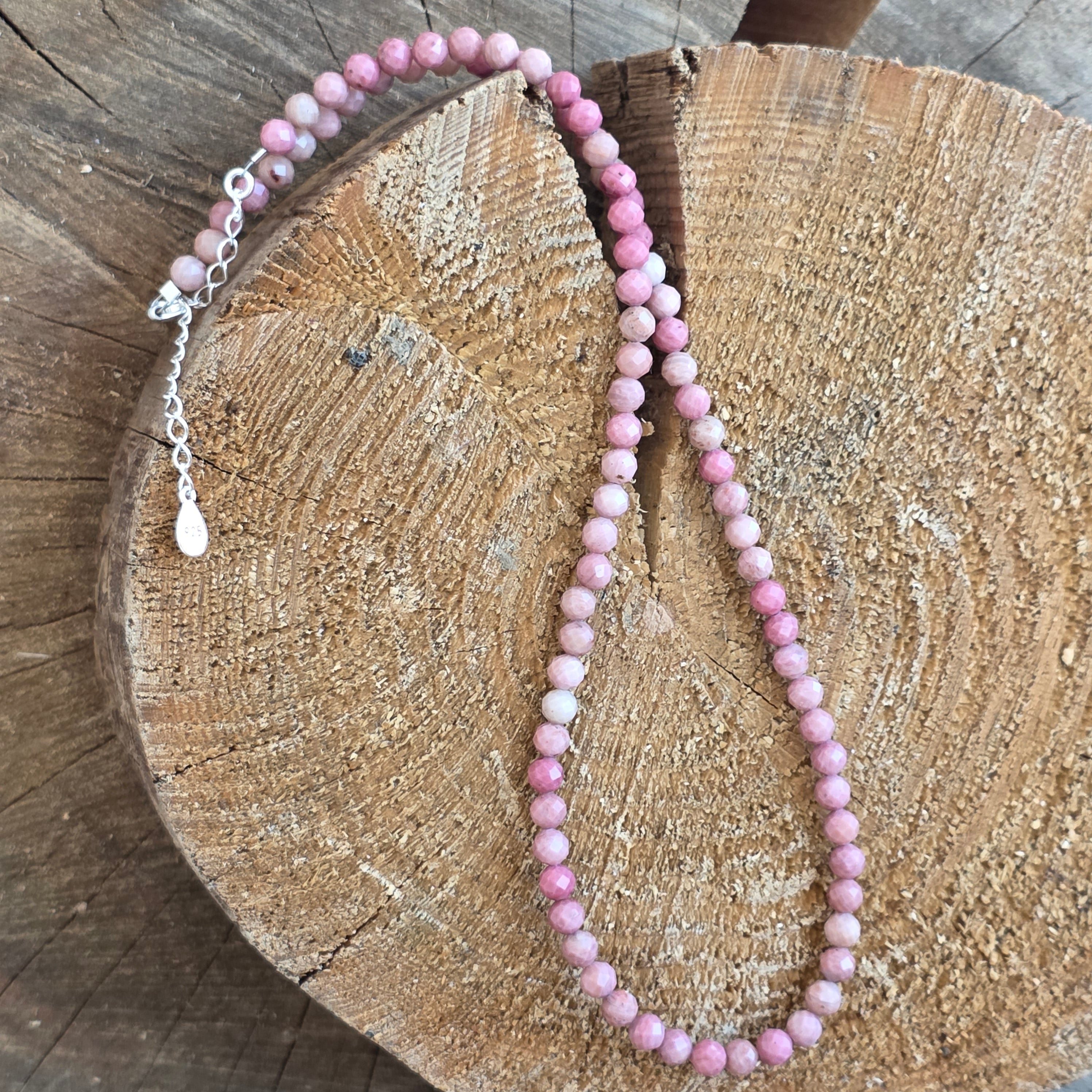 Delikatny i świetlisty naszyjnik wykonany z fasetowanych 3 mm koralików różowego opalu, tworzący subtelną i harmonijną linię wokół szyi. Łagodne mleczne odcienie różu, z dyskretnymi refleksami i nieco przezroczystą fakturą, nadają biżuterii ciepły i wyrafinowany charakter. Subtelne fasetowanie dodaje głębi i stonowanego blasku, nie dominując, zachowując elegancką równowagę wizualną.