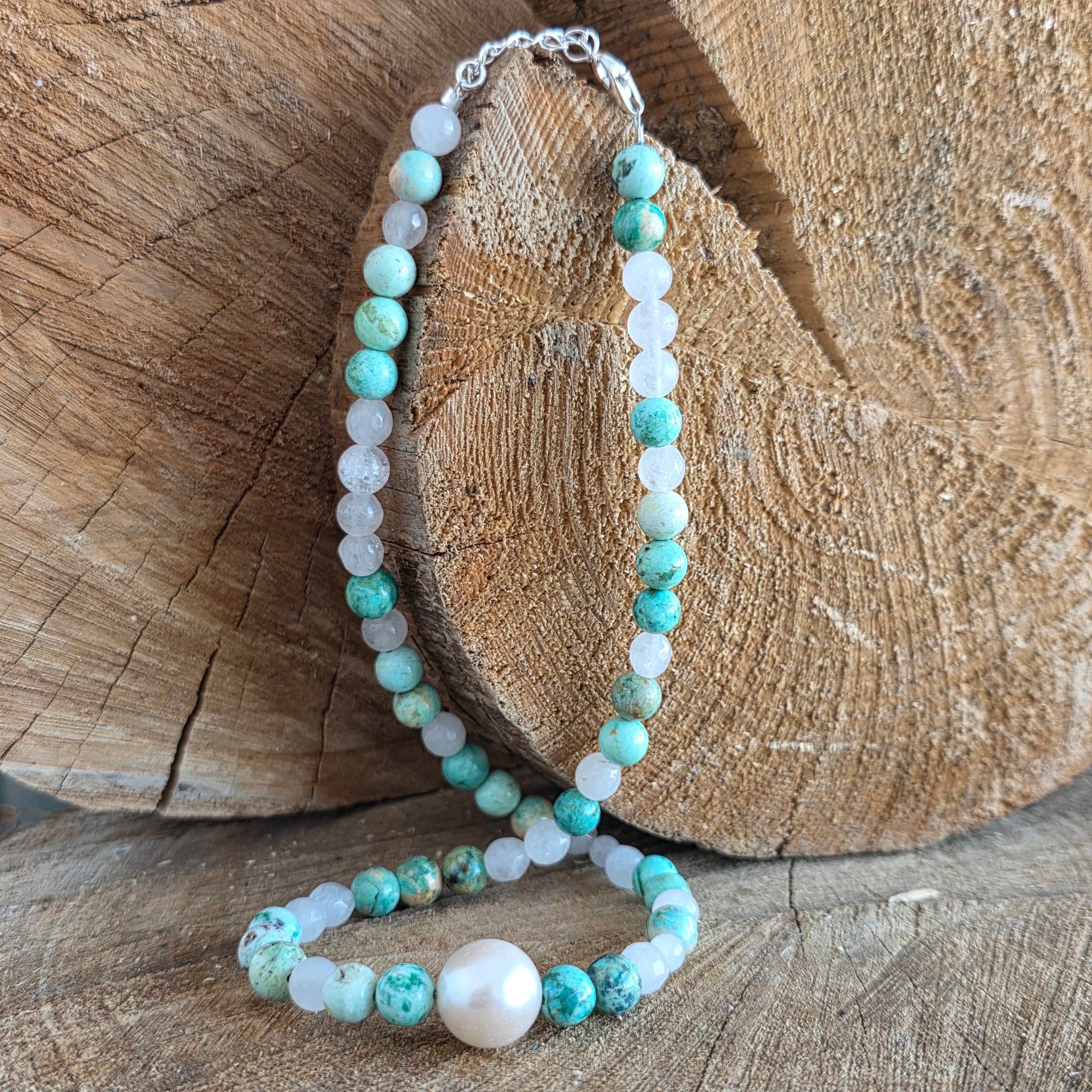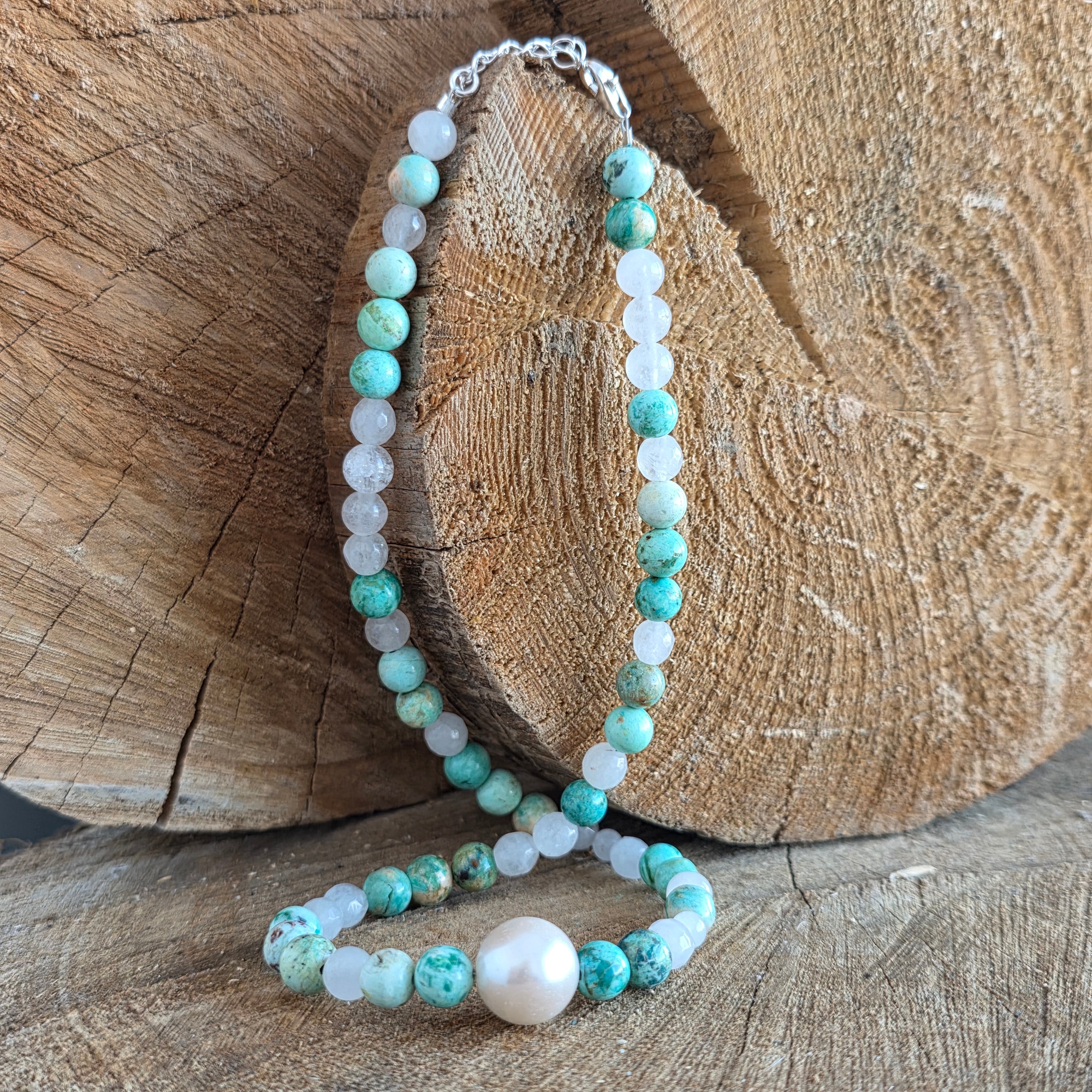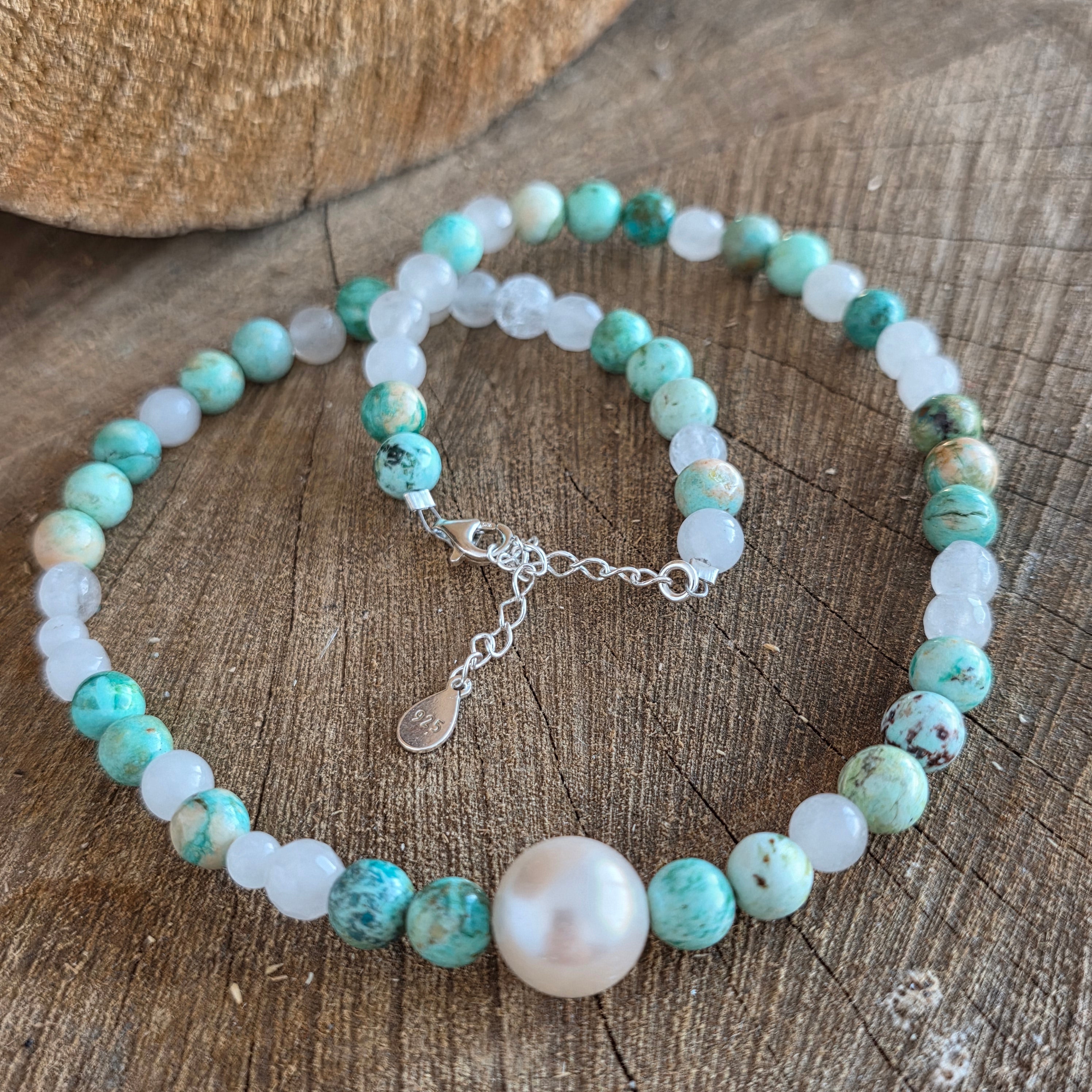 Naturalne perły dodają nutę subtelności i klasycznej elegancji, tworząc harmonijny kontrast między organiczną fakturą a nowoczesną geometrią turkusu. Razem te elementy tworzą uniwersalną biżuterię, odpowiednią zarówno na codzienne stylizacje, jak i na eleganckie okazje.