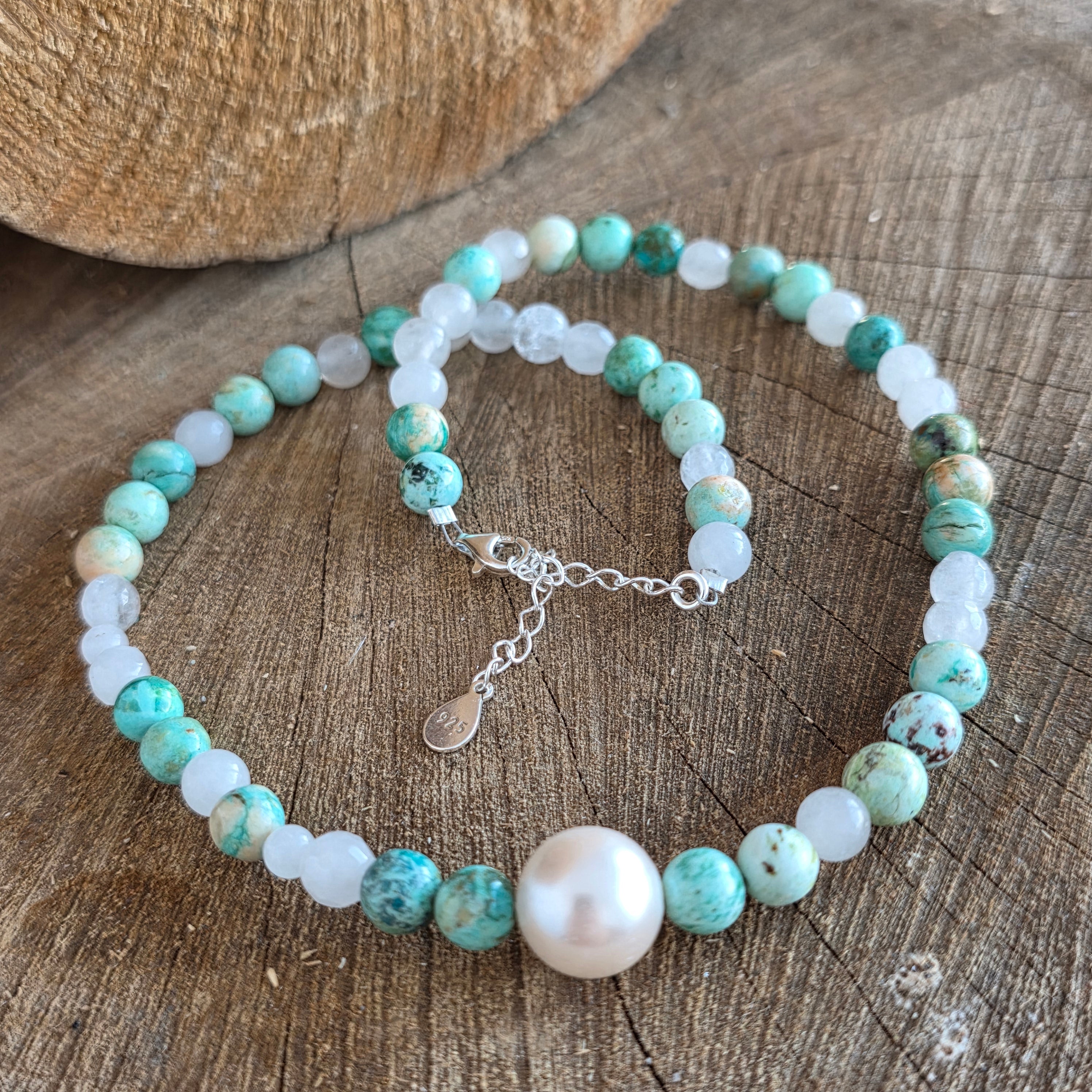 Ten naszyjnik łączy świeżość naturalnego turkusu z delikatnością naturalnych pereł, w wyważonym i świetlistym designie. Turkusowe fasetowane kostki o rozmiarze 3 mm subtelnie odbijają światło i podkreślają intensywne odcienie charakterystyczne dla tego cenionego od starożytności kamienia.