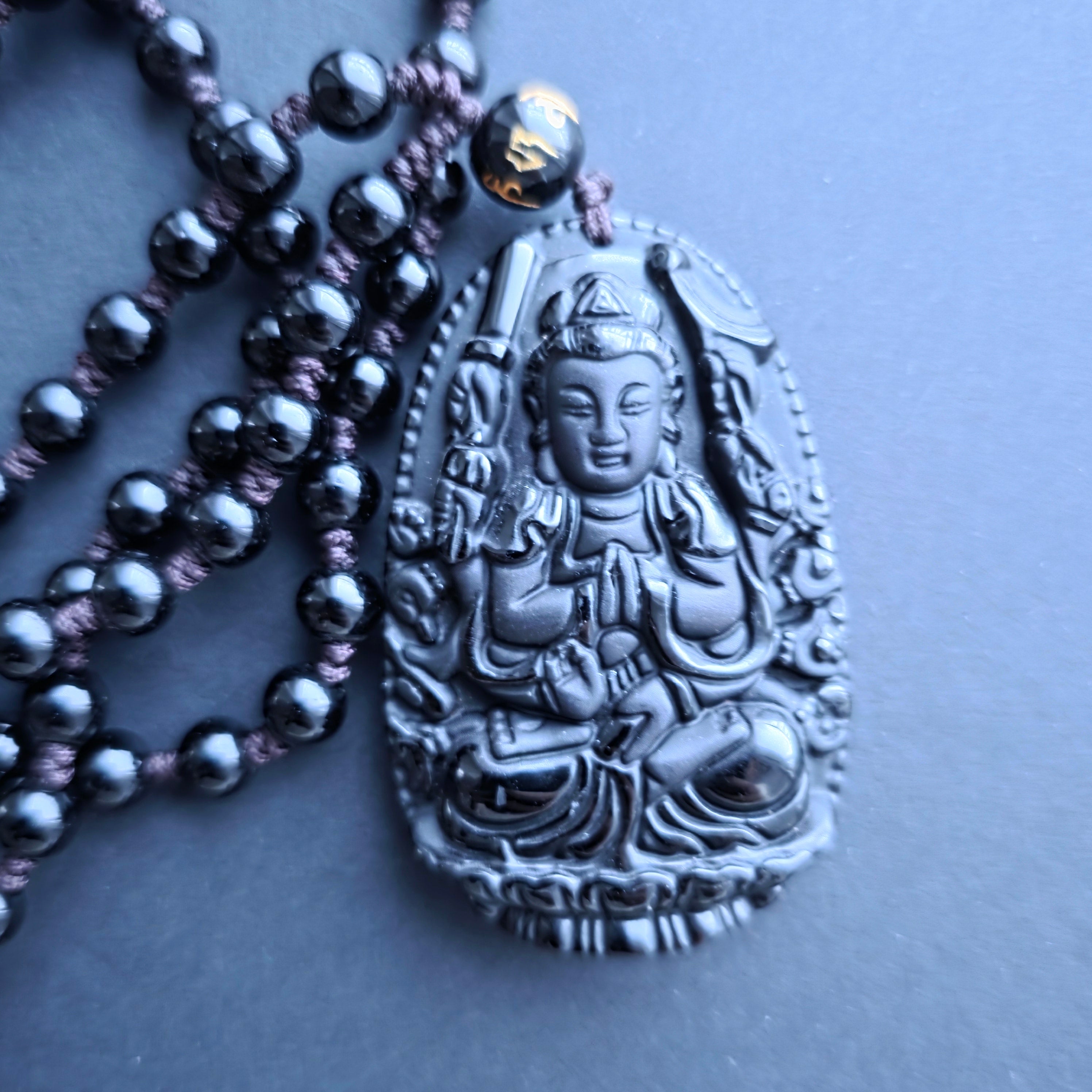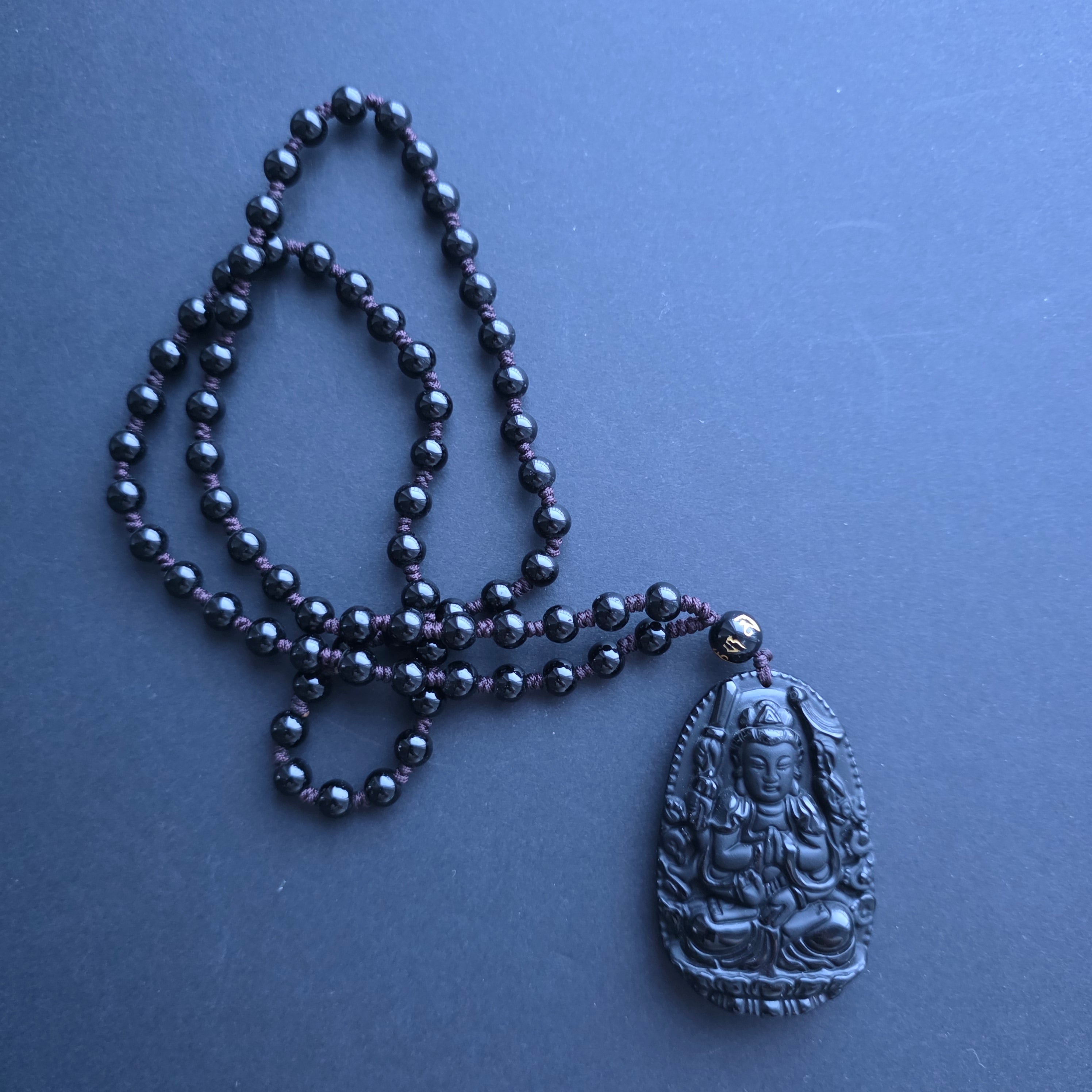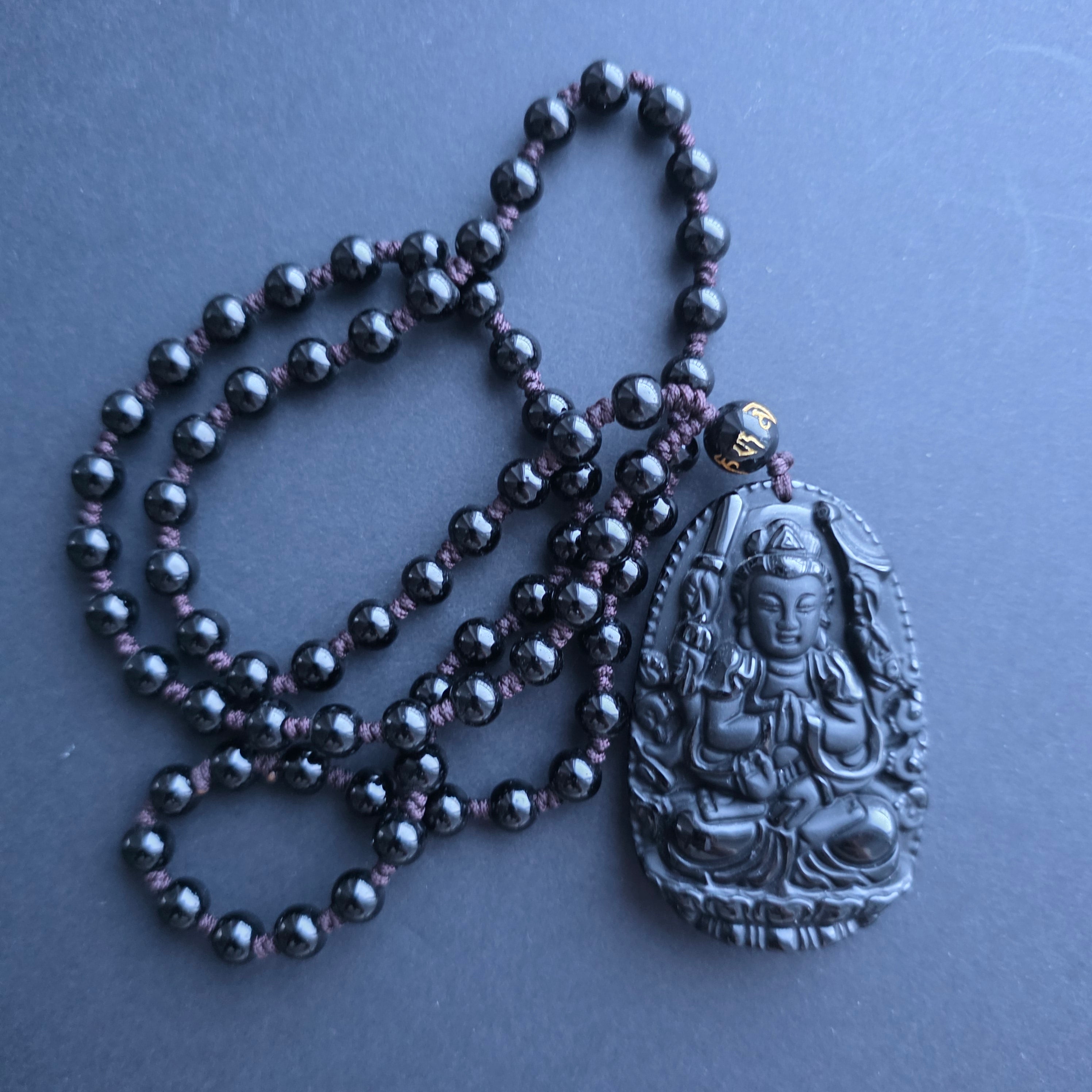 Naszyjnik z amuletem z czarnego obsydianu | Modlący się Budda