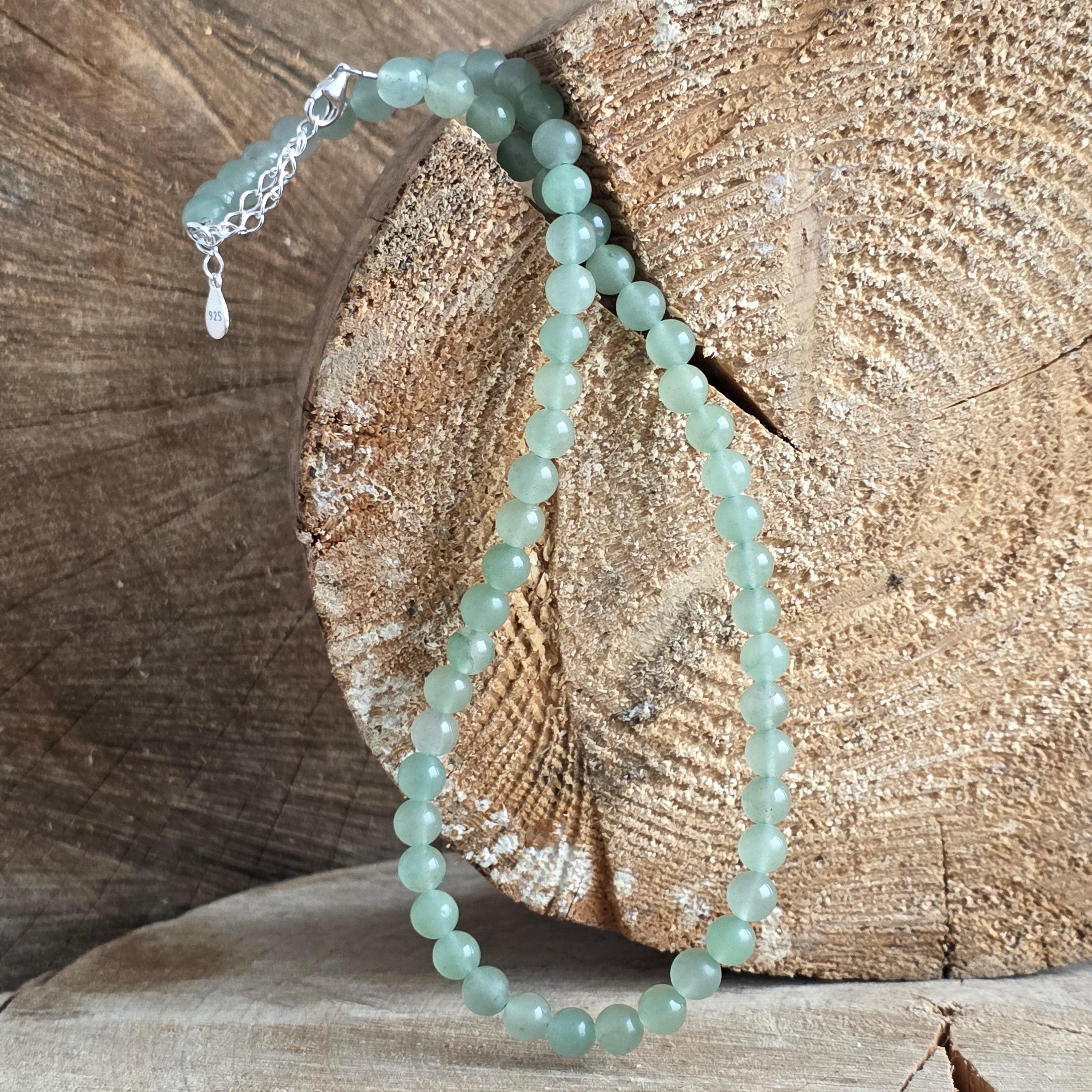 Naszyjnik niosący energię świeżości i łagodnego szczęścia. Naturalny zielony awenturyn 6 mm emituje spokojne i zrównoważone światło, przywodząc na myśl młode liście i ciszę natury po deszczu. Gładka i błyszcząca powierzchnia kamieni daje poczucie harmonii wizualnej, a srebro 925 doskonale dopełnia projekt eleganckim akcentem.