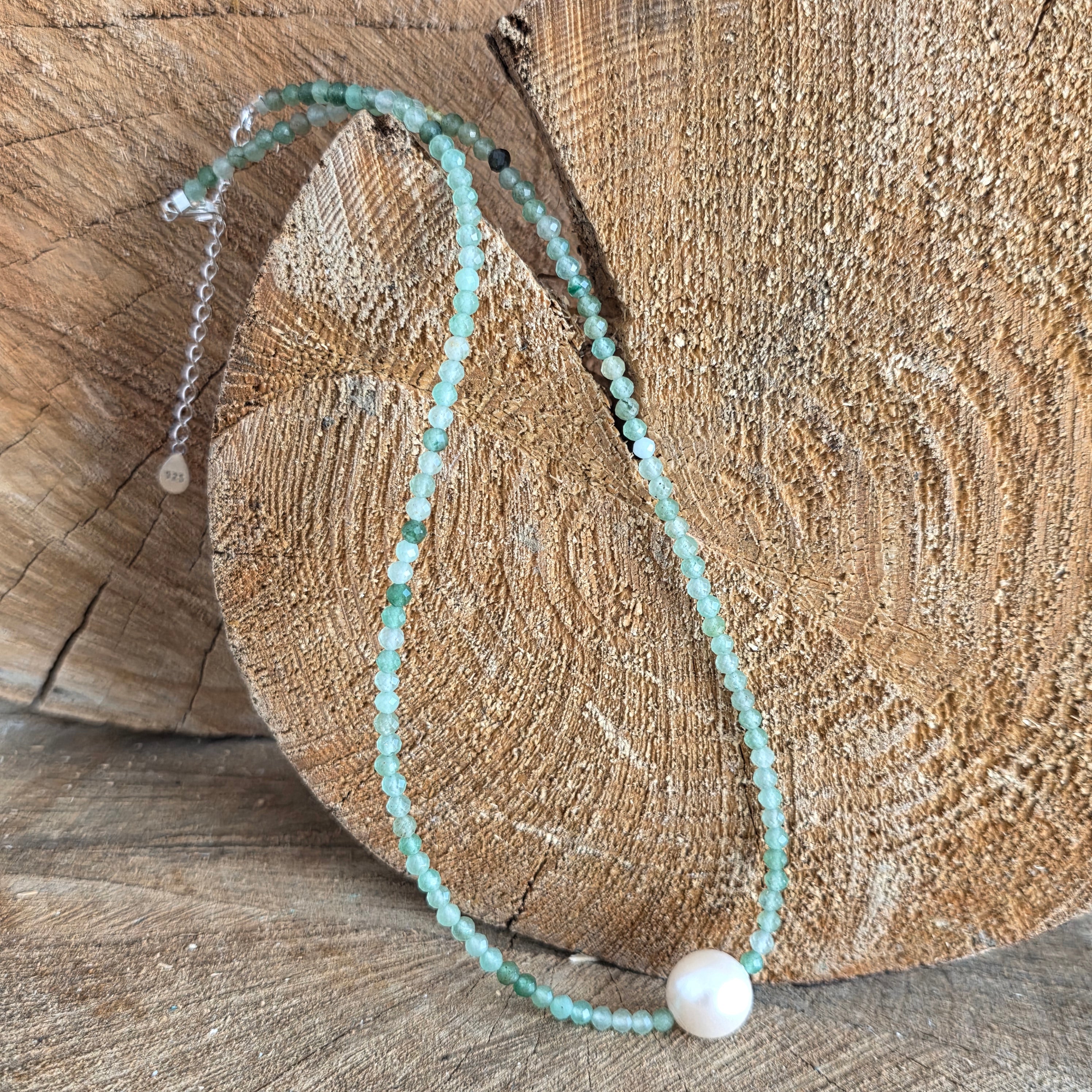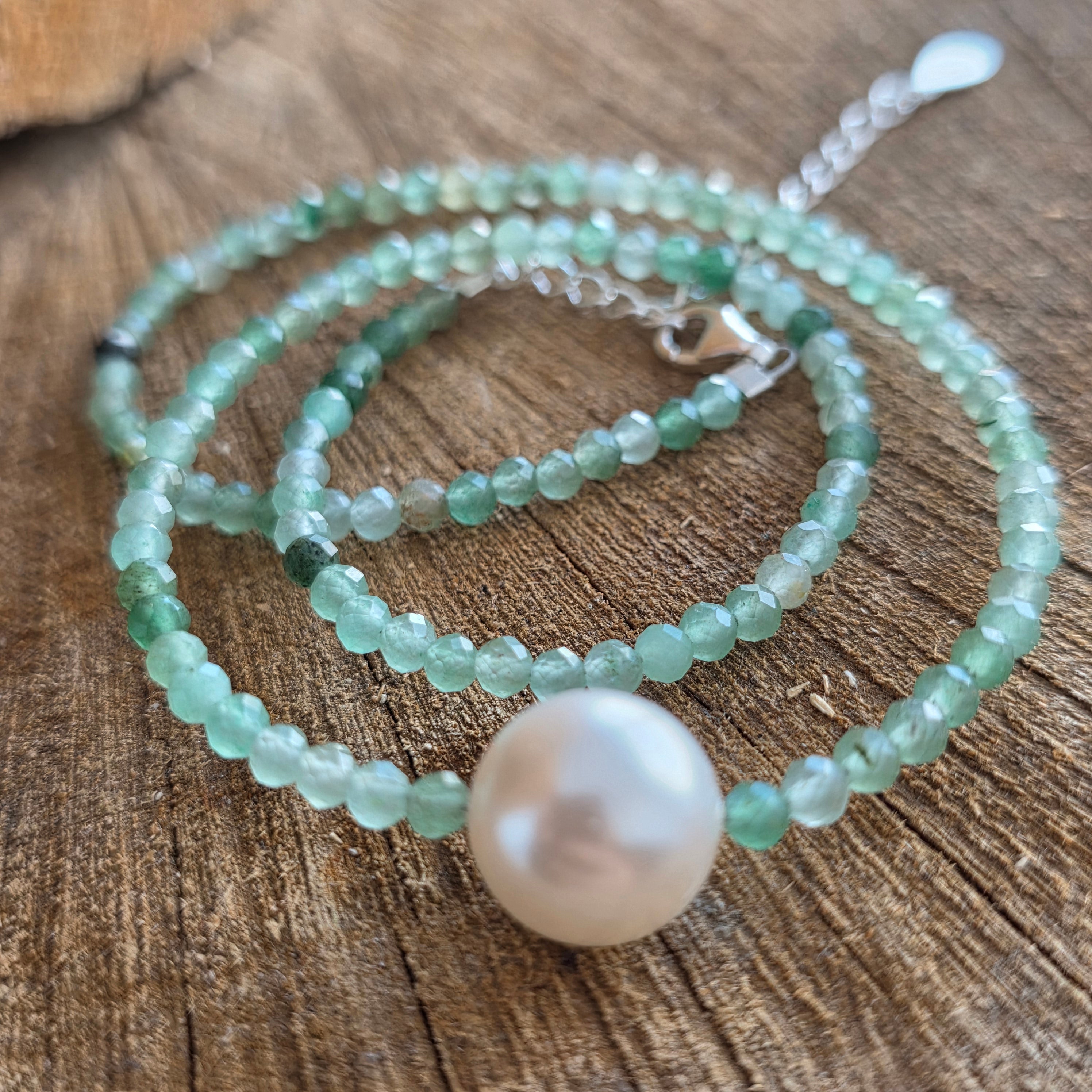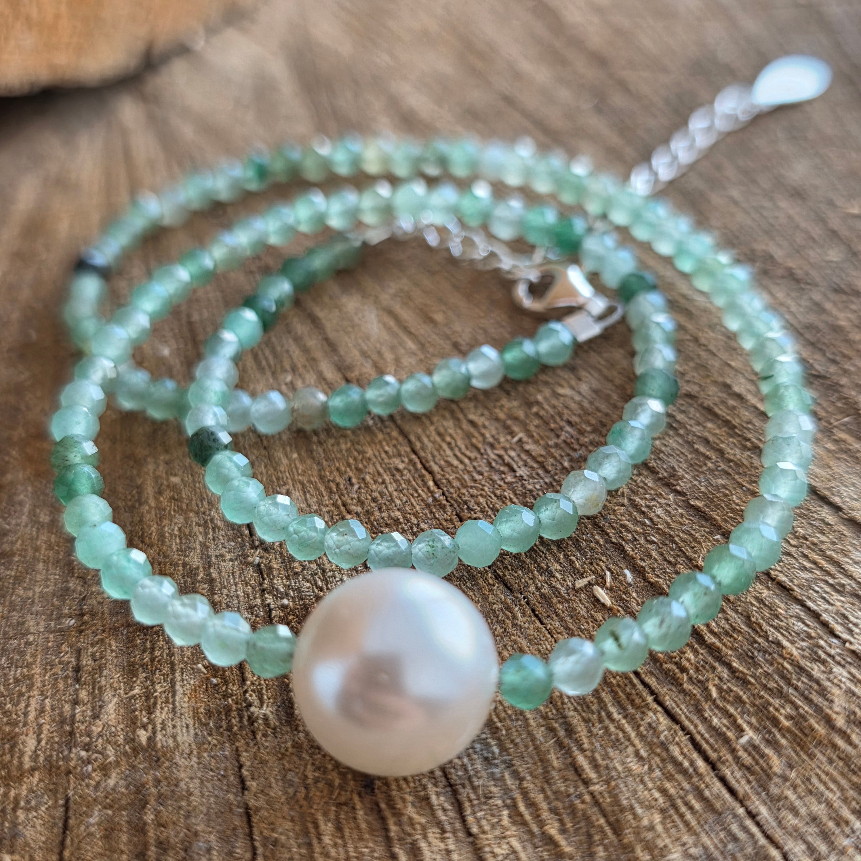 Naszyjnik, który niesie energię świeżości i pogodnego szczęścia, niczym światło tańczące na porannych liściach. Awenturyn, ze swoimi spokojnymi odcieniami zieleni i subtelnymi refleksami, jest znany jako kamień szczęścia, obfitości i zaufania do życia.
