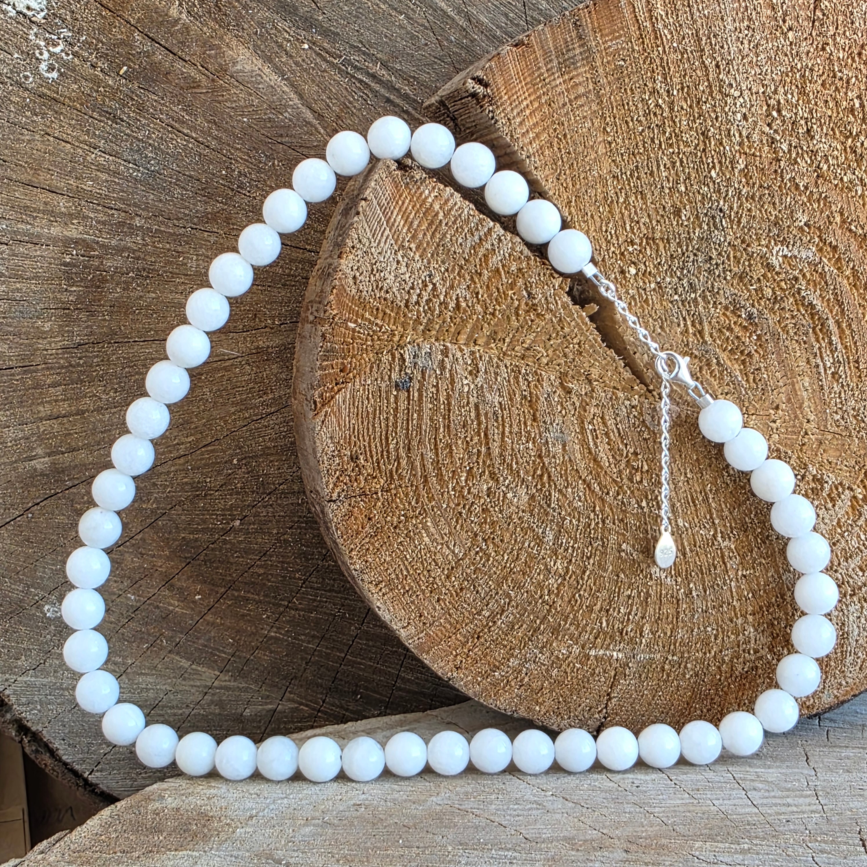 Naszyjnik o spokojnej i wysublimowanej prezencji, wykonany z fasetowanych kulek białego jadeitu 6 mm, które harmonijnie układają się wokół szyi, tworząc zrównoważoną i świetlistą linię. Mleczna biel, czasem lekko przejrzysta, nadaje kamieniowi czysty i uporządkowany wyraz, a delikatne fasetowanie dodaje subtelnych refleksów, które podkreślają naturalną fakturę, nie przytłaczając wizualnie biżuterii. Projekt jest czysty i ponadczasowy, odpowiedni do codziennego noszenia lub jako elegancki akcent.