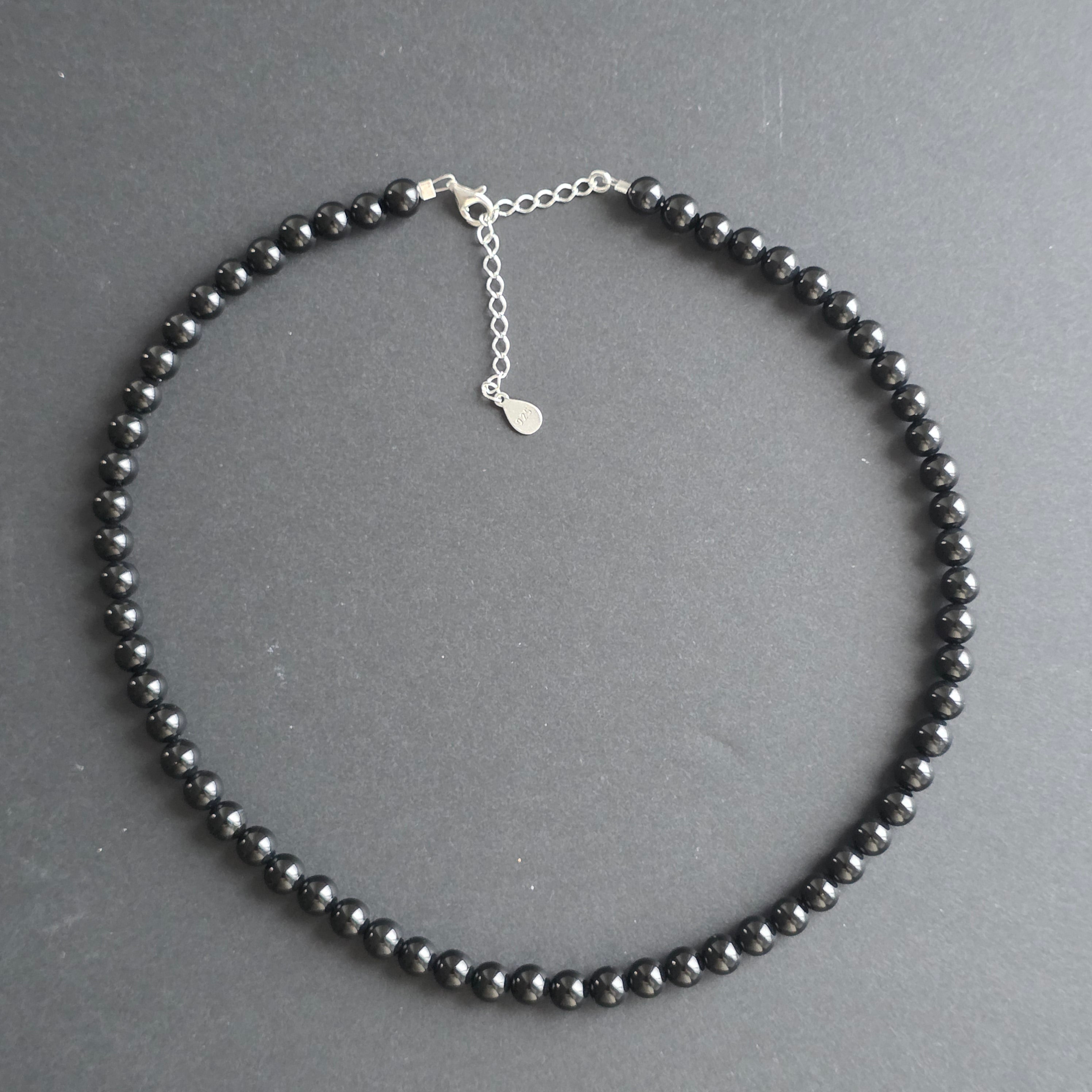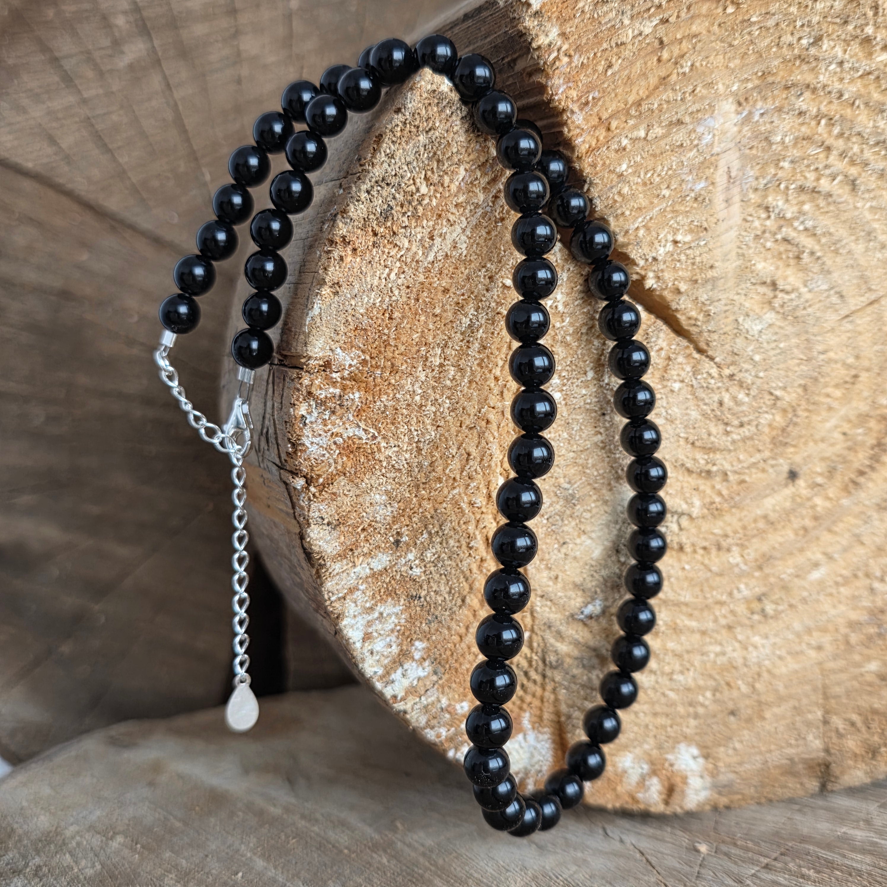 Naszyjnik niczym spokojna noc, w której pełnia księżyca świeci nad cichym światem. Gładkie kule z czarnego onyksu o średnicy 6 mm kreślą linię siły i tajemnicy, ochronne koło, które pochłania hałas świata i pozostawia miejsce dla obecności.