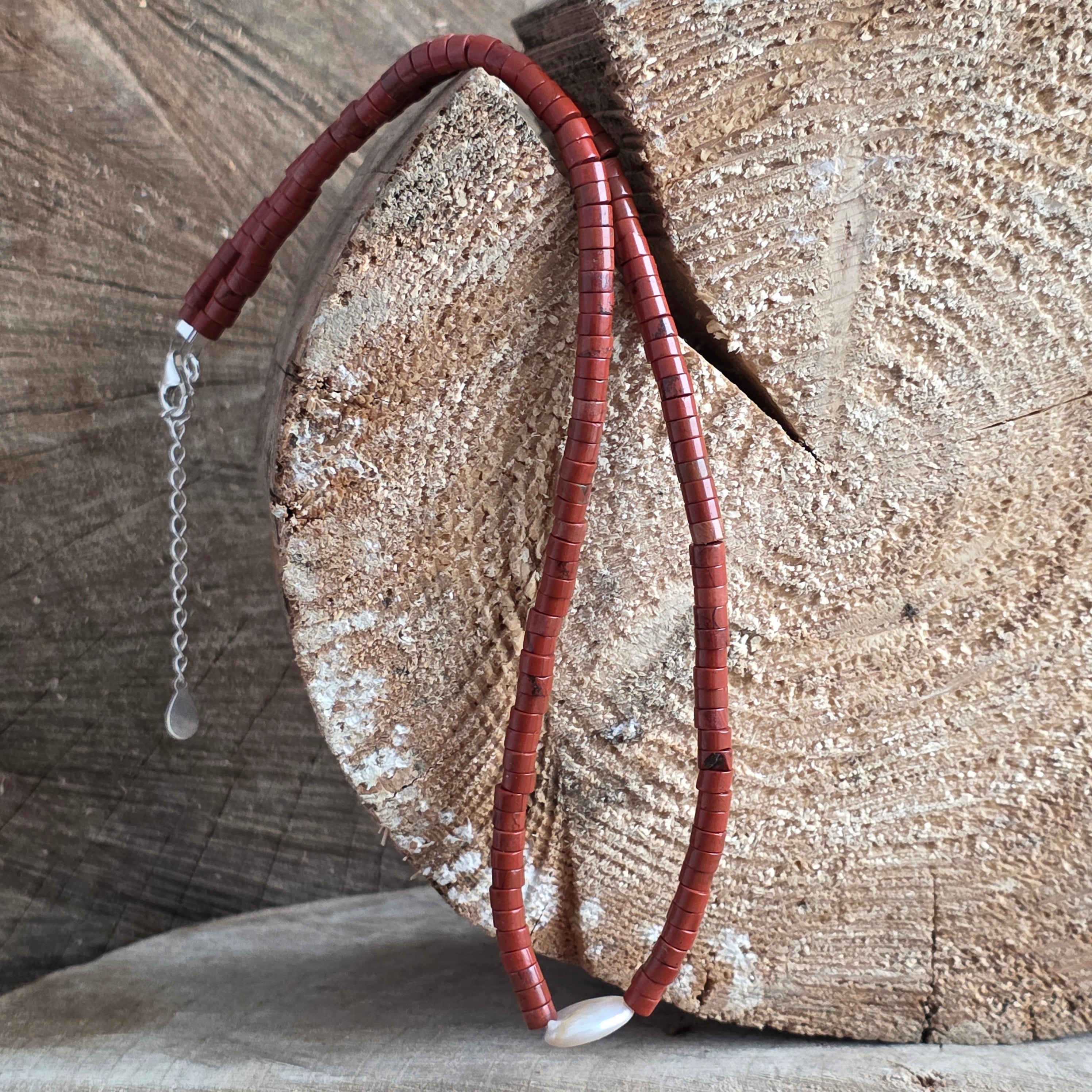 Naszyjnik, który niesie energię ziemi i szlachetność naturalnej prostoty. Naturalny czerwony jaspis, cięty w cienkie dyski 4,5 × 2 mm, emanuje siłą i witalnością, a centralna perła 1 cm dodaje akcent blasku, jak kropla spokoju pośród żywych kolorów. Razem tworzą idealną równowagę między pasją a spokojem, między ogniem a wodą.