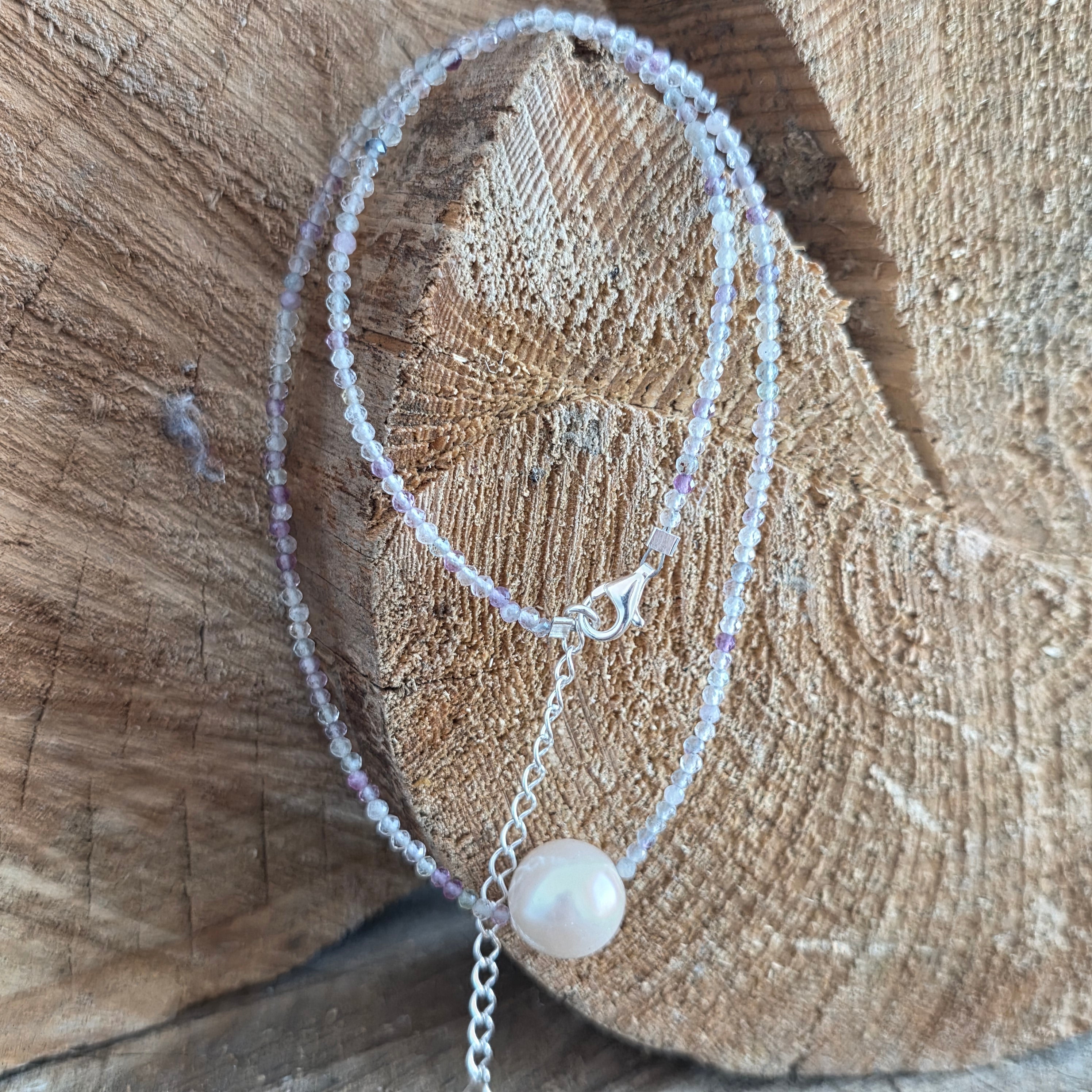 Materiały: fluoryt tęczowy 2 mm, srebro 925, perła 1 cm