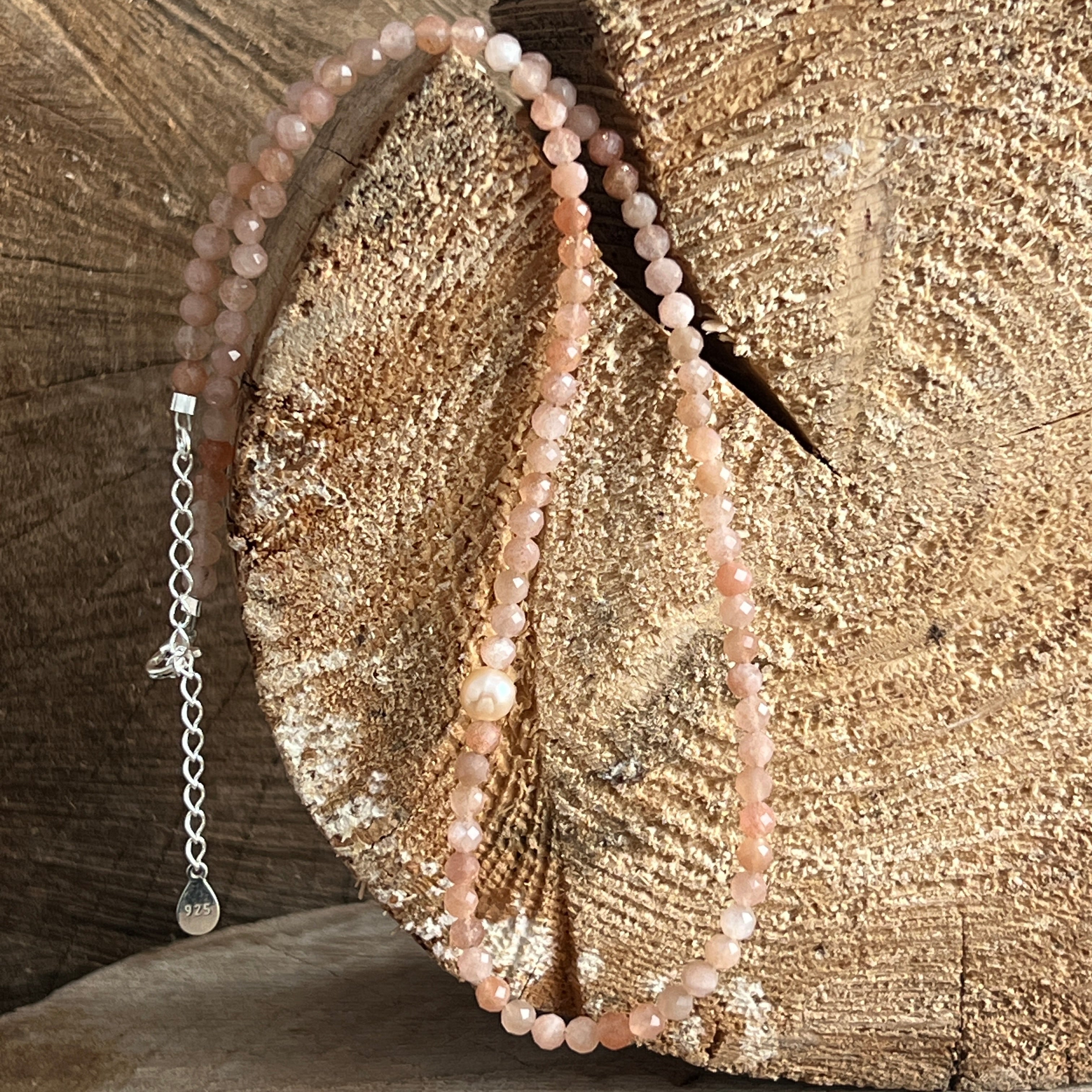 Naszyjnik, który niesie w sobie światło słonecznych dni i radość nowych początków. Naturalny fasetowany kamień słoneczny 4 mm błyszczy złotymi i pomarańczowymi refleksami, niczym promienie dotykające porannych fal. Akcenty z naturalnych okrągłych pereł 6 mm dodają nutę równowagi i elegancji, przekształcając biżuterię w symfonię ciepła i światła.