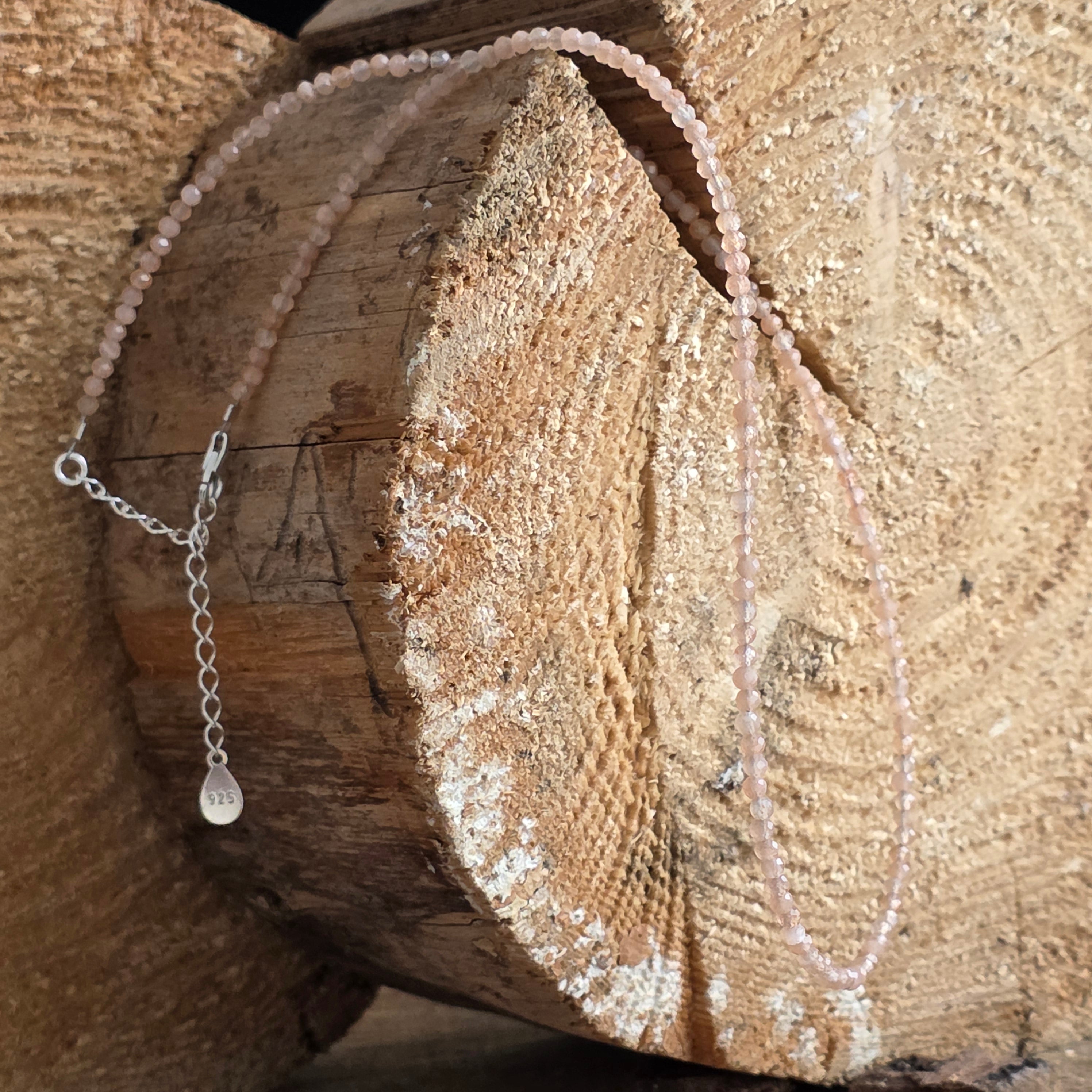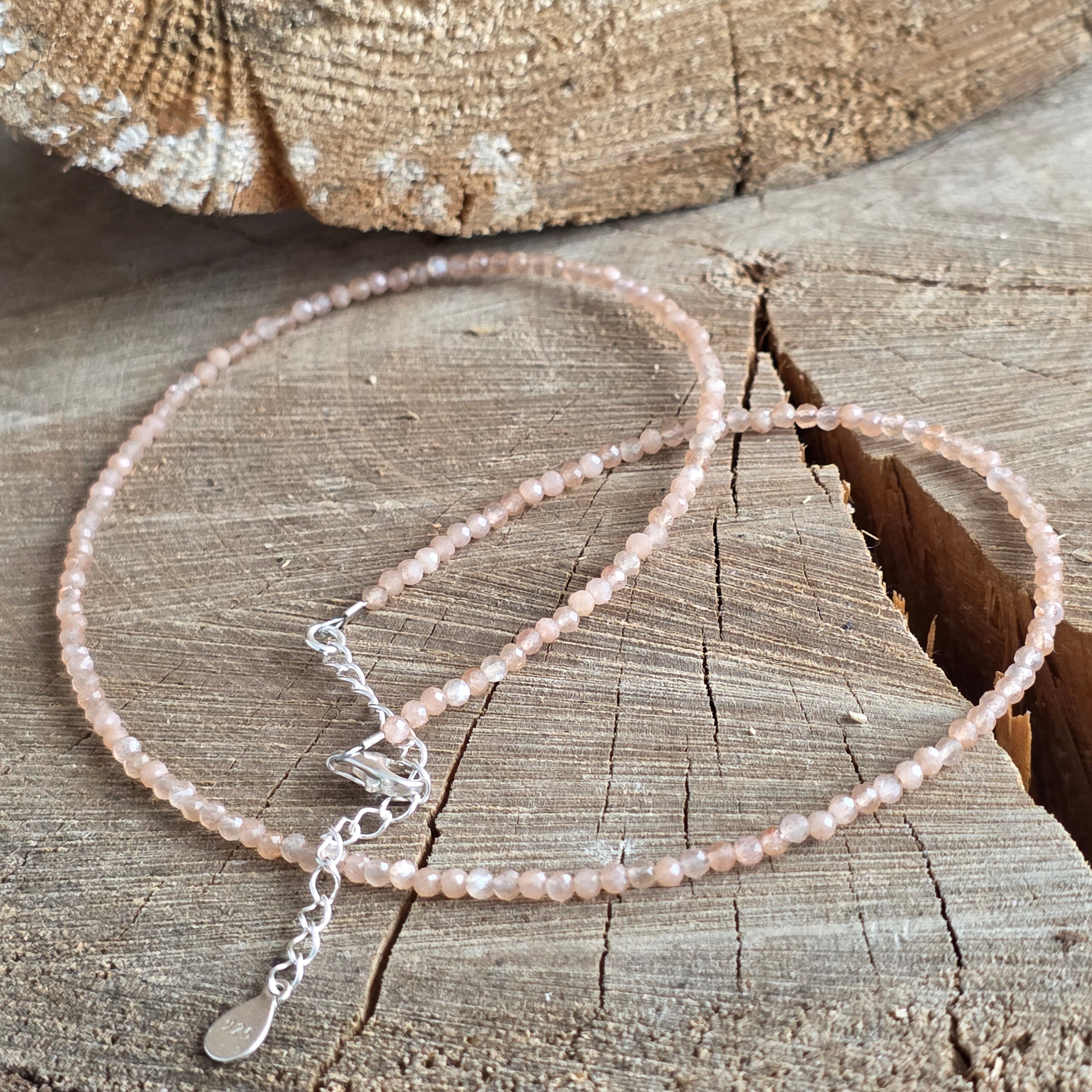 Delikatny naszyjnik niczym promień światła w ruchu. Naturalny fasetowany kamień słoneczny 2,5 mm emituje ciepły blask z subtelnymi złotymi i pomarańczowymi błyskami, tworząc wrażenie pyłu światła niesionego przez wiatr. Minimalistyczny i wyrafinowany design sprawia, że idealnie nadaje się do noszenia solo lub w subtelnych kombinacjach z innymi srebrnymi naszyjnikami.