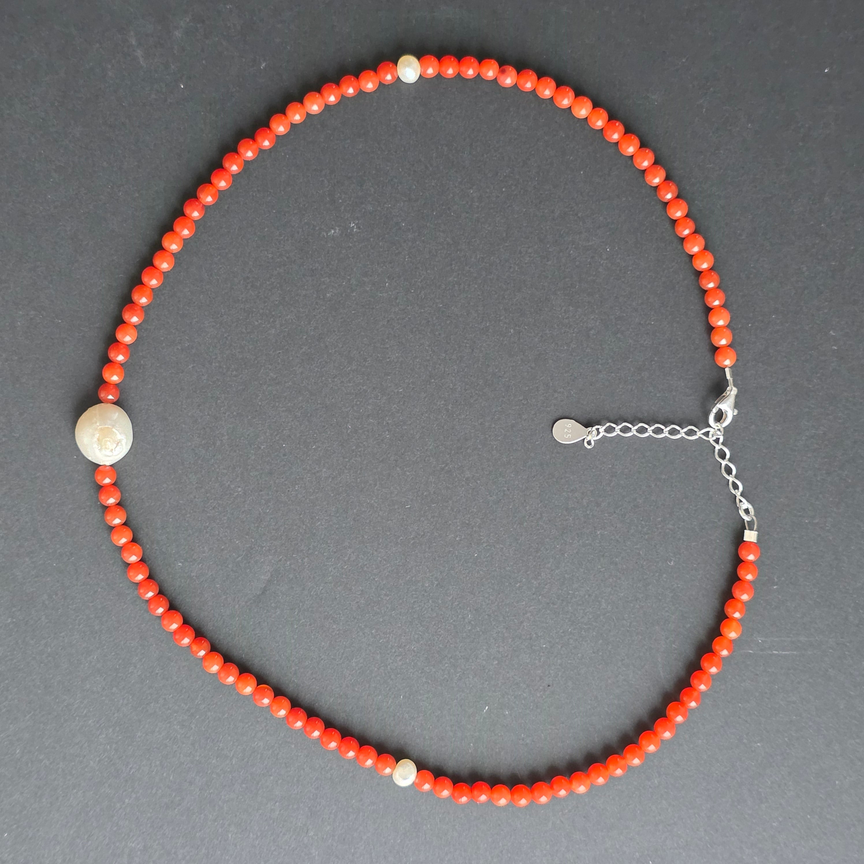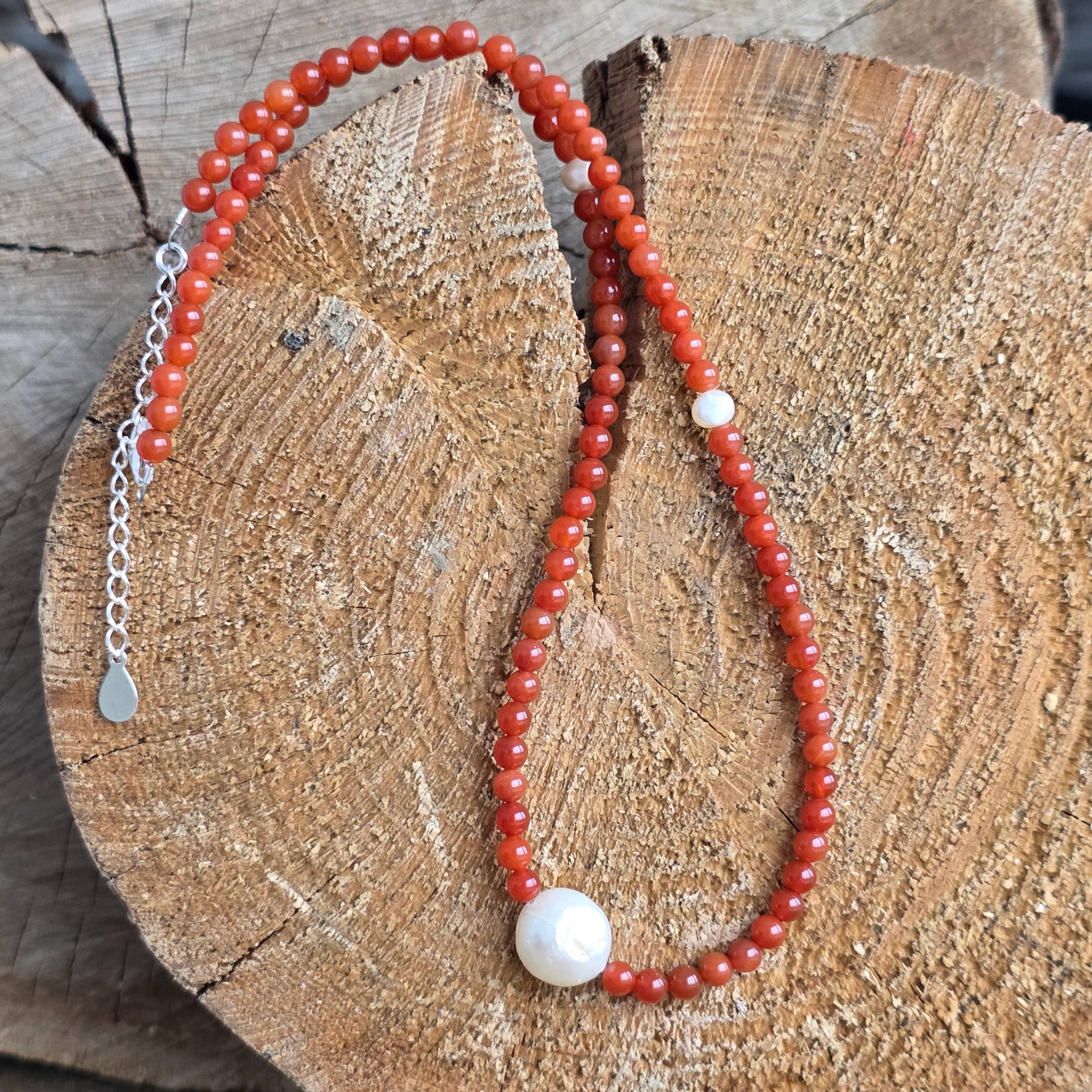 Materiały: naturalny karneol kule 4 mm, perły akcentowe 0,5-1 cm, srebro 925