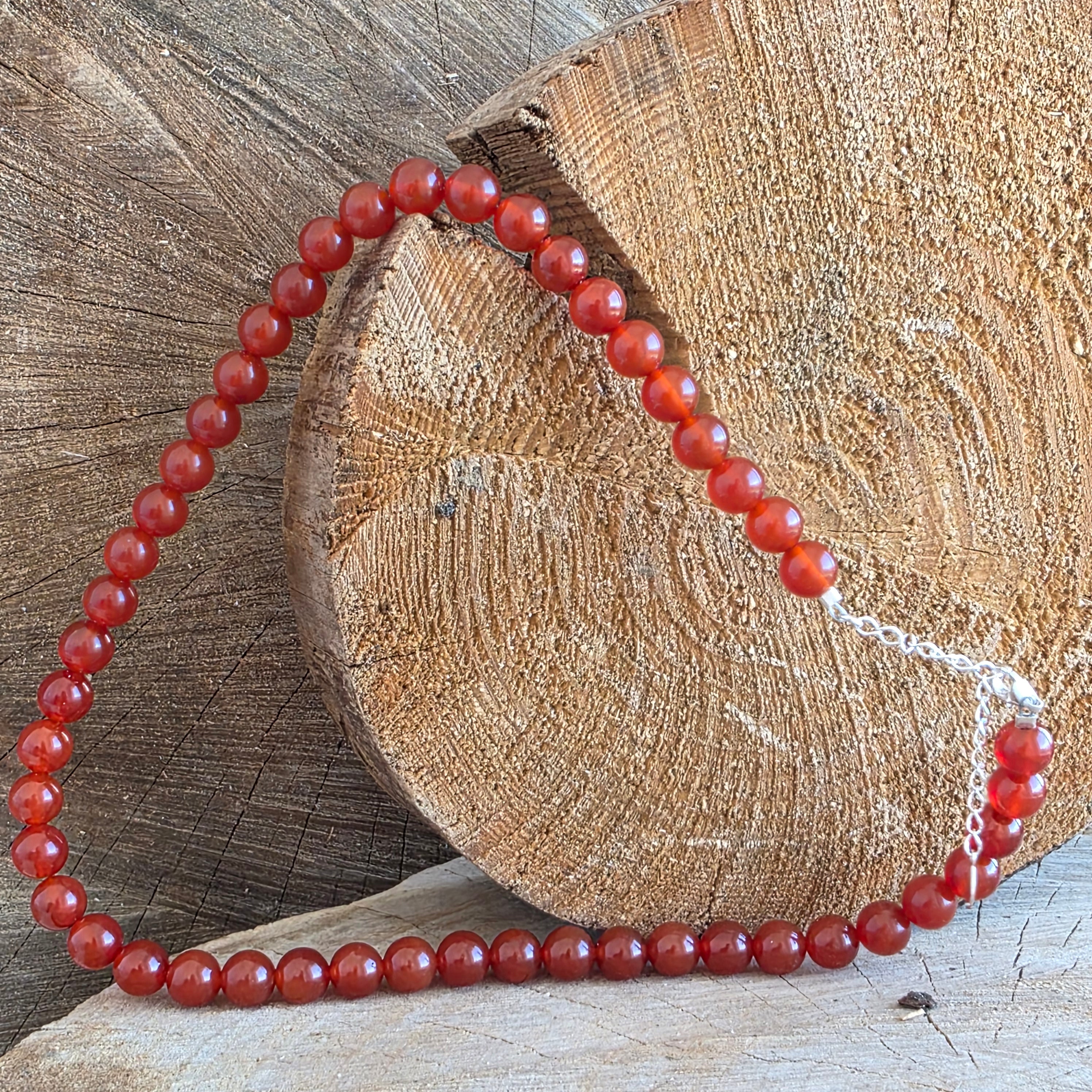 Naszyjnik o ciepłej i żywej prezencji, wykonany z 6 mm kulek karneolu, które harmonijnie układają się wokół szyi, tworząc okrągłą i zrównoważoną linię. Bogate odcienie pomarańczy i czerwieni, czasami z prześwitami, podkreślają żywy charakter kamienia, a kulisty kształt akcentuje poczucie ciągłości i wizualnej płynności. Projekt jest czysty i ponadczasowy, pozwalając, by naturalny kolor i faktura karneolu były w centrum uwagi.