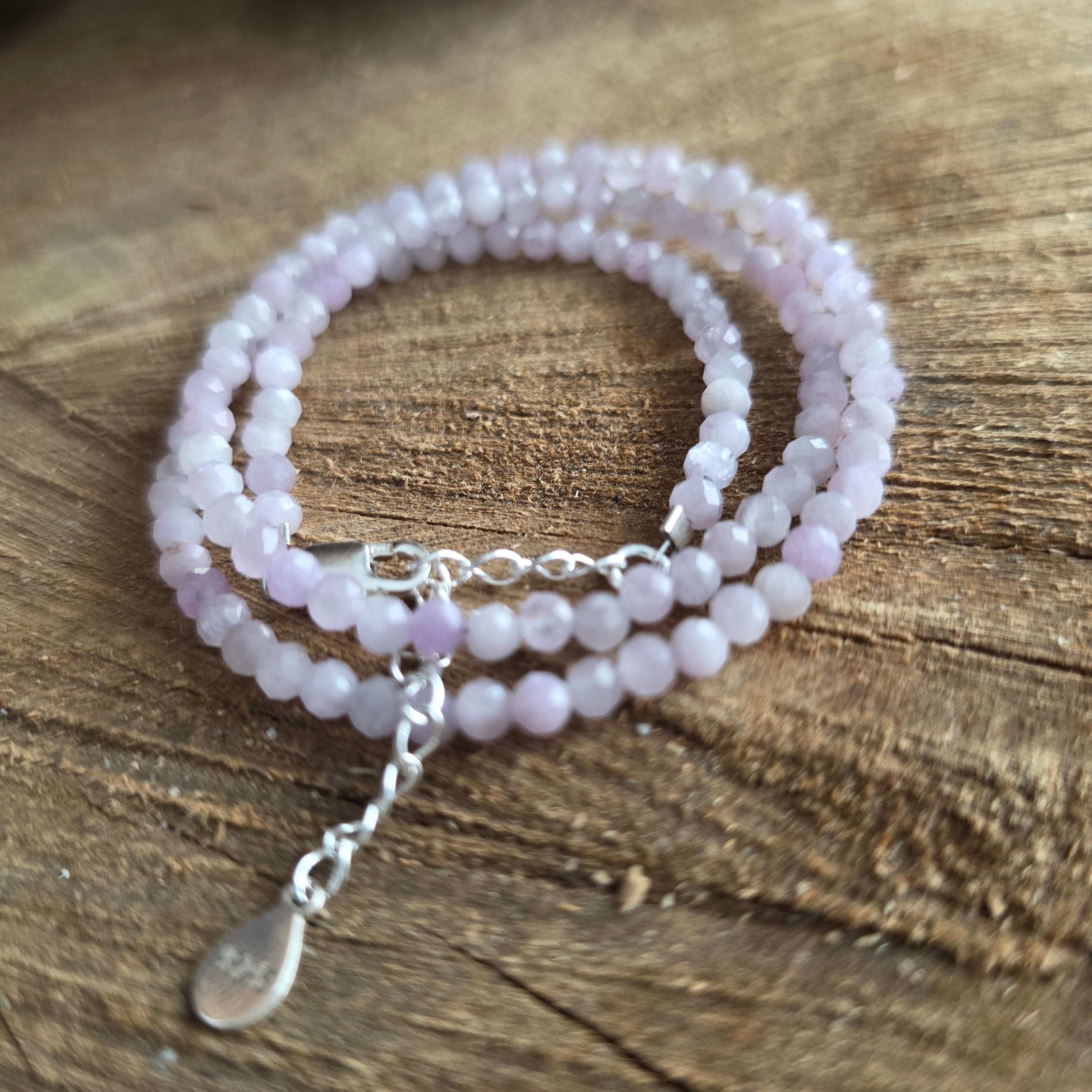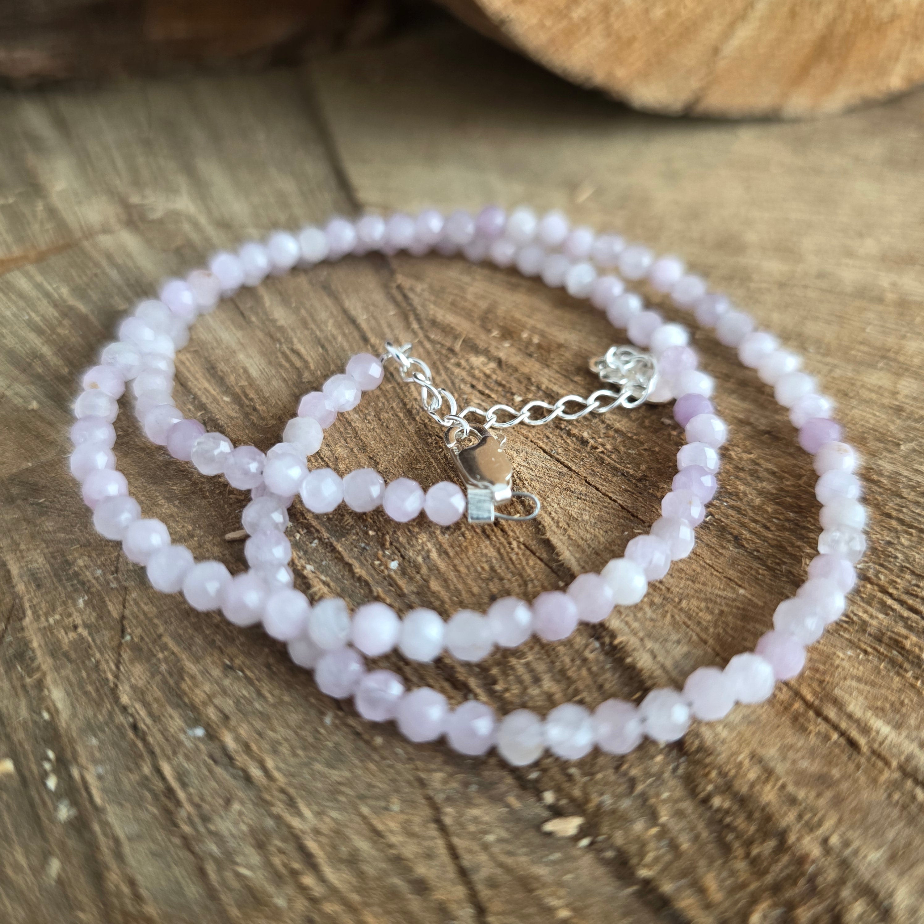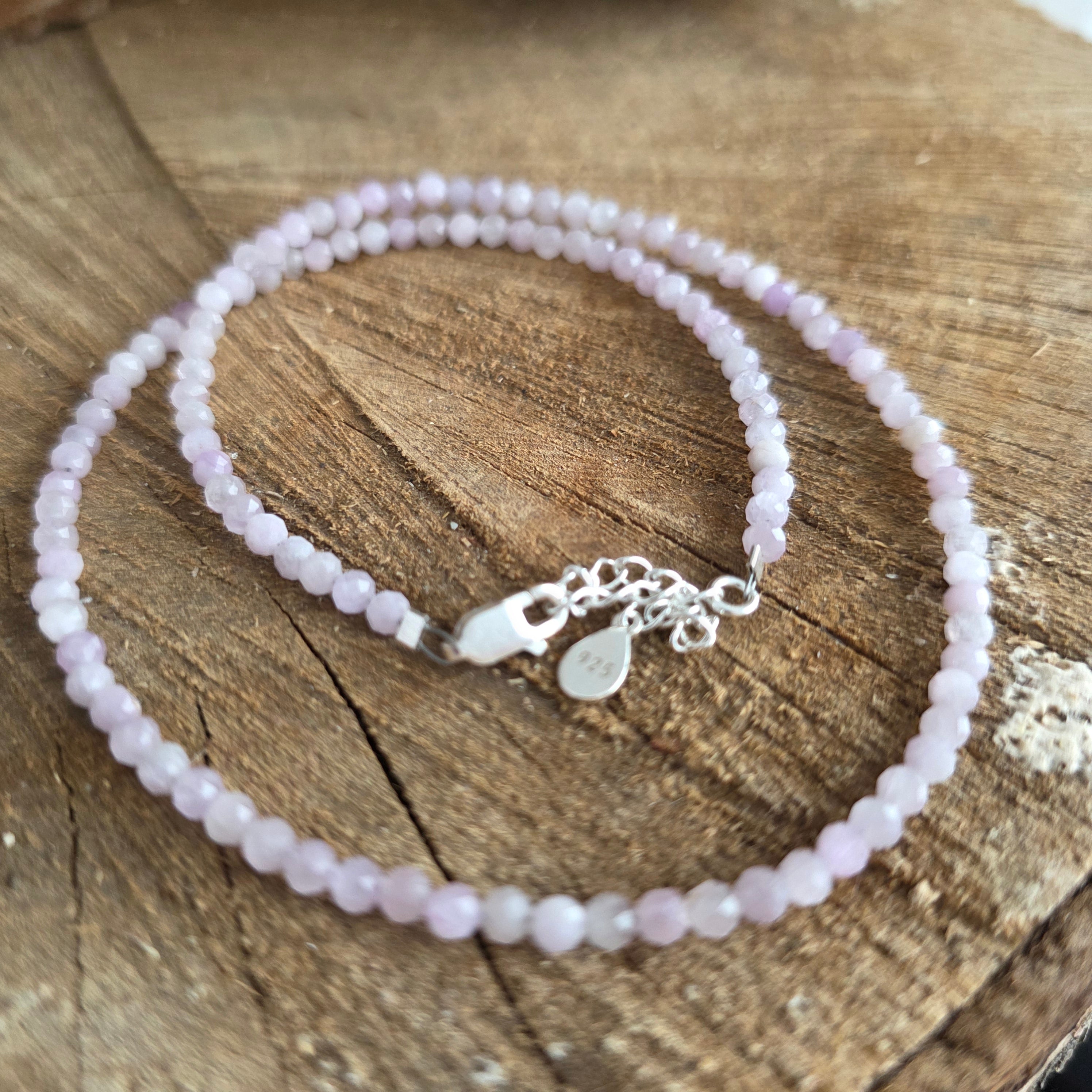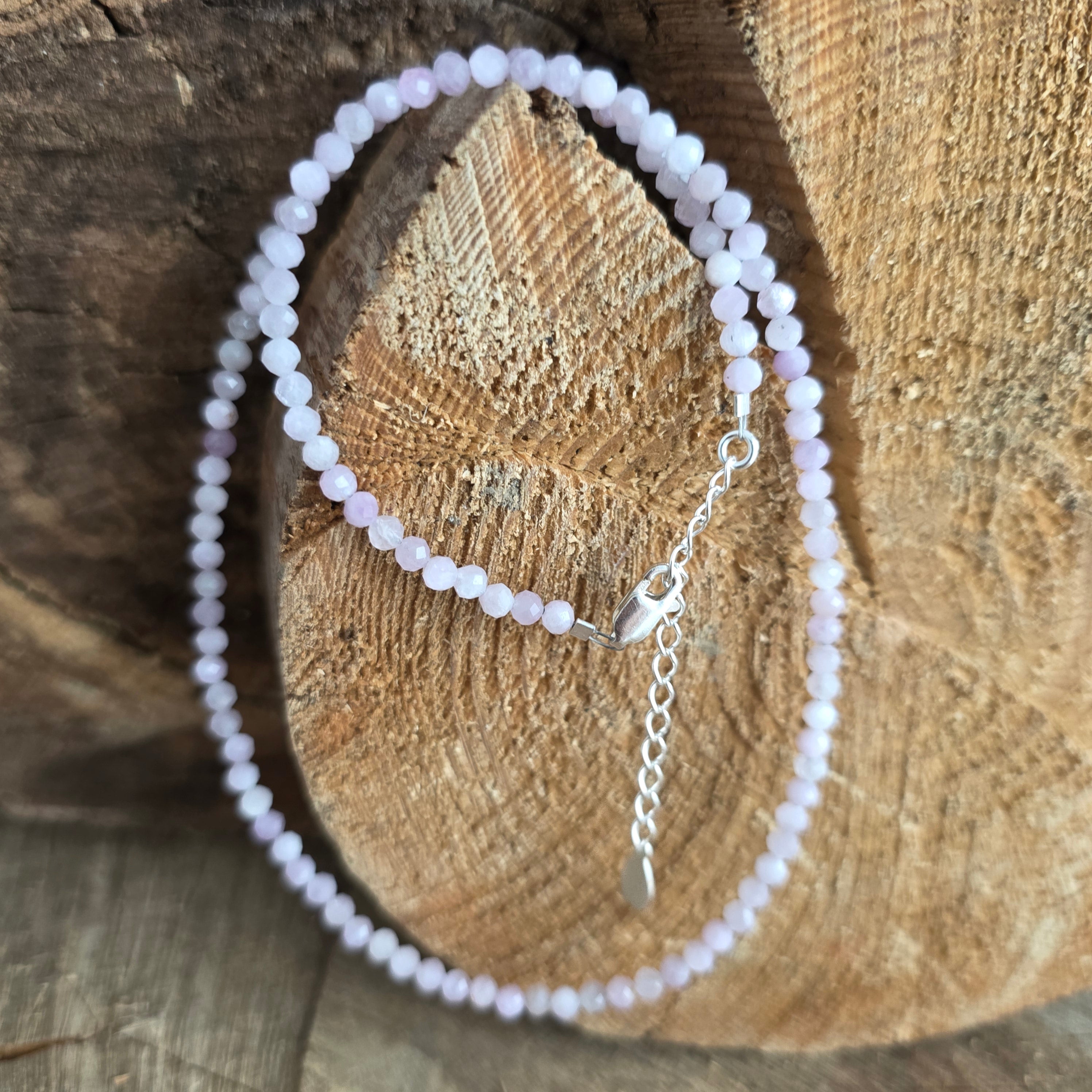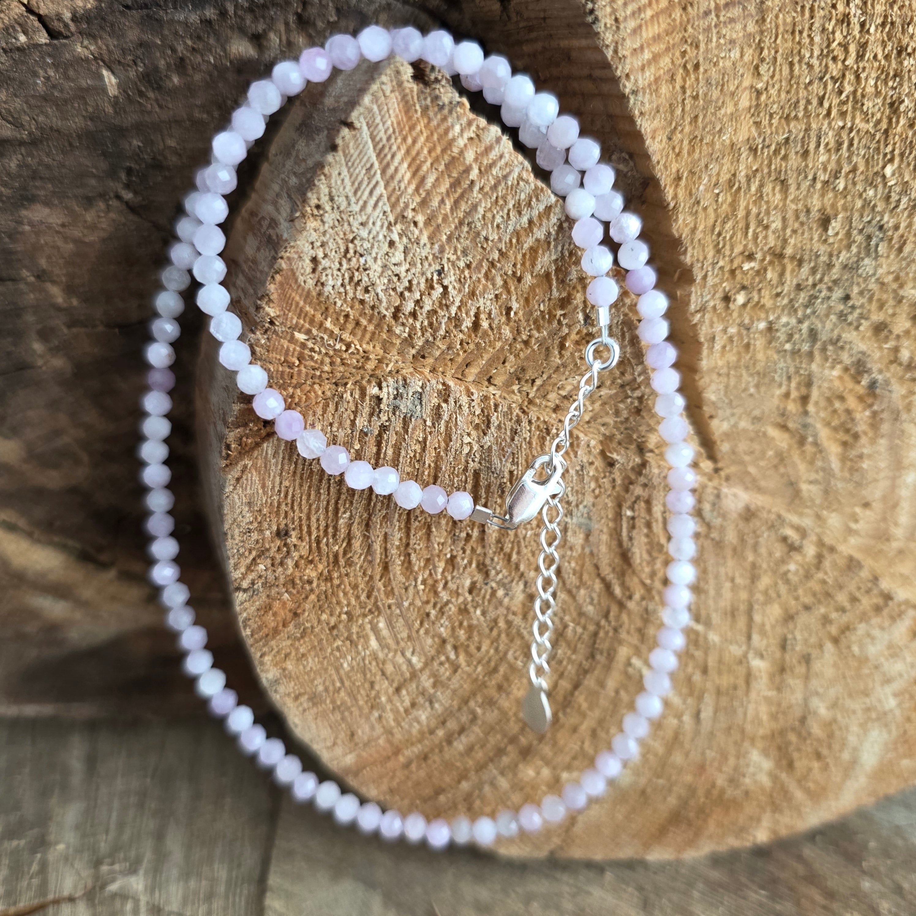 Delikatny naszyjnik, niczym powiew różowego światła u podstawy szyi. Fasetowane koraliki z naturalnego kunzytu o rozmiarze 3–4 mm tworzą subtelny i dyskretny blask, odbijając światło w sposób delikatny, kobiecy i wyrafinowany. Jego przejrzyste odcienie – od bladoróżowego po przezroczysty liliowy – nadają biżuterii wyjątkową elegancję, odpowiednią zarówno do codziennego noszenia, jak i na szczególne okazje.