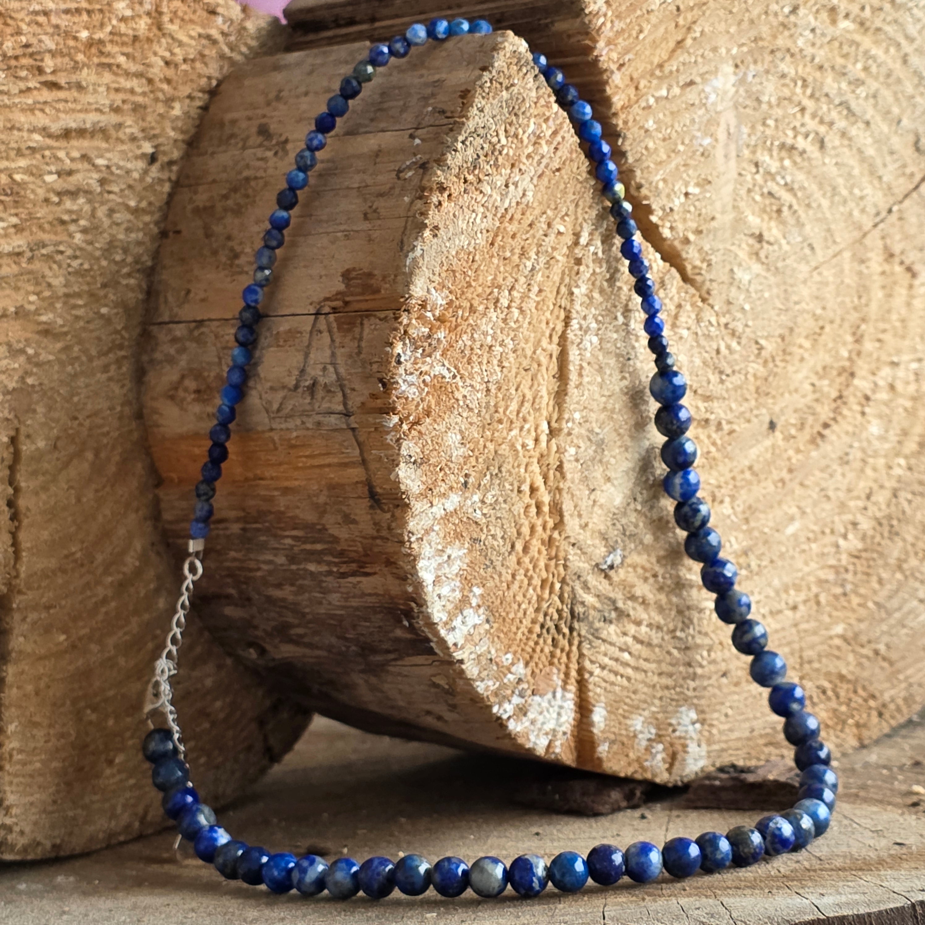 Naszyjnik niosący w sobie szlachetność głębokiego i tajemniczego nieba letnich nocy. Lapis lazuli, kamień królów i prawdy, ukazuje swoje piękno w swoich ciemnoniebieskich odcieniach, przeszytych złotymi iskierkami pirytu – niczym gwiazdy oświetlające drogę tym, którzy szukają mądrości.