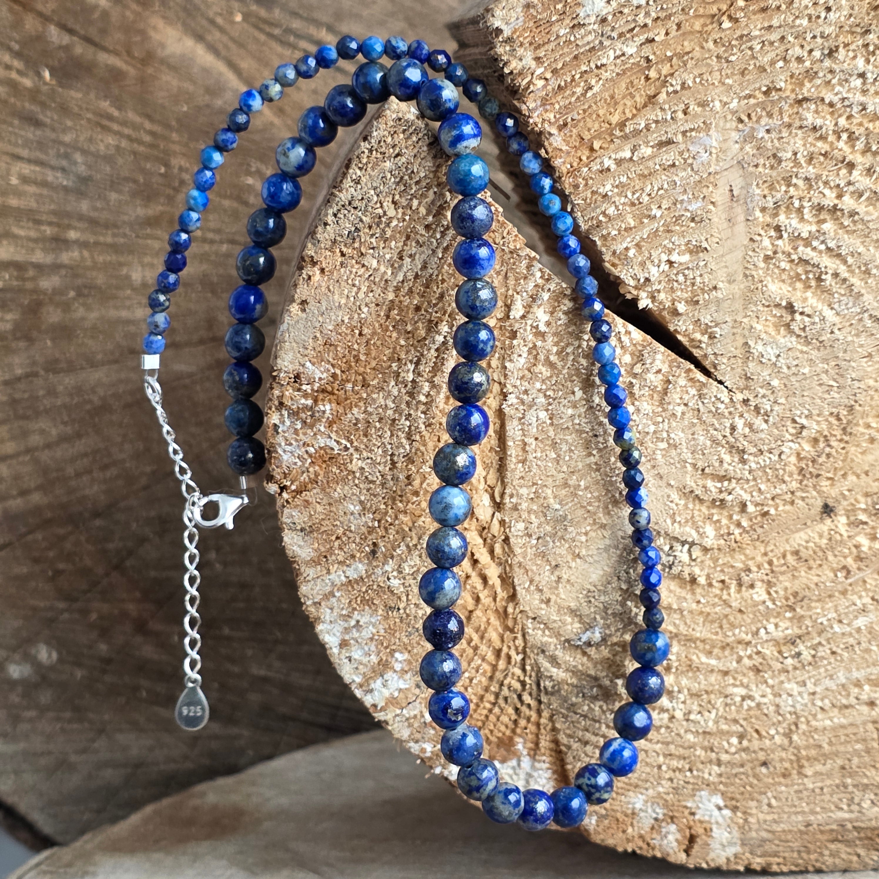 Kuliste koraliki o średnicy 6 mm przeplatane kulkami fasetowanymi o średnicy 3 mm dodają finezji i rytmu klejnotowi, tworząc subtelną harmonię pomiędzy siłą i wyrafinowaniem. Lapis był noszony od czasów starożytnych jako symbol prawdę, duchową wizję i wewnętrzną siłę, uważany za portal do samopoznania i ochronę przed rozpraszającymi energiami.