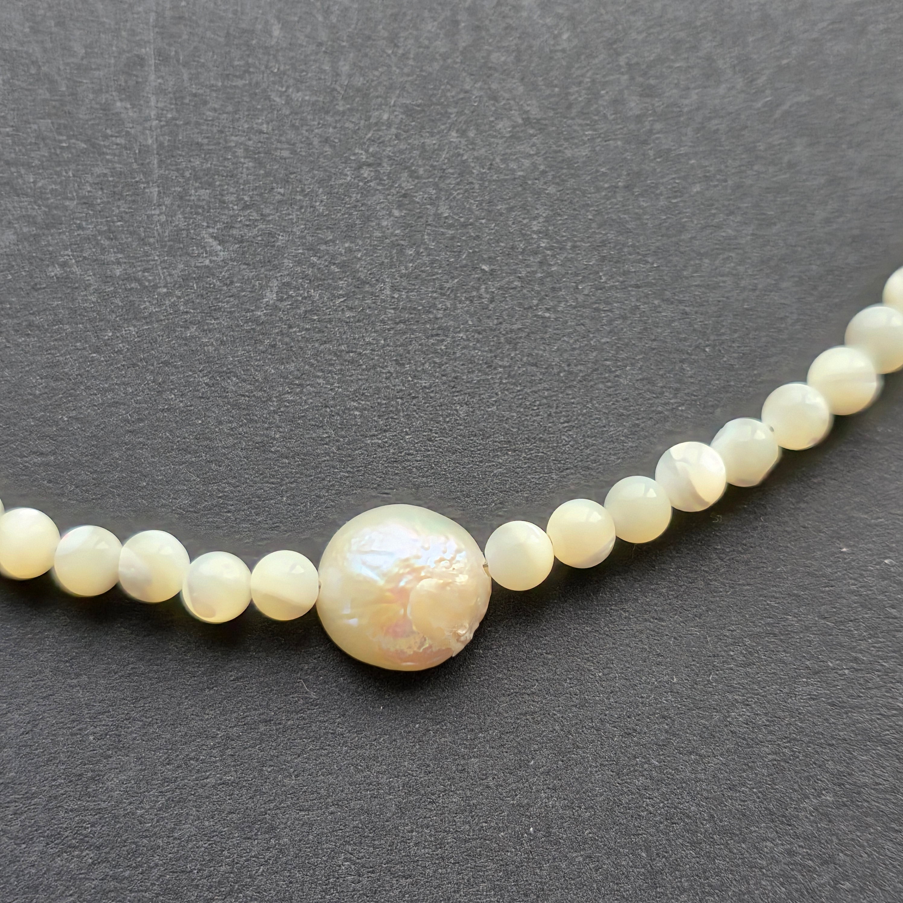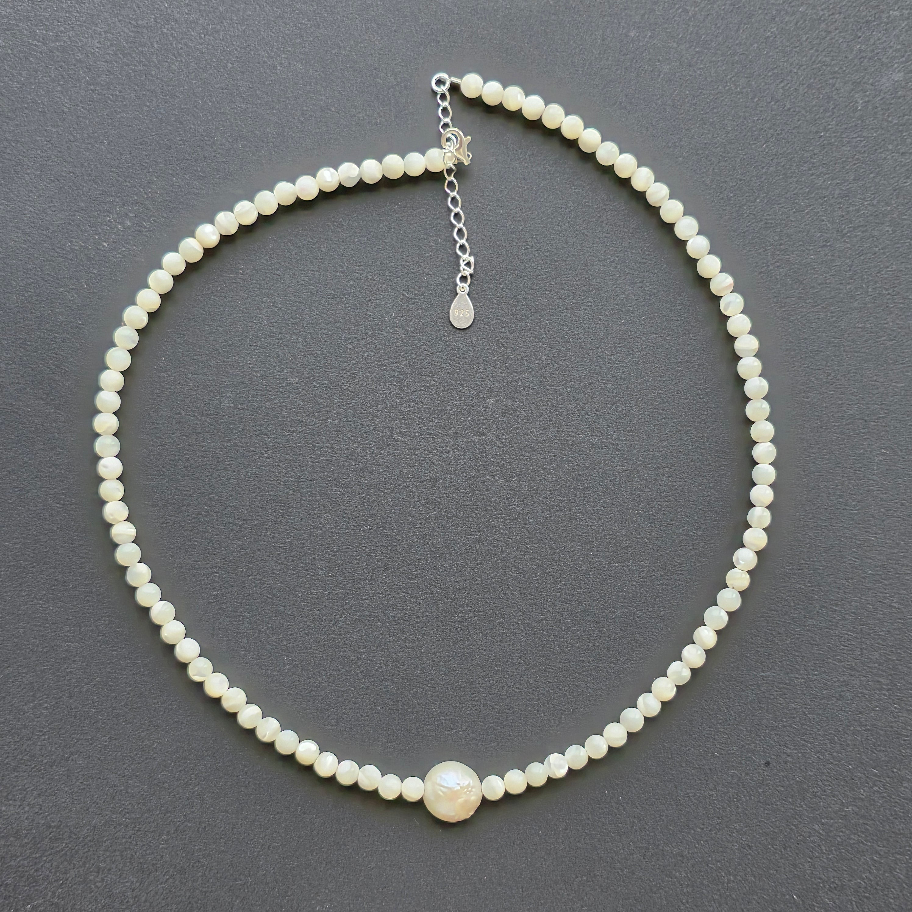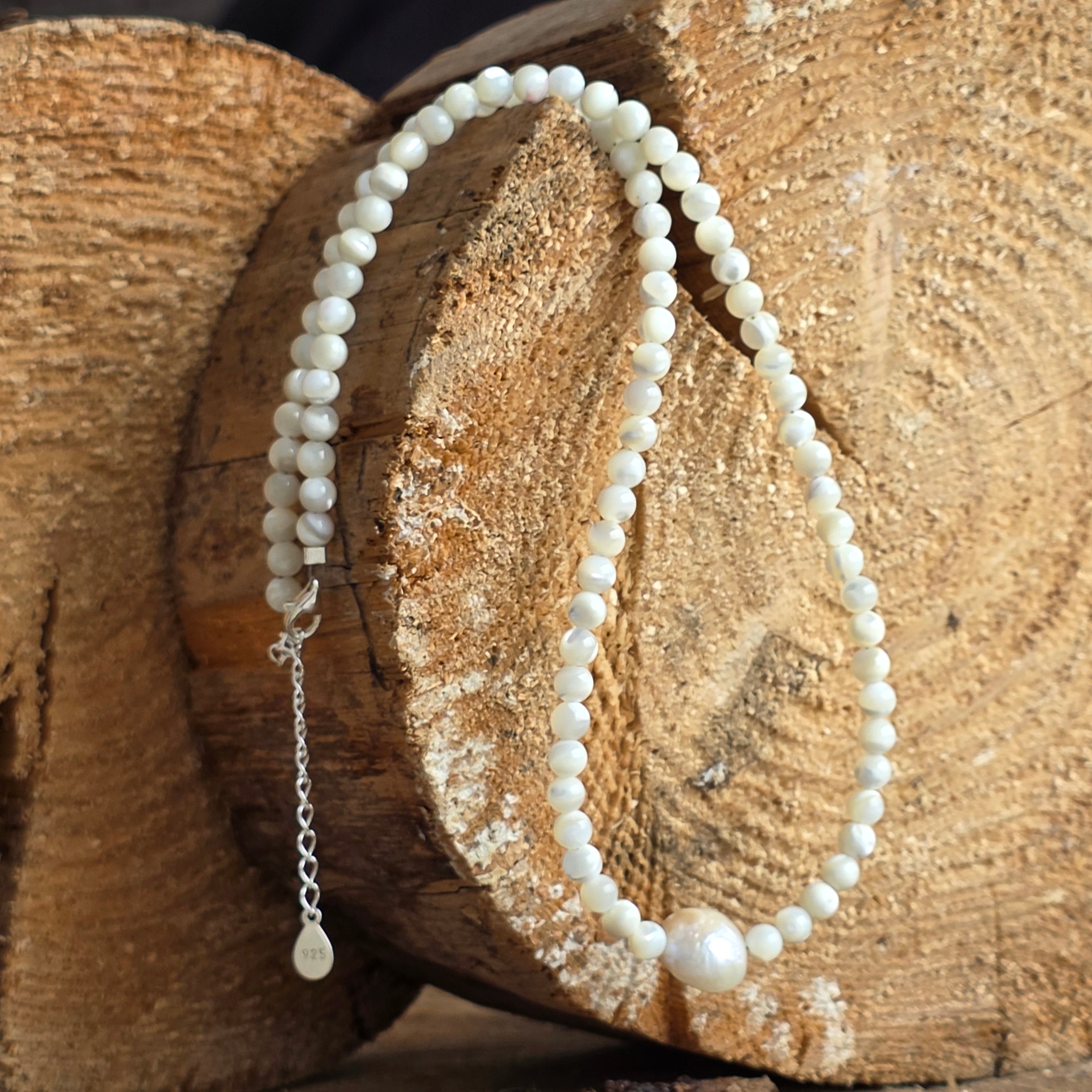Ręcznie wykonany naszyjnik z starannie dobranej masy perłowej, który zachowuje delikatny blask morza w każdym refleksie. Element z naturalnymi akcentami i perłowymi tonami, masa perłowa wnosi ponadczasową elegancję i spokojną aurę, idealną dla tych, którzy kochają subtelne piękno. Łatwy do noszenia na co dzień lub podczas specjalnych okazji, naszyjnik staje się subtelnym detalem, który rozświetla stylizację i wprowadza harmonię do osobistego stylu.