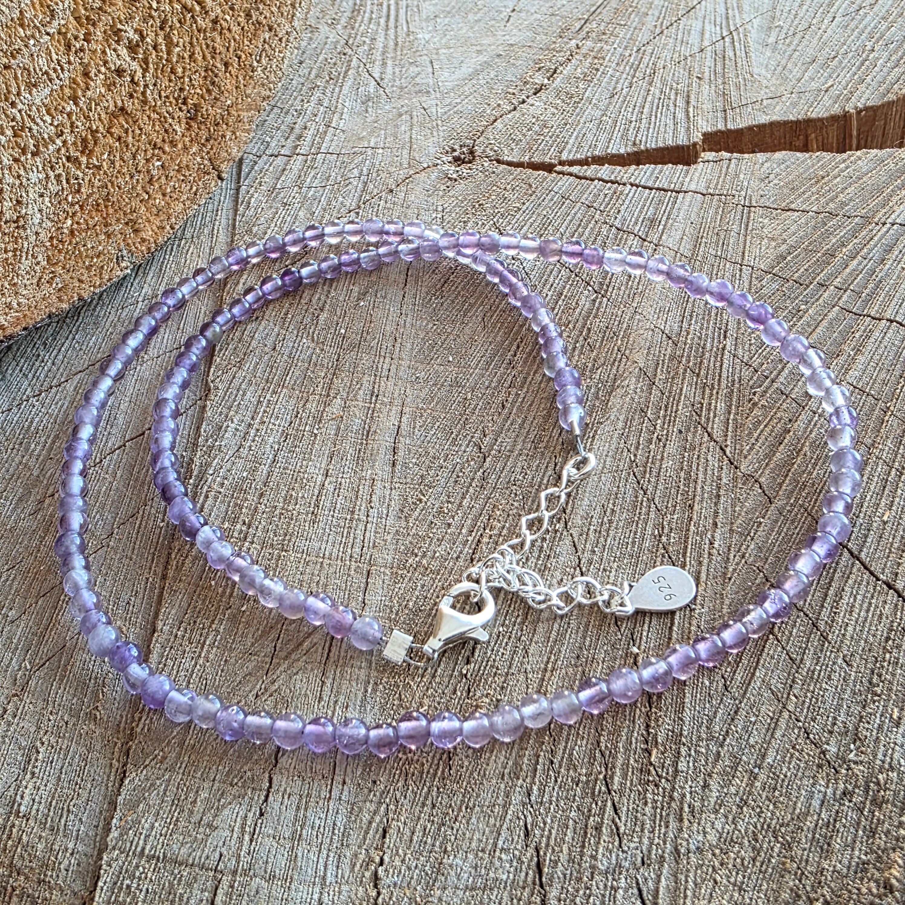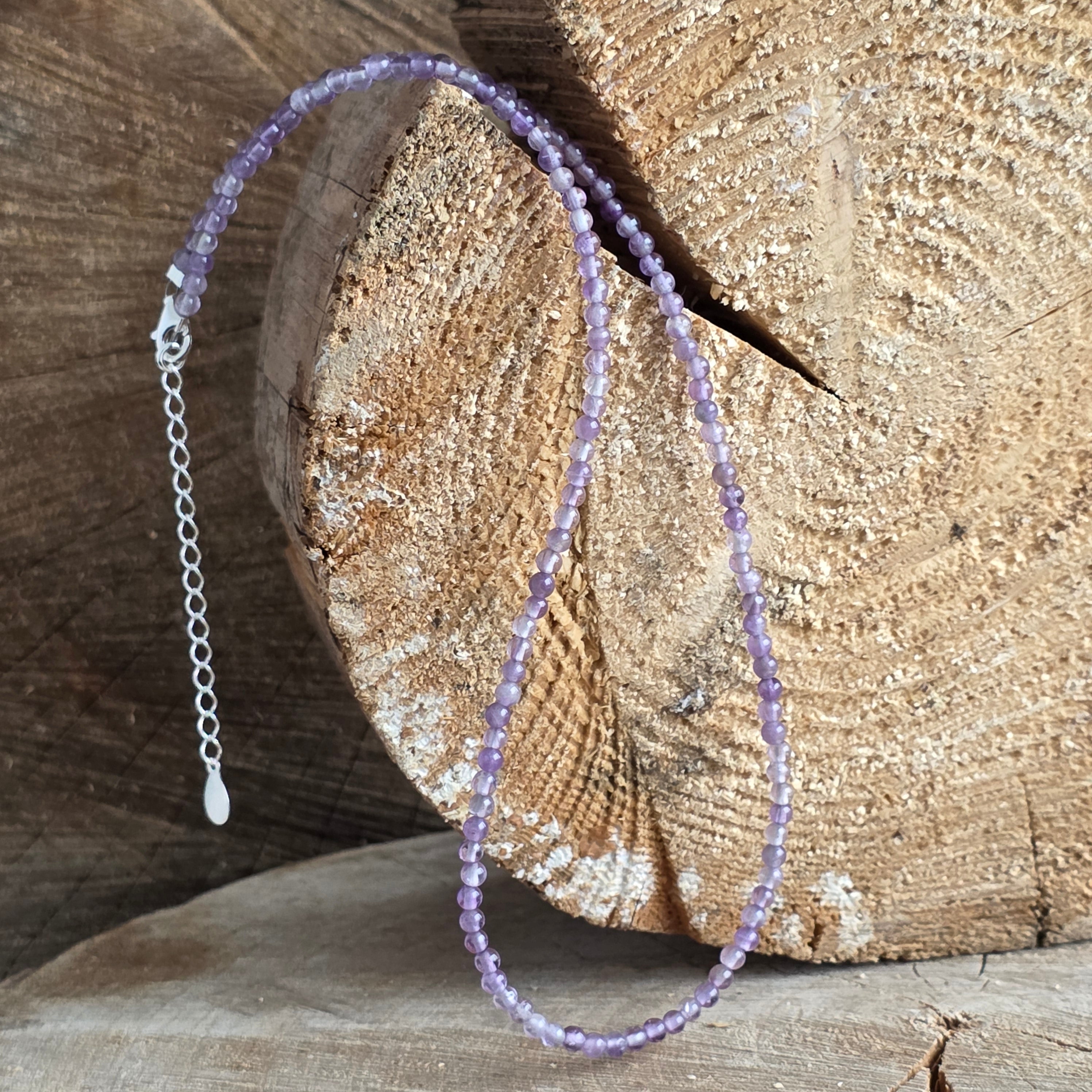 Delikatny naszyjnik o spokojnej atmosferze naturalnej czystości i elegancji. Drobne koraliki z naturalnego ametystu o średnicy 3 mm harmonijnie układają się na dekolcie, odbijając światło miękkim, niemal eterycznym blaskiem.