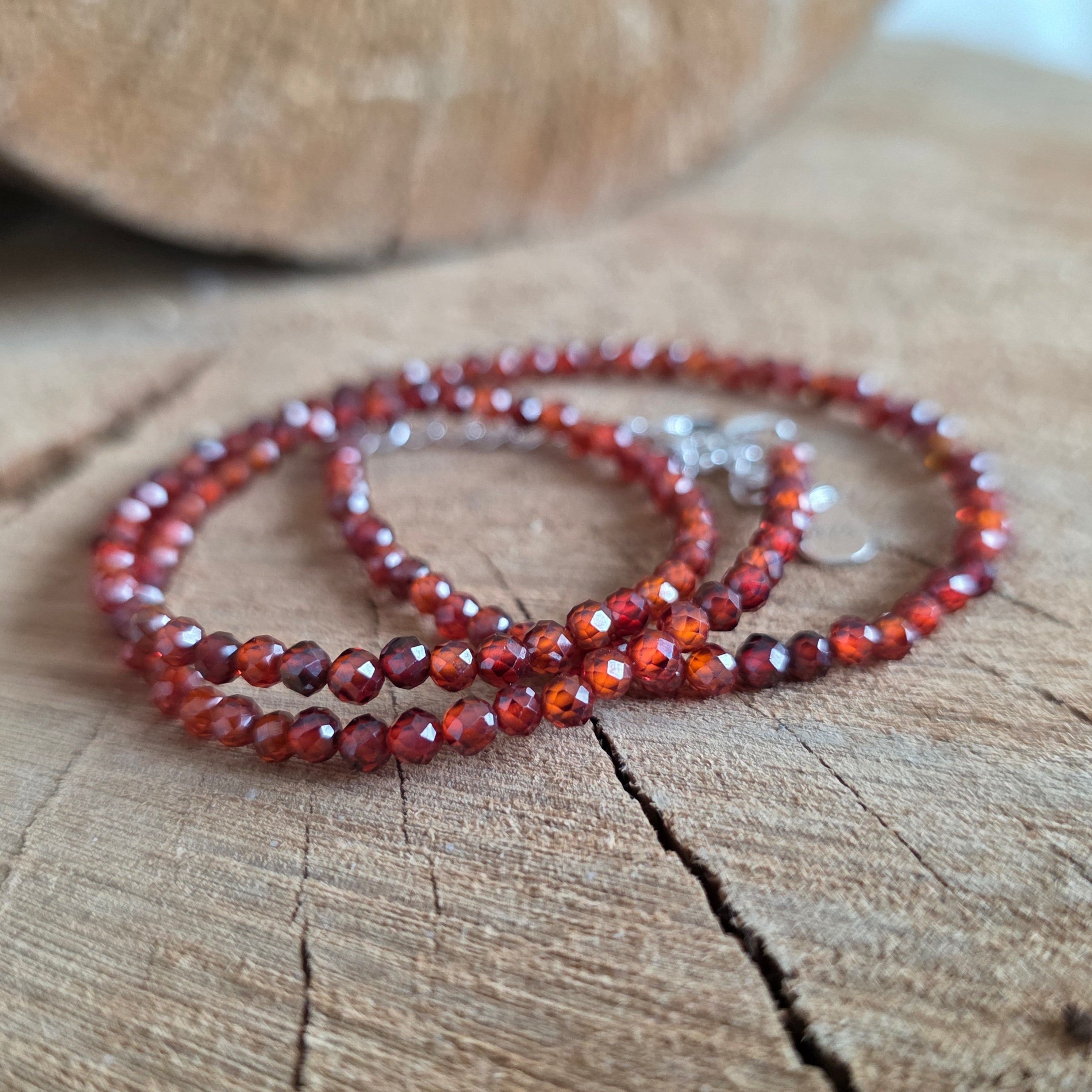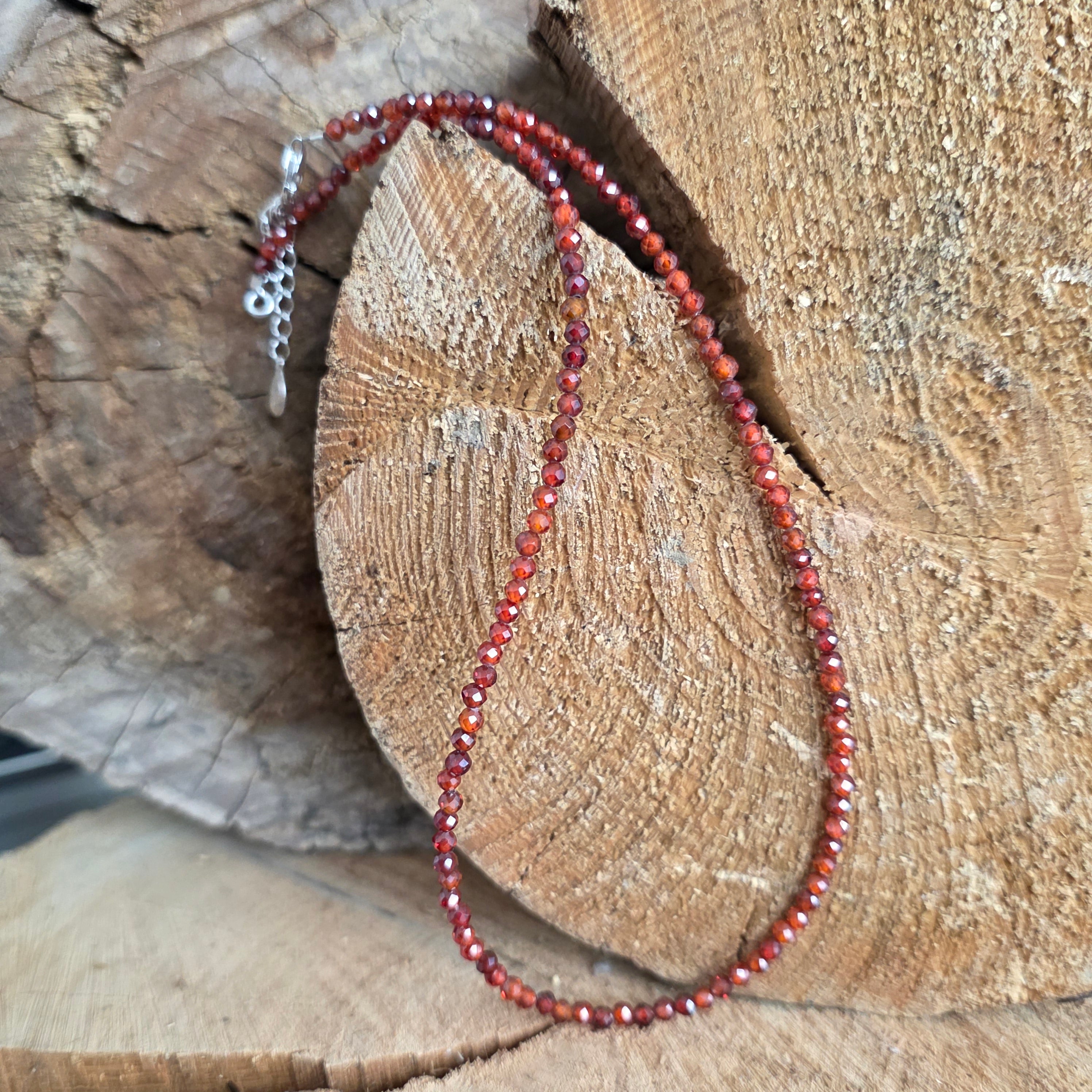 Ten naszyjnik wykonany jest z naturalnego pomarańczowego cyrkonu, wybranego ze względu na jego intensywny blask i ciepłe, żywe odcienie, które przyciągają światło pod każdym kątem. Fasetowane kulki o średnicy 2,5 mm tworzą subtelną grę refleksów, nadając biżuterii delikatny, lecz energetyczny wygląd.