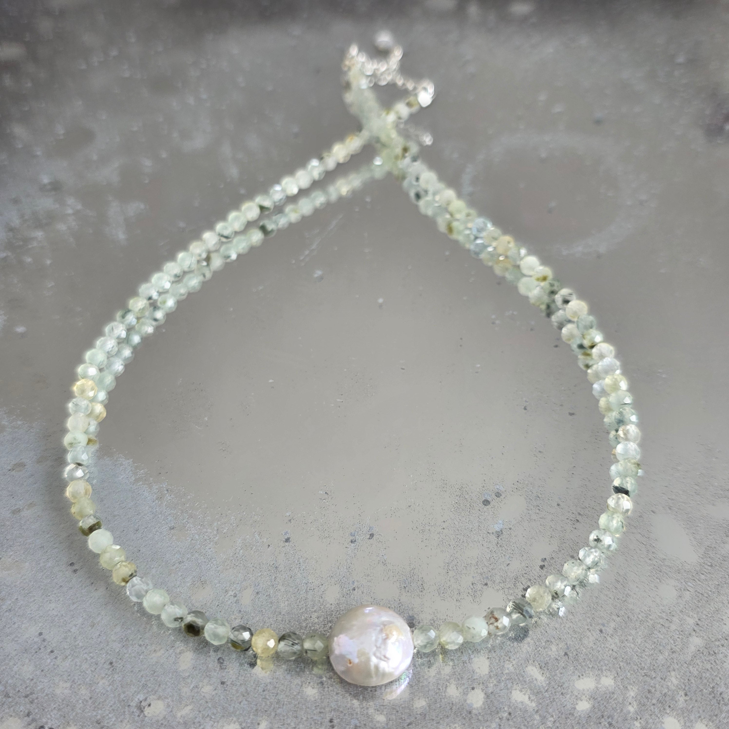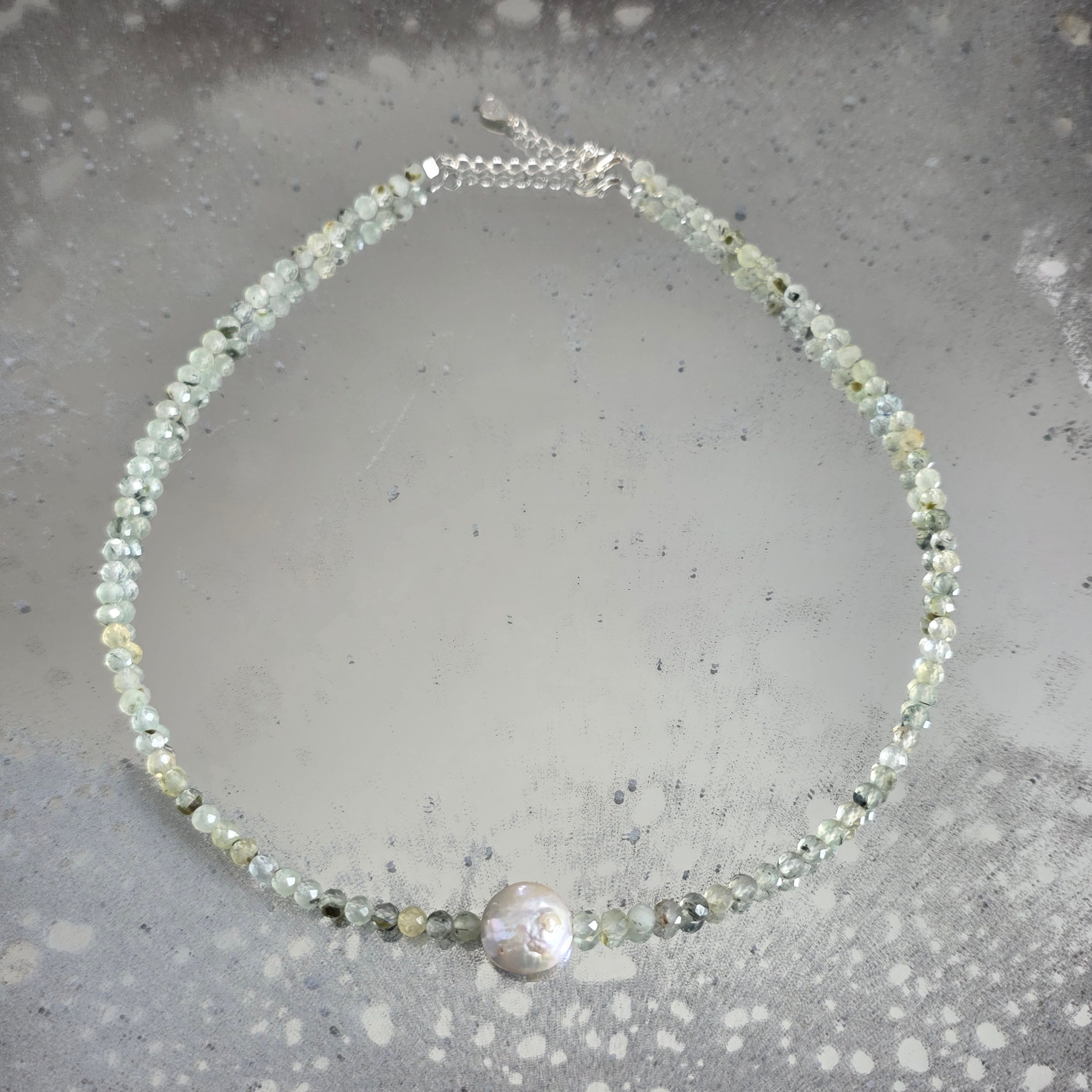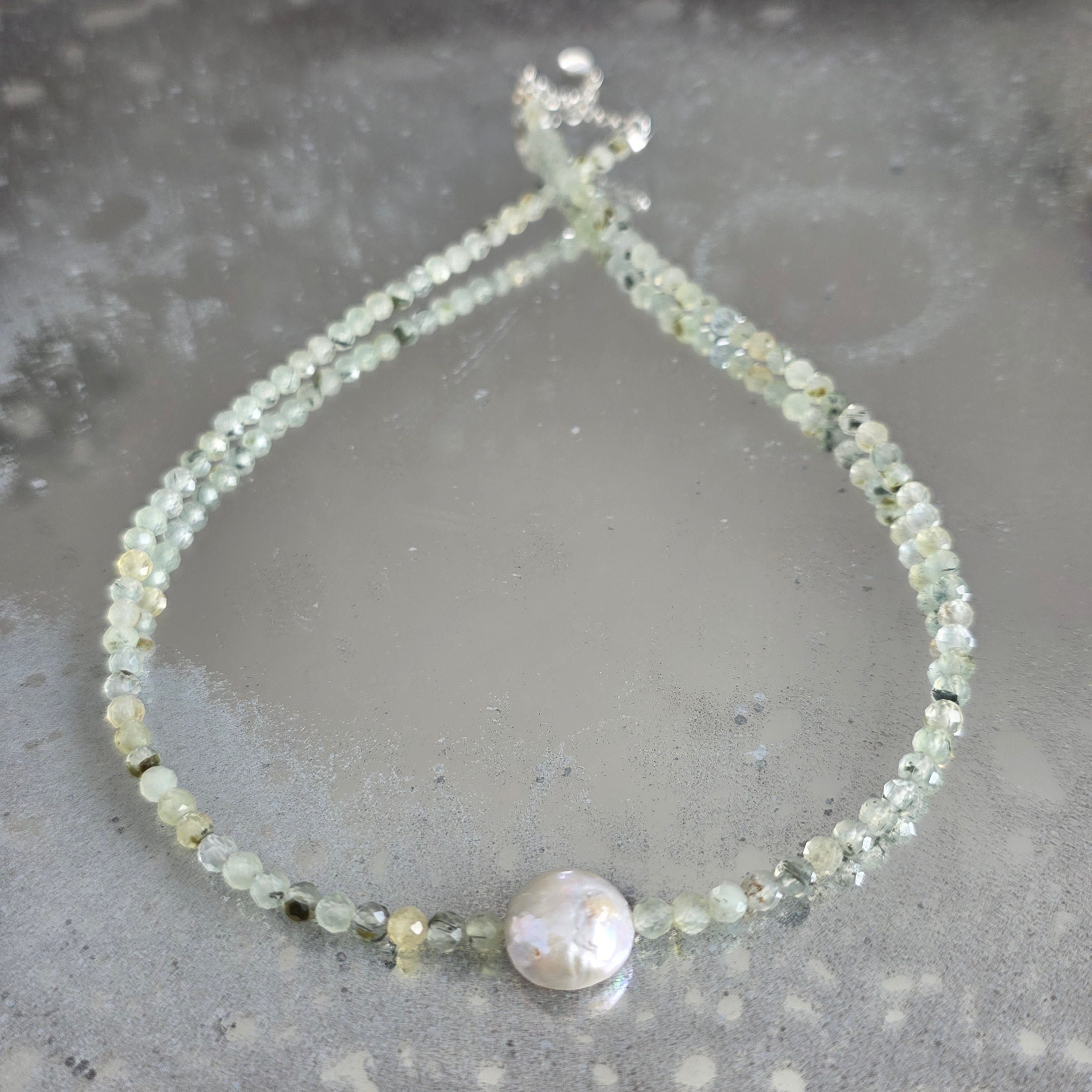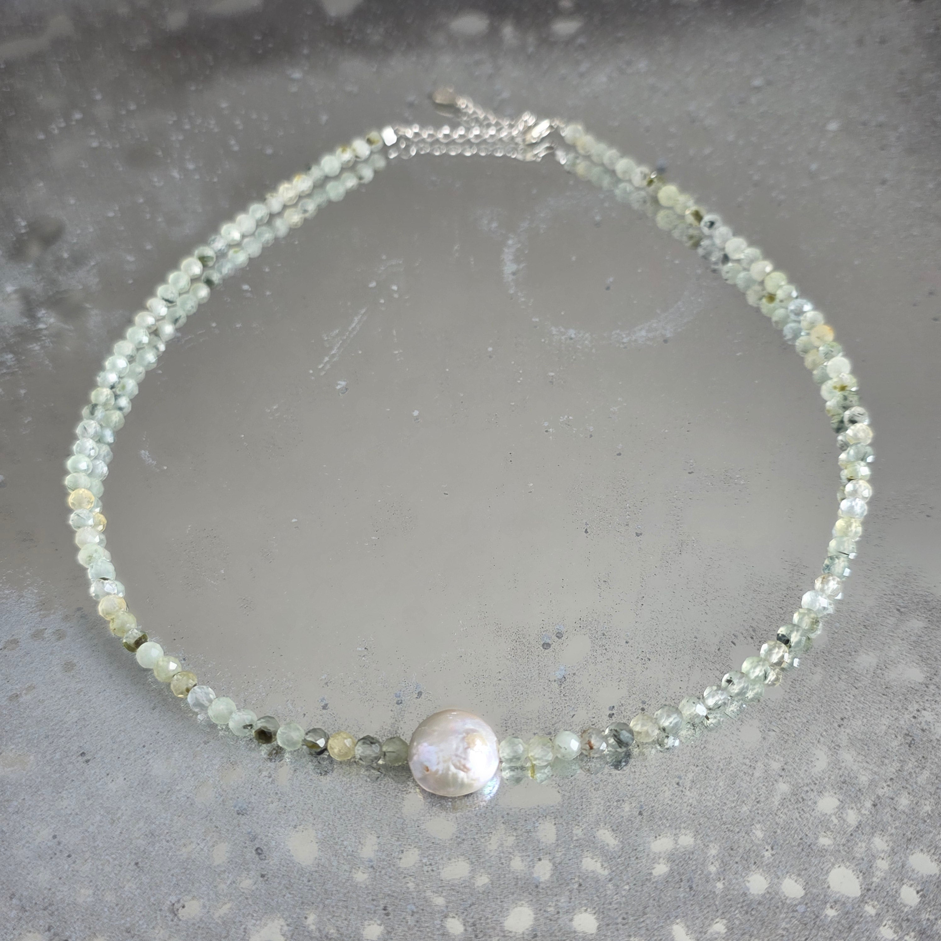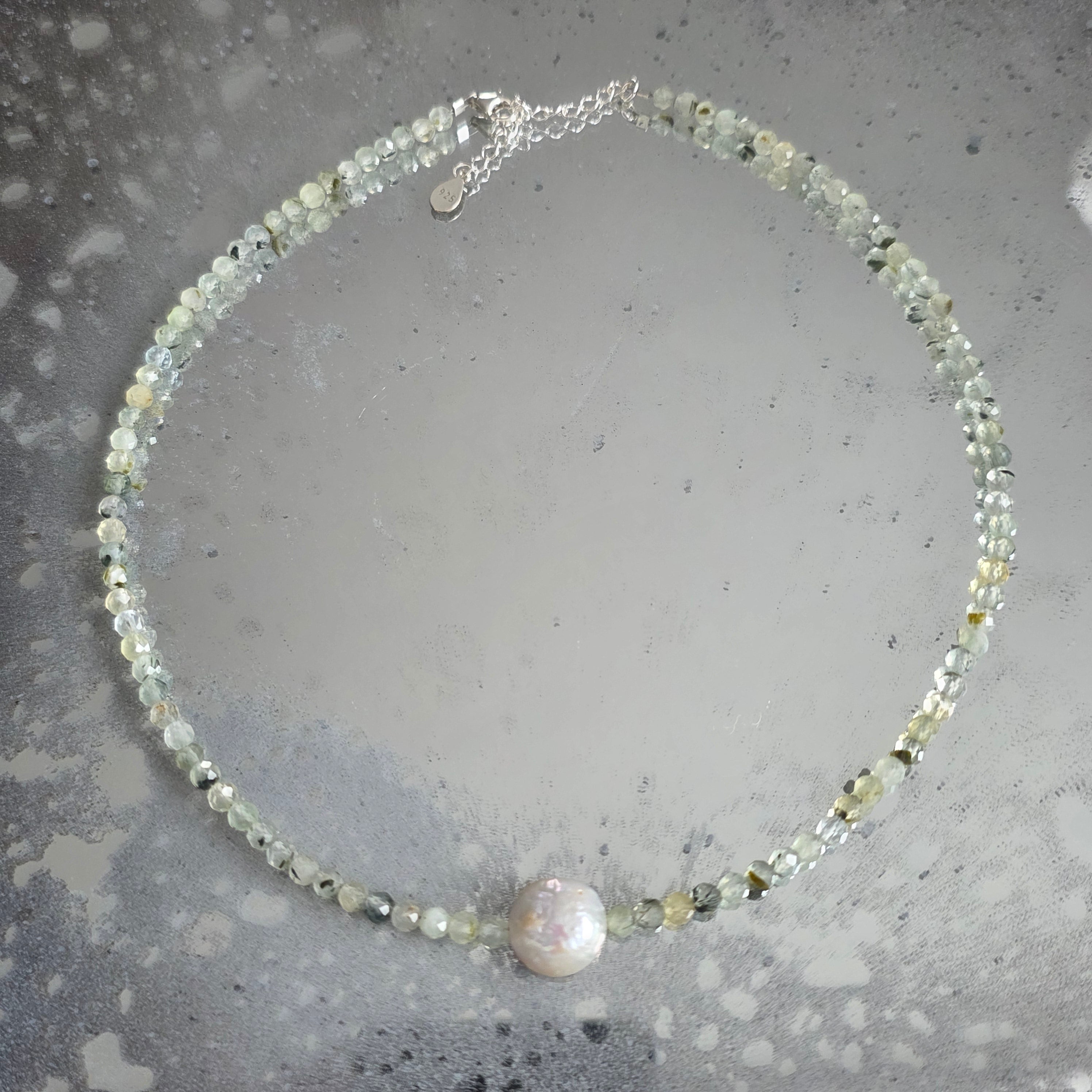Delikatny i świetlisty naszyjnik, wykonany z 4 mm szlifowanych kulek prehnitu, subtelnie ułożonych w spokojnym i zrównoważonym rytmie. W centrum kompozycji znajduje się naturalna perła o średnicy około 1 cm, stając się punktem spokoju i wyrafinowania, dodając biżuterii nuty ponadczasowej elegancji.