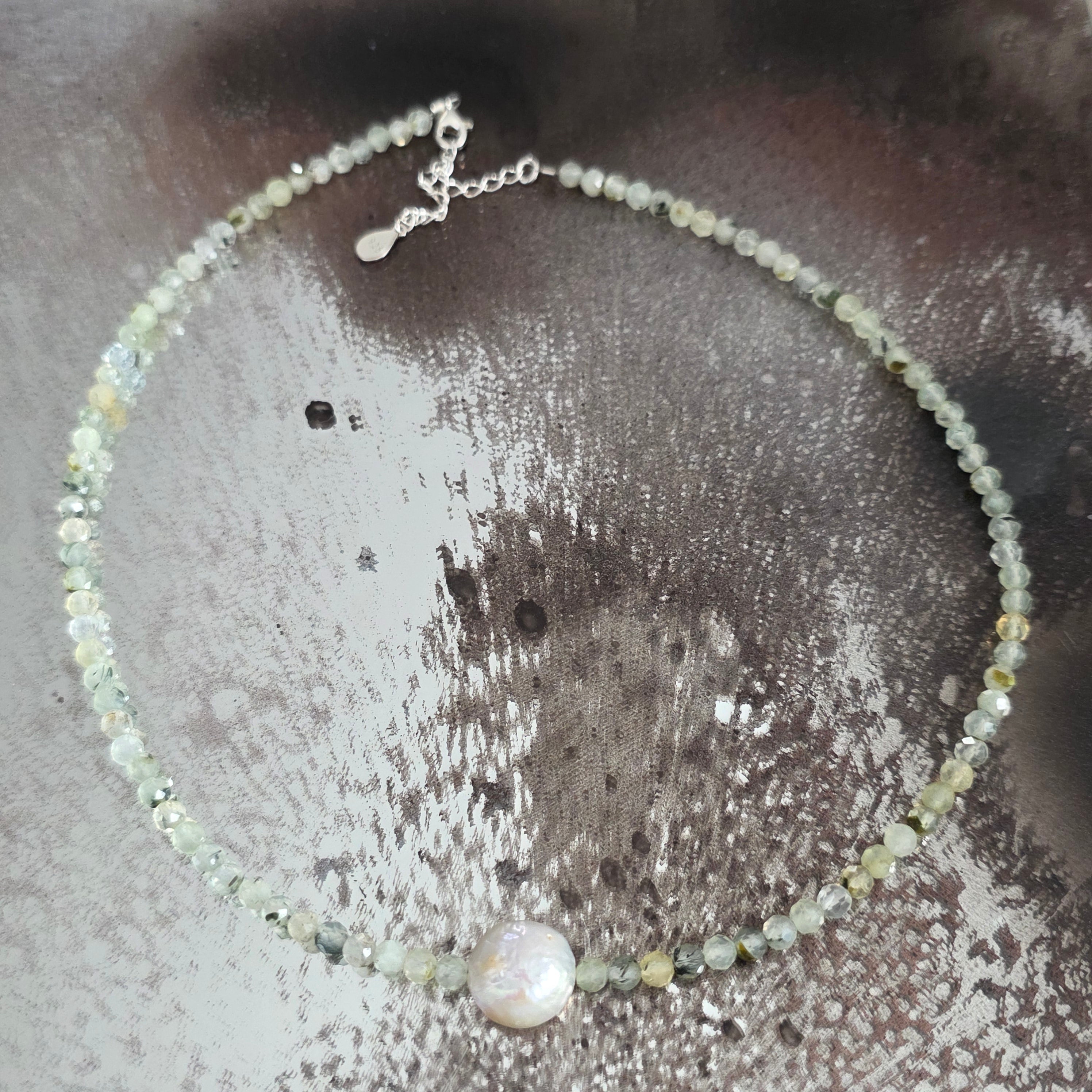 Perła uzupełnia tę energię swoim pradawnym symbolem czystości, kobiecości i mądrości zdobytej przez doświadczenie. Razem, prehnit i perła tworzą subtelną biżuterię, która opowiada o równowadze, łagodności i naturalnej elegancji.