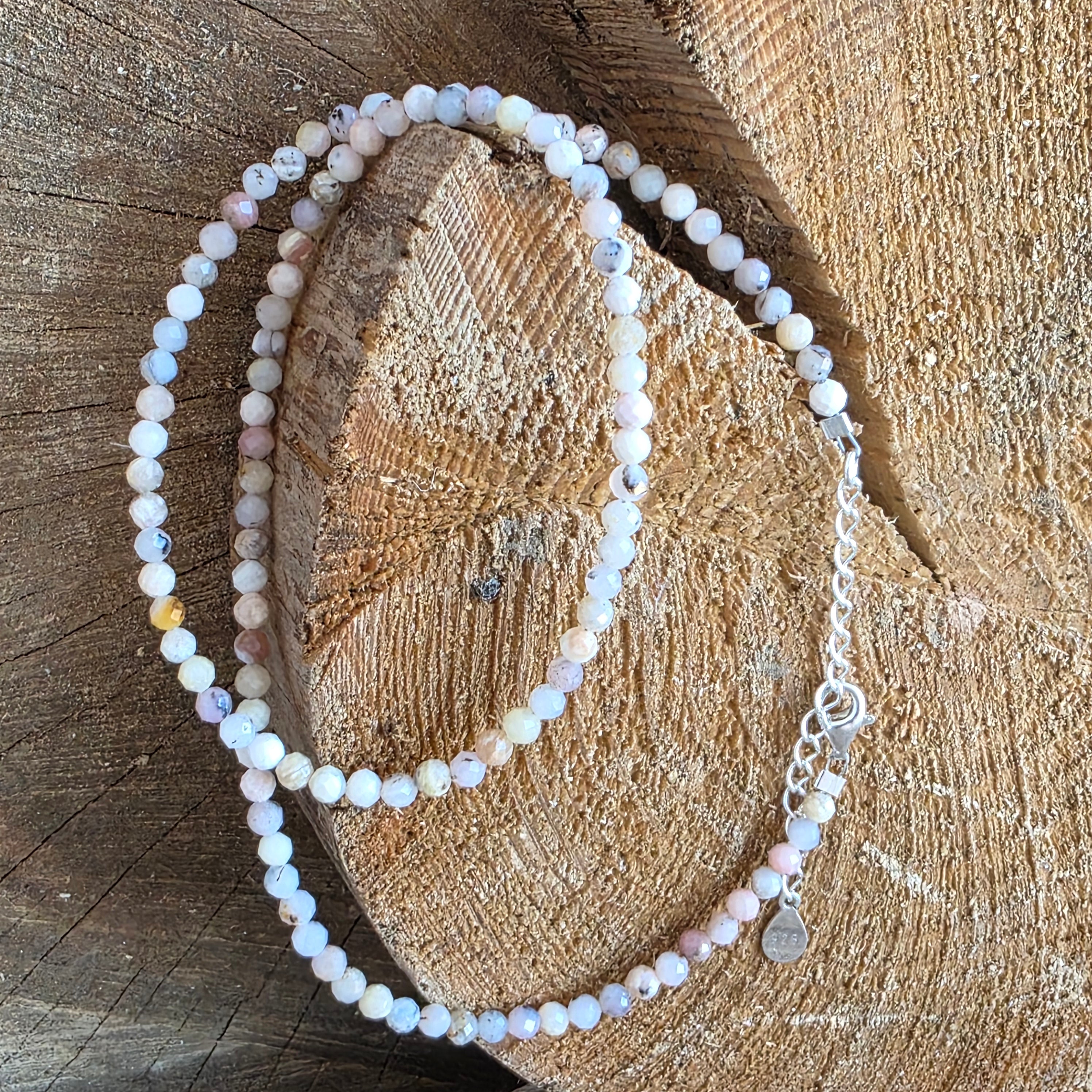 Delikatny i świetlisty naszyjnik wykonany z fasetowanych koralików różowego opalu o średnicy 3 mm, które tworzą subtelną i harmonijną linię wokół szyi. Łagodne odcienie mlecznego różu, z dyskretnymi refleksami i lekko przezroczystą fakturą, nadają biżuterii ciepły i wyrafinowany charakter. Subtelne fasetowanie dodaje głębi i łagodnego blasku, nie dominując, zachowując elegancką równowagę wizualną.