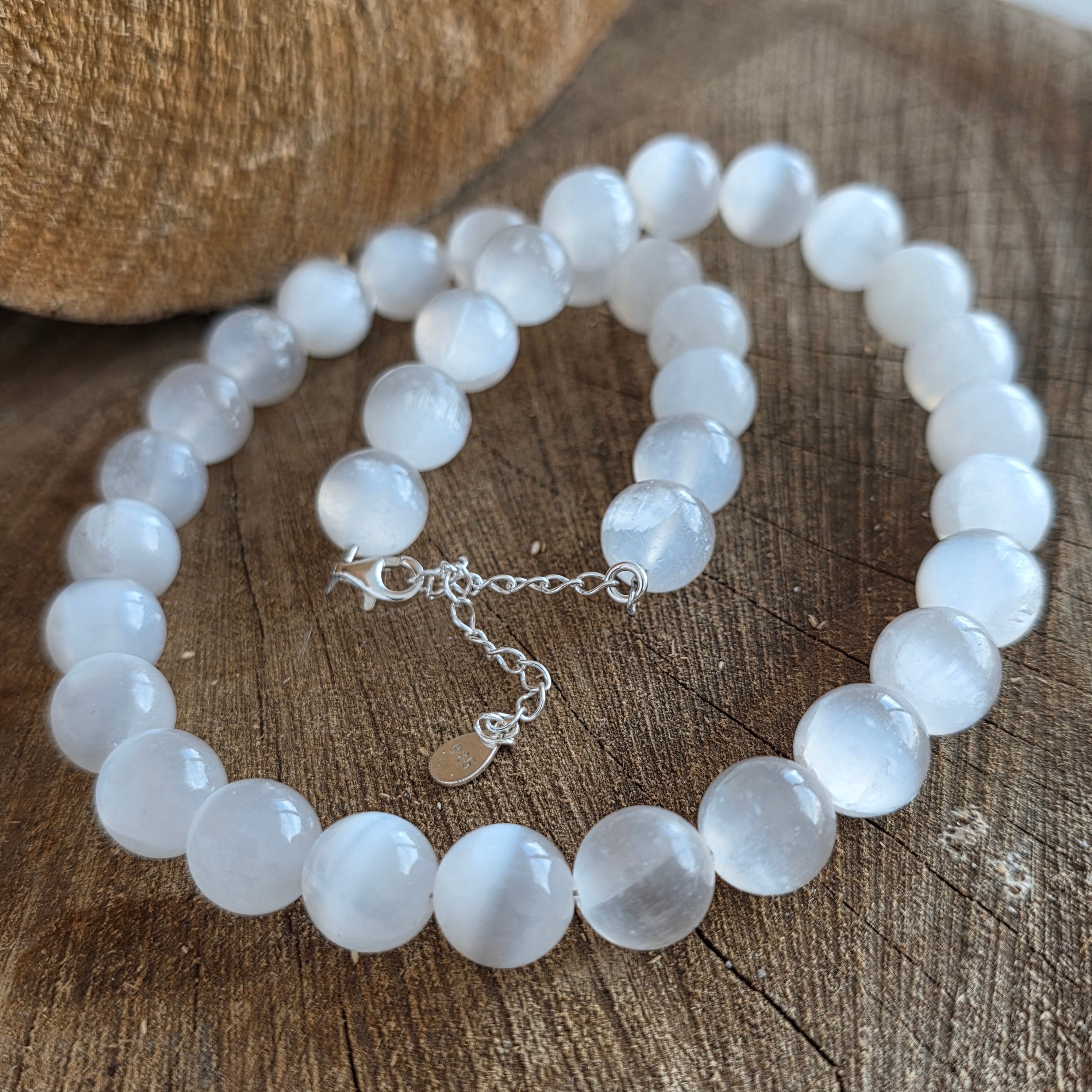 Naszyjnik jak promień schodzący w materię – wykonany z doskonale kulistych kulek naturalnego selenitu o średnicy 10 mm, z każdą z nich niosącą w sobie przejrzystość białego i cichego poranka. Aksamitna i przezroczysta powierzchnia odbija światło z niemal nierealną łagodnością, jakby oddychała spokojem.